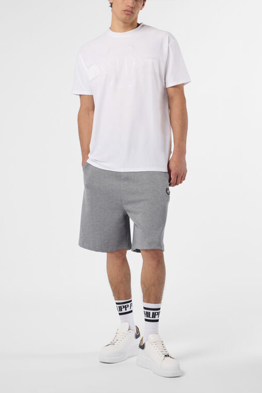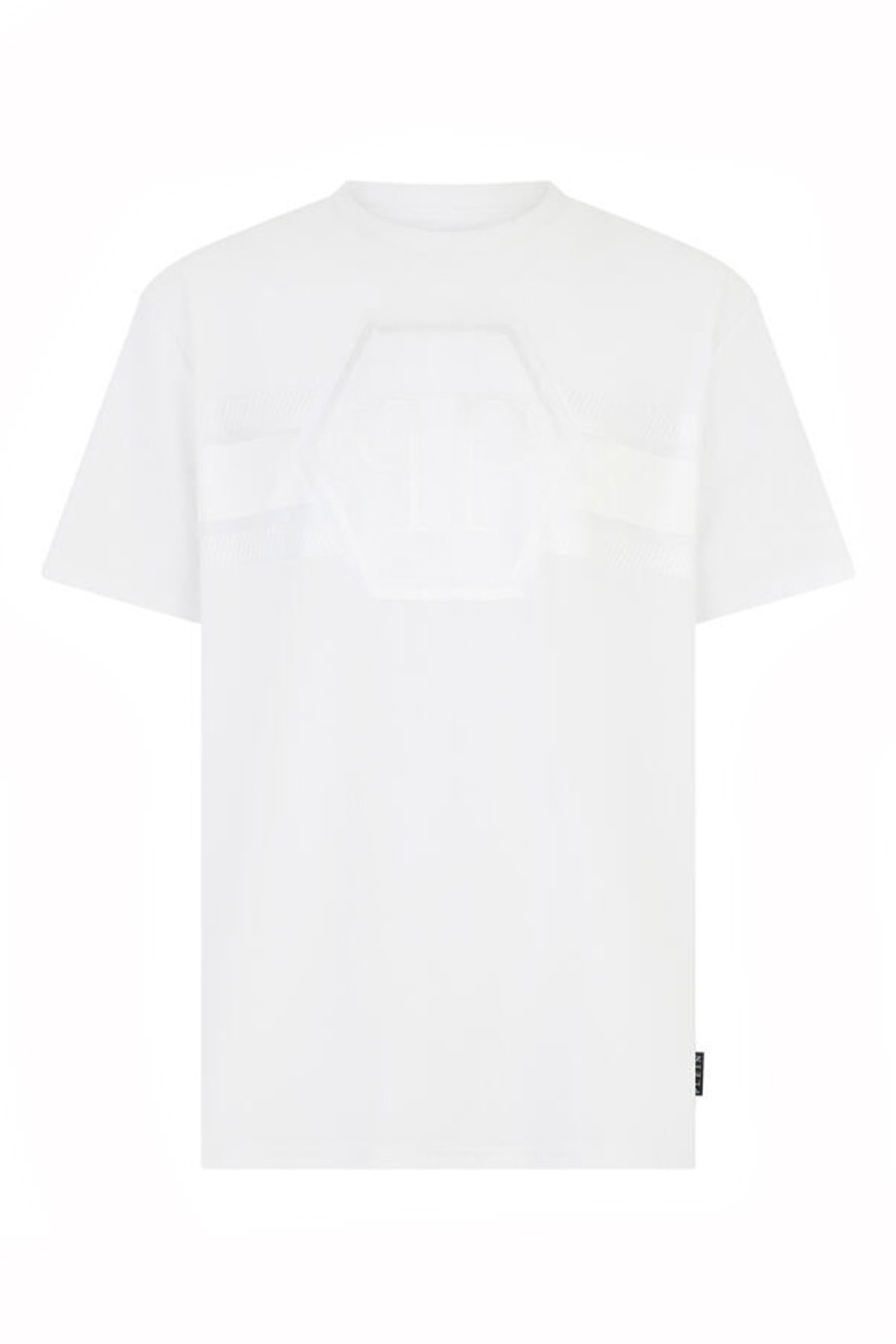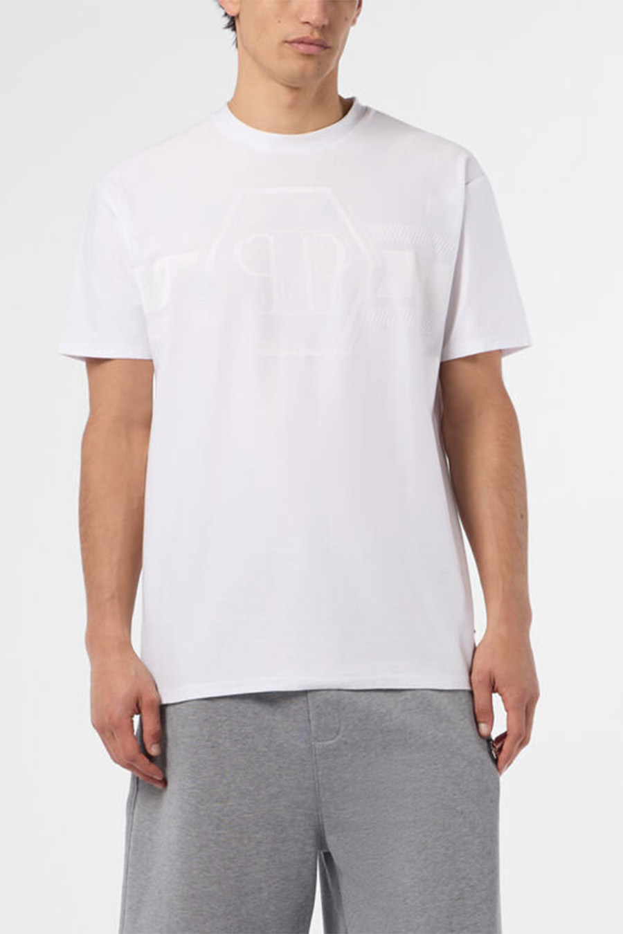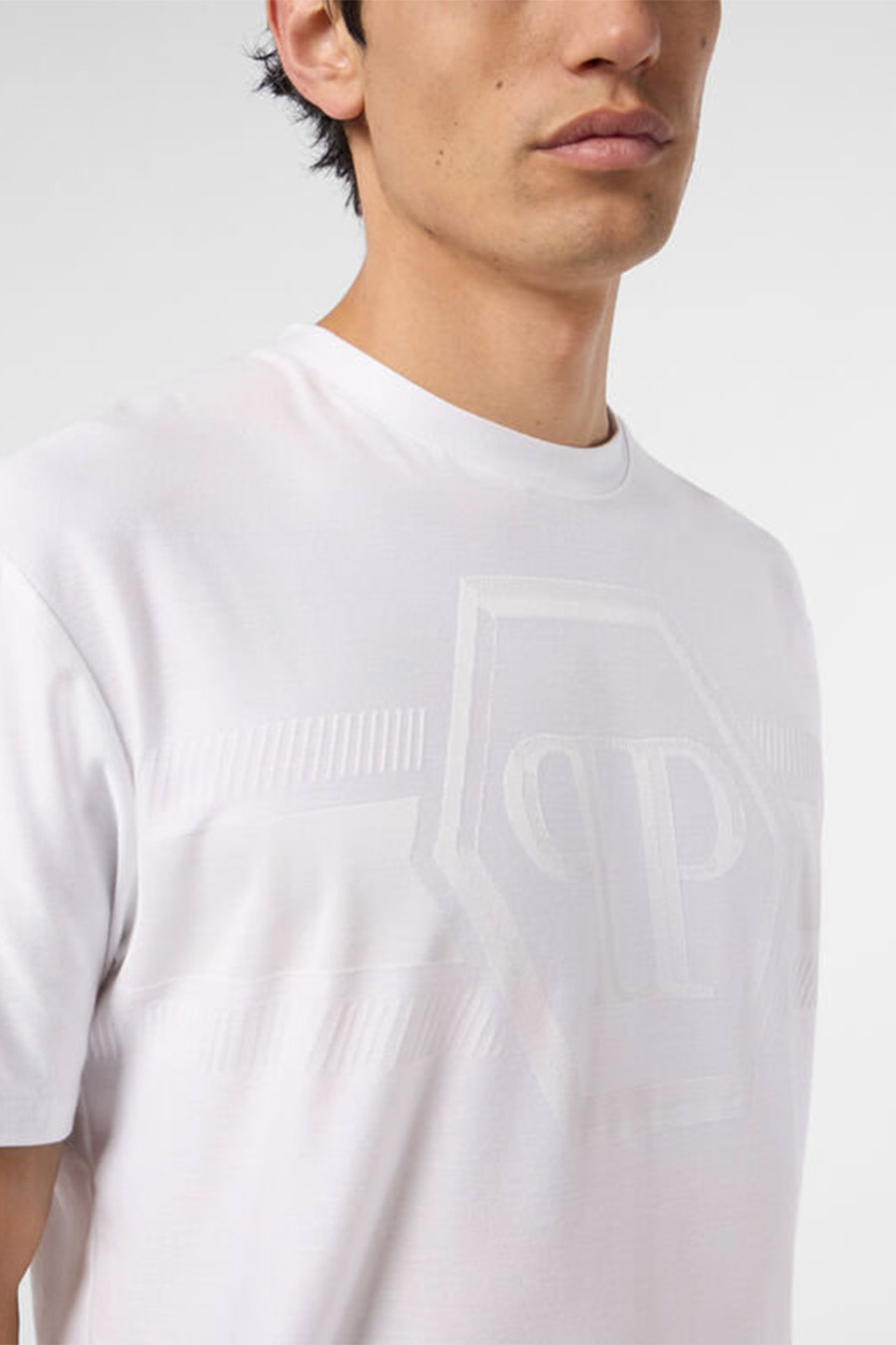 Philipp Plein hexagonal Jacquard crew neck T-shirt in cotton blend jersey fabric, tone-on-tone Jacquard pattern on the front, logo patch sewn onto the yoke, ribbed crew neck, double-needle stitching on the edges.