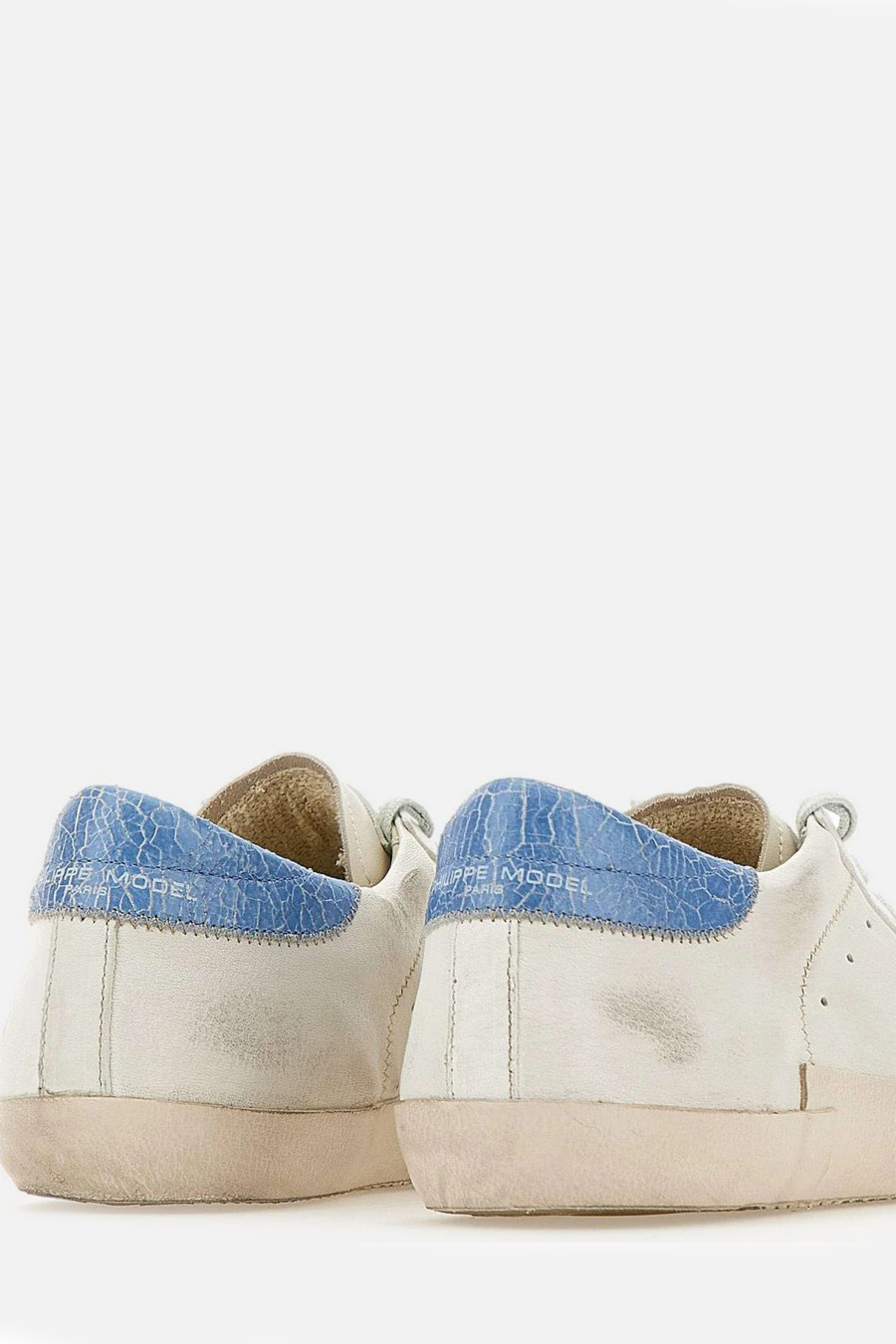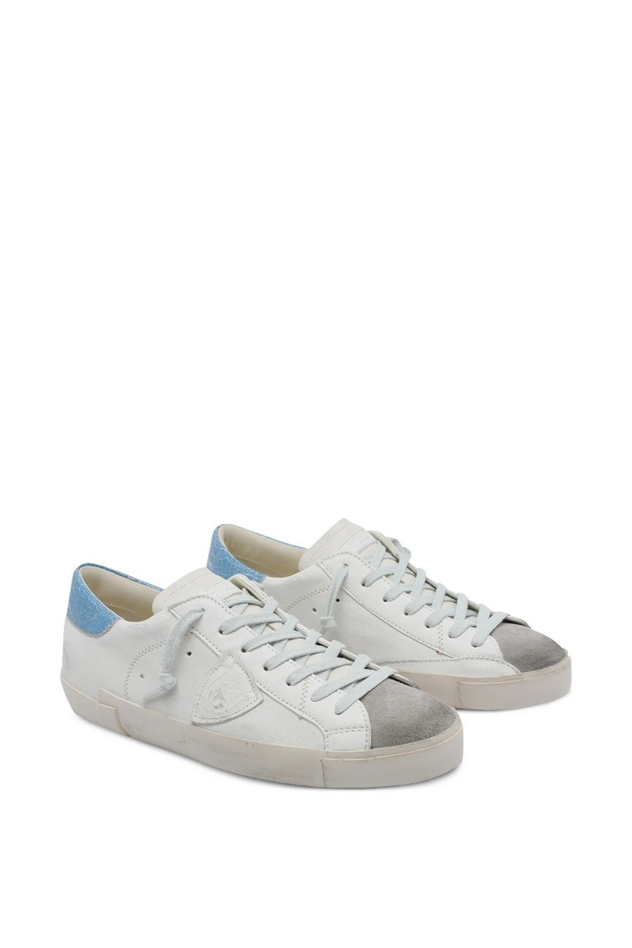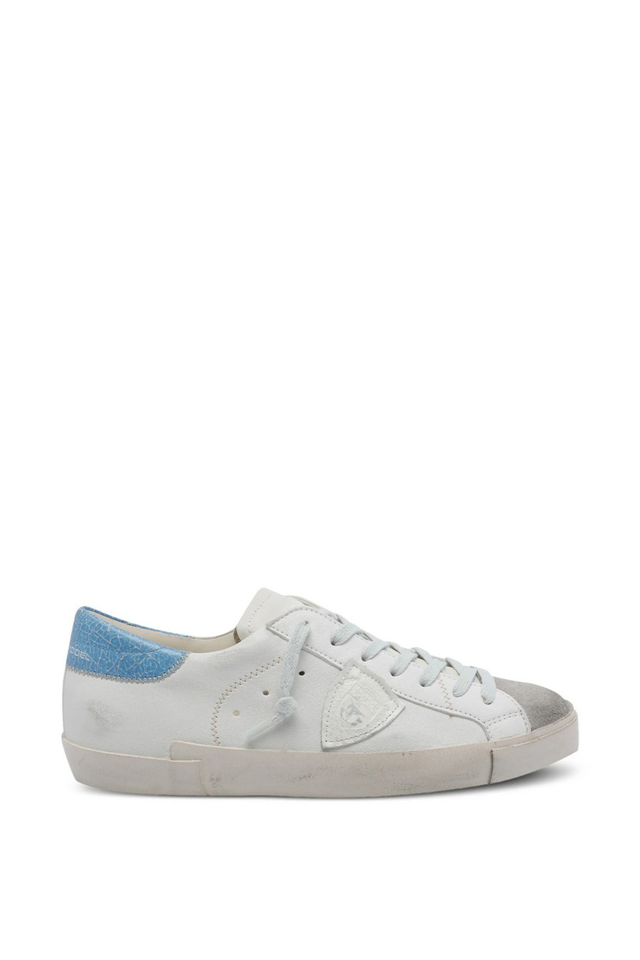 Philippe Model Paris ‘Prsx’ trainers with white leather upper with a distressed effect, contrasting with the light blue aged leather heel counter with a crackled effect that adds a pop touch.