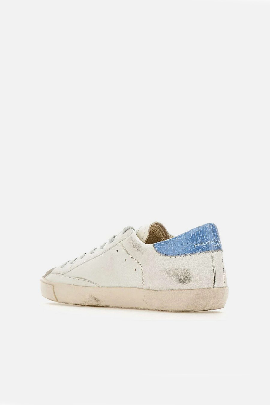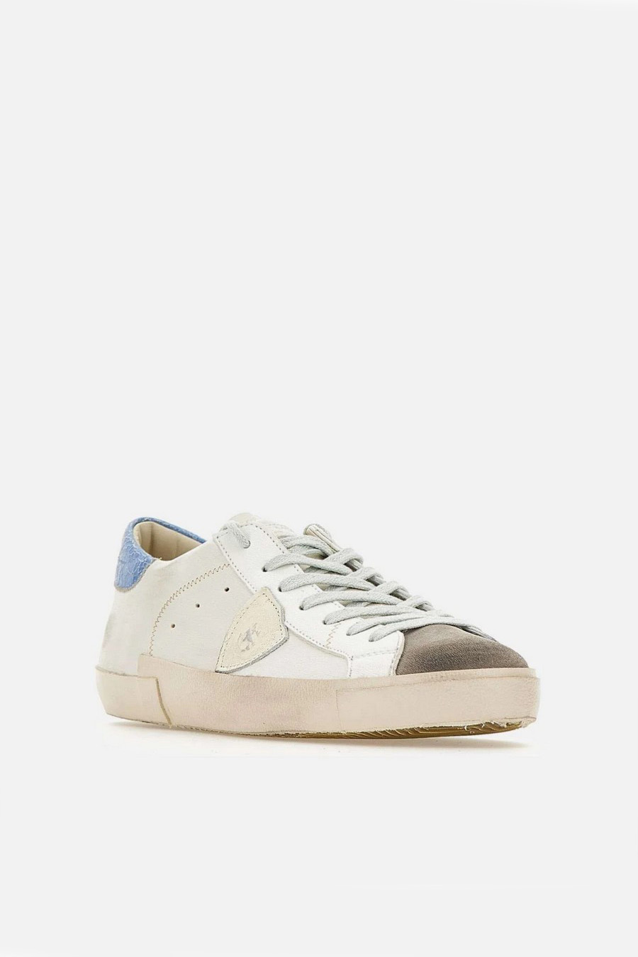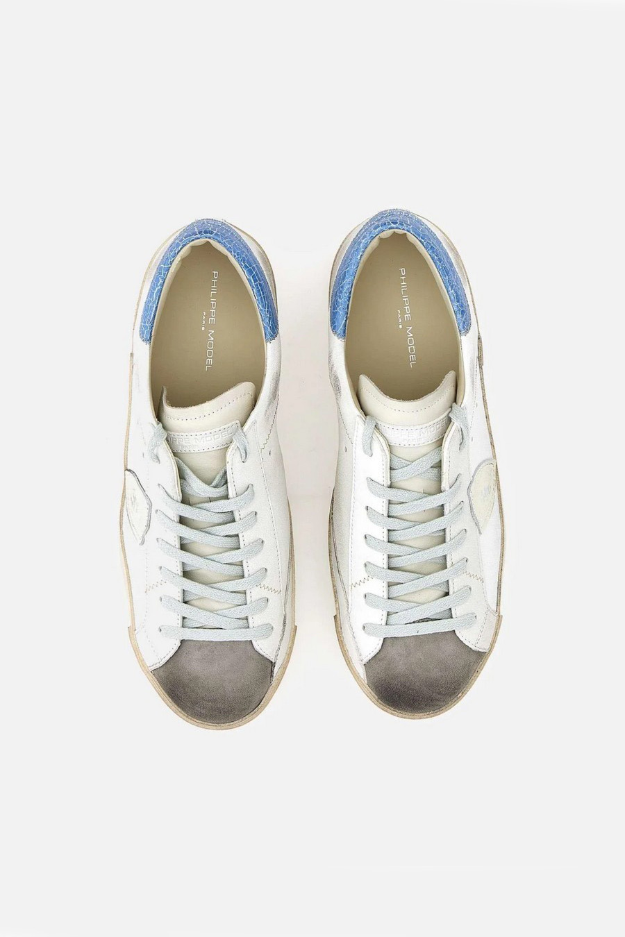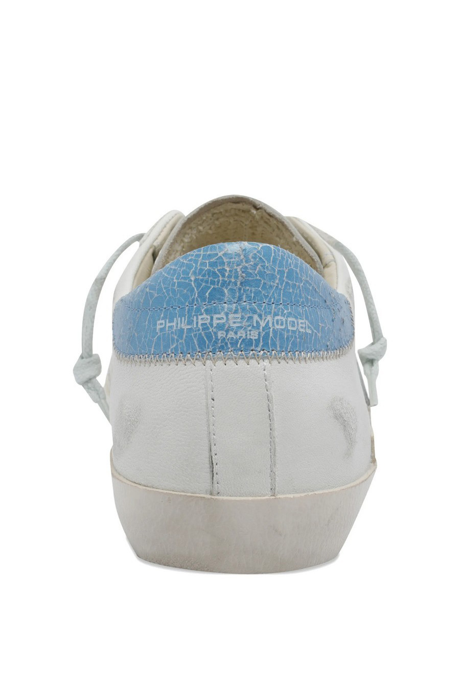 Philippe Model Paris ‘Prsx’ trainers with white leather upper with a distressed effect, contrasting with the light blue aged leather heel counter with a crackled effect that adds a pop touch.