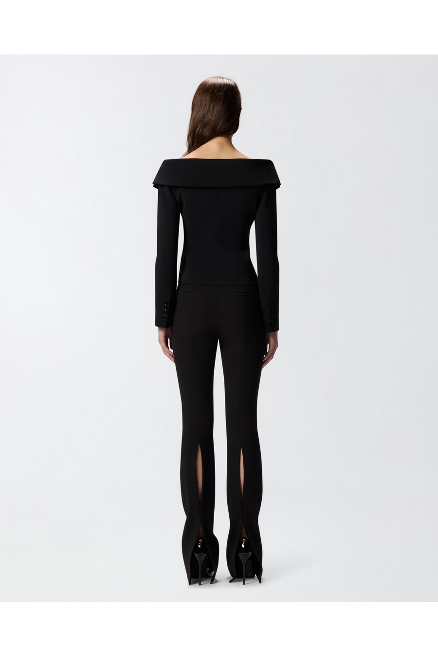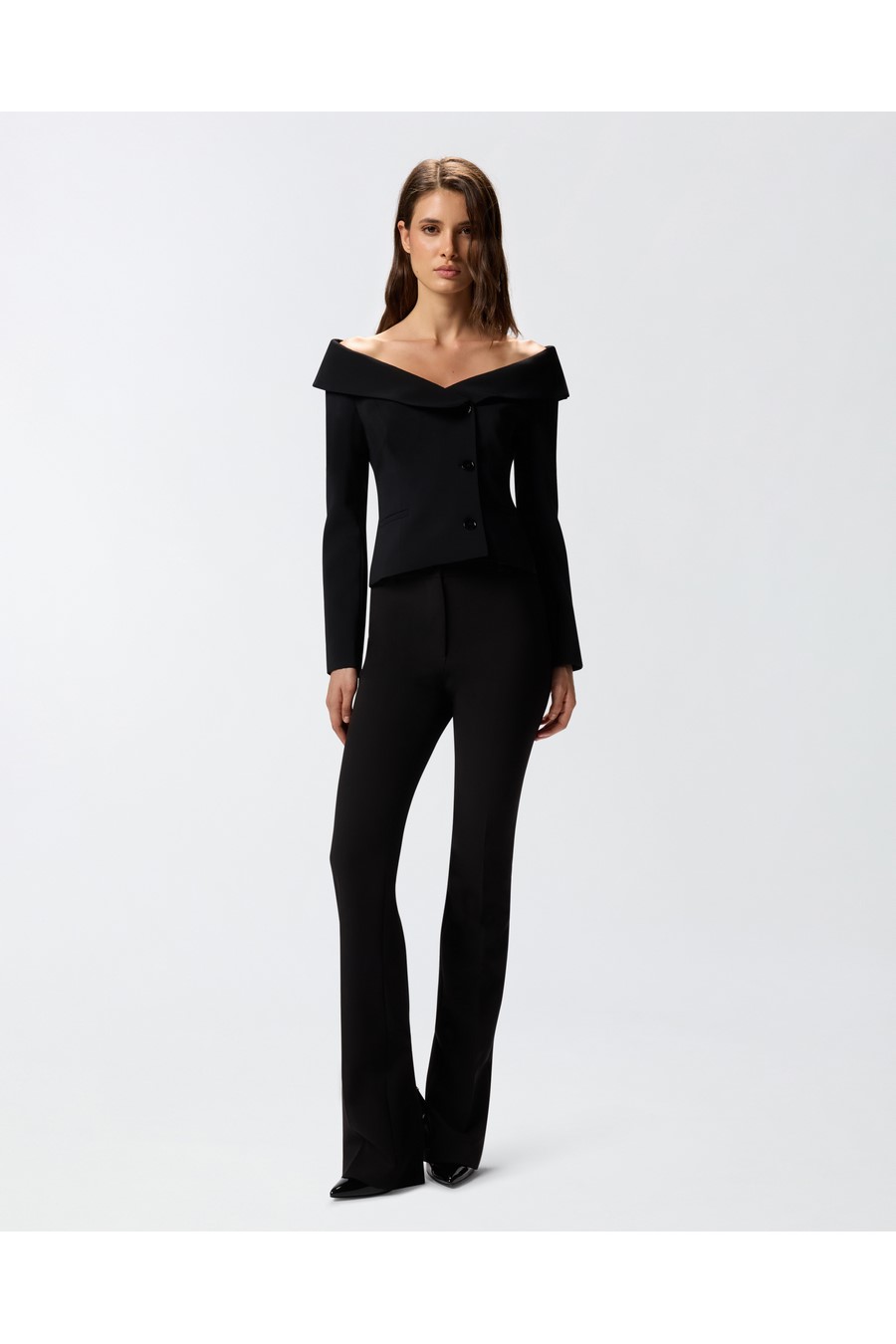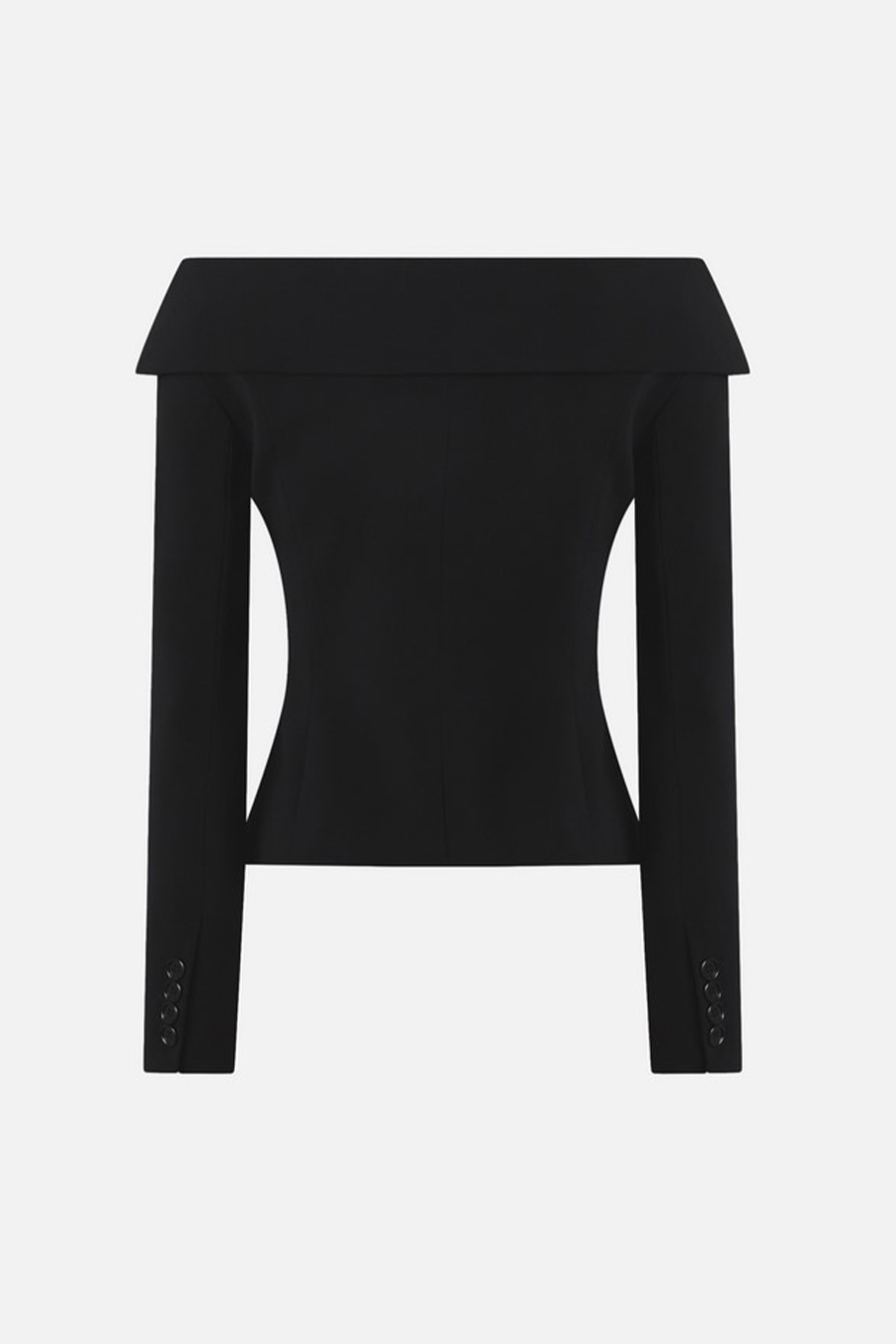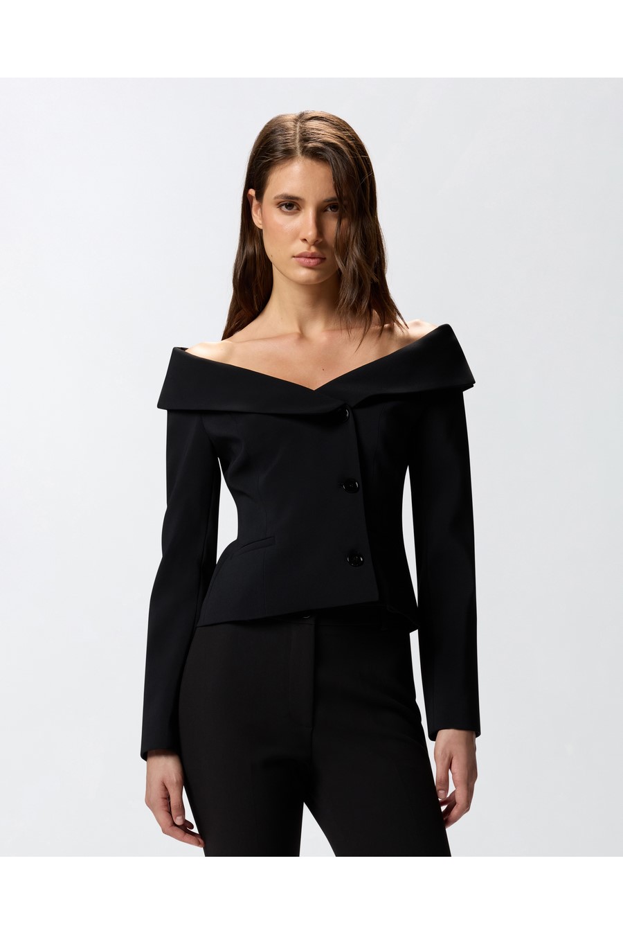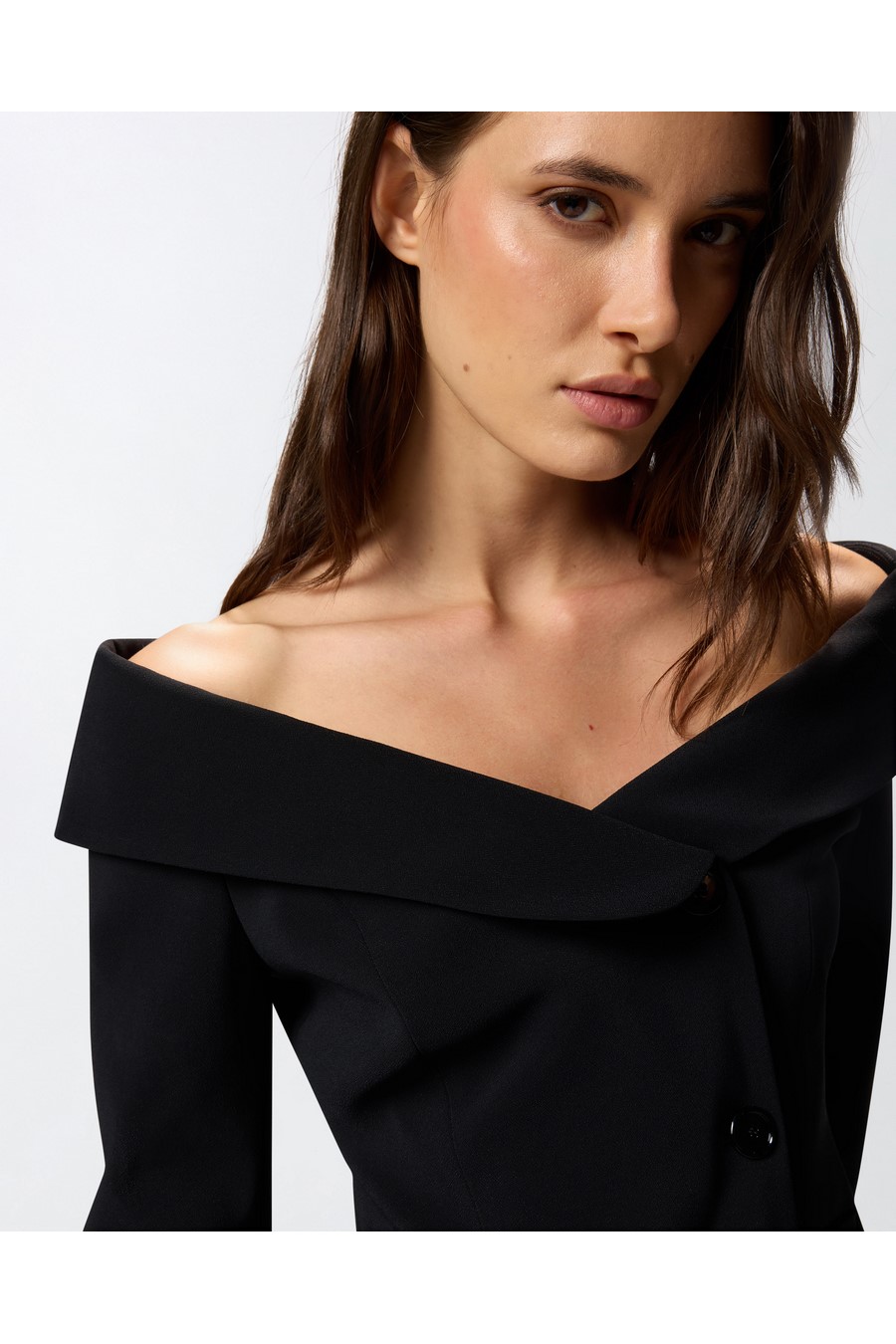 Pinko fitted, long-sleeved off-the-shoulder jacket in stretch crepe fabric with off-center buttoning, buttoned cuffs and side welt pockets, and a wide neckline that leaves the shoulders bare.