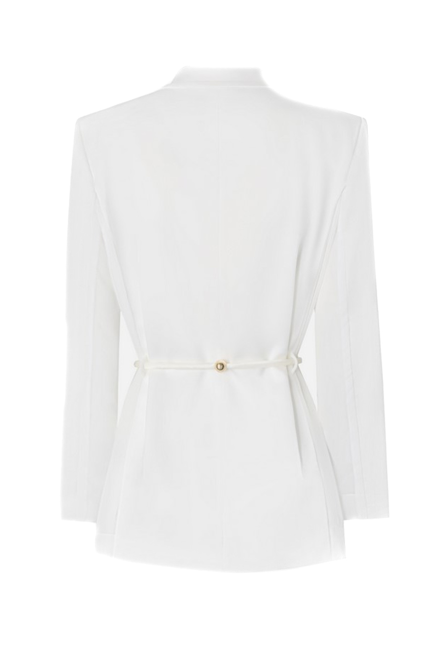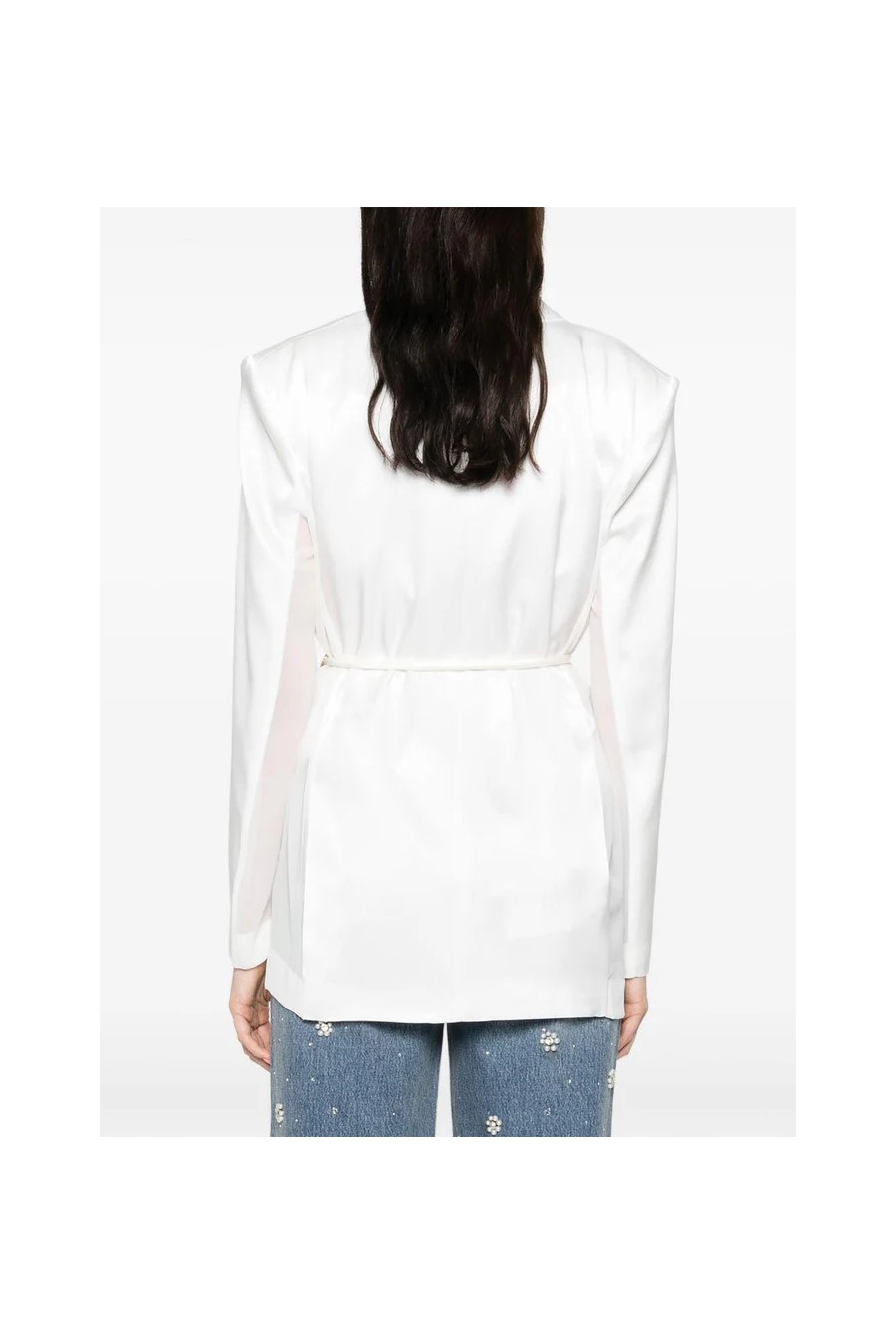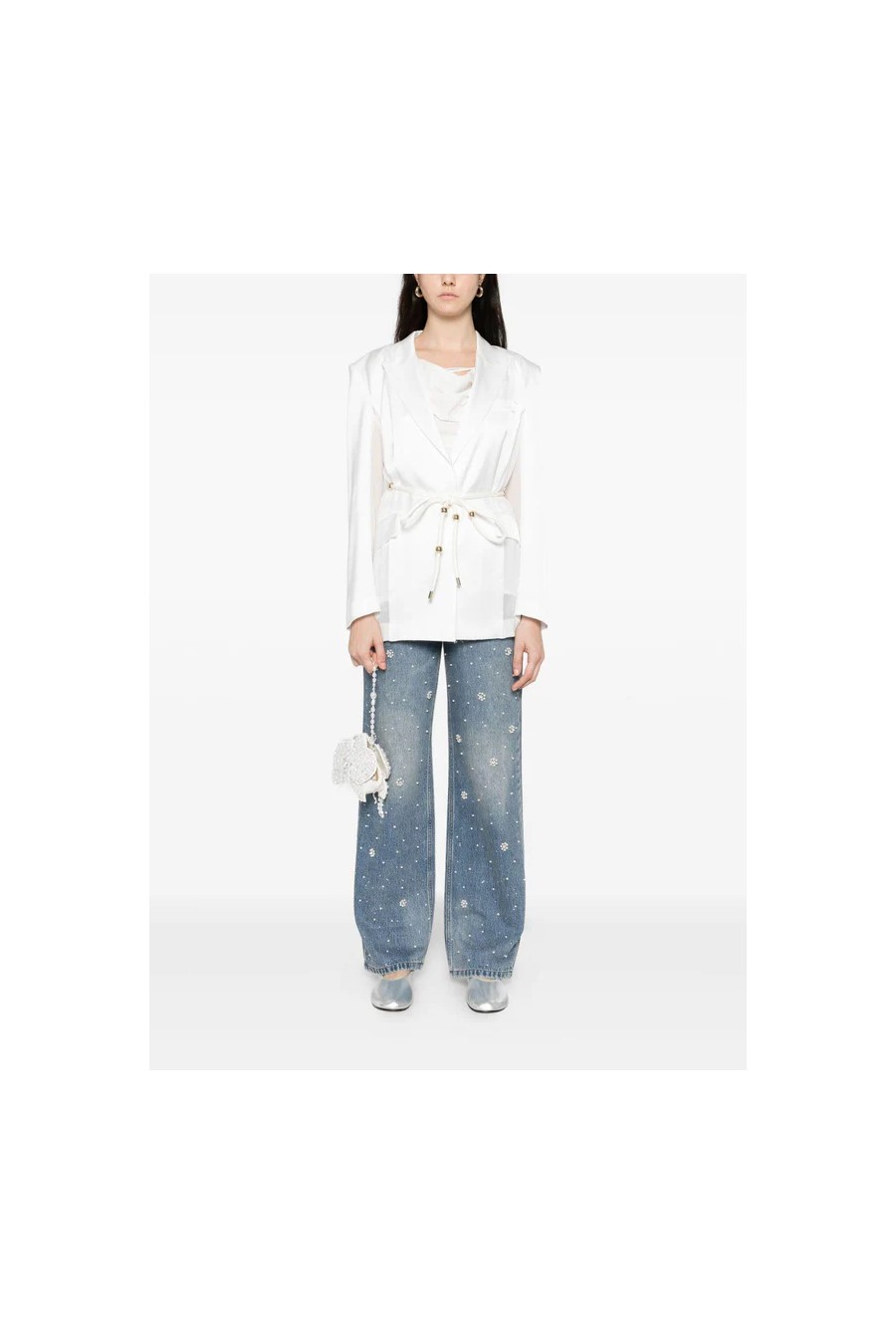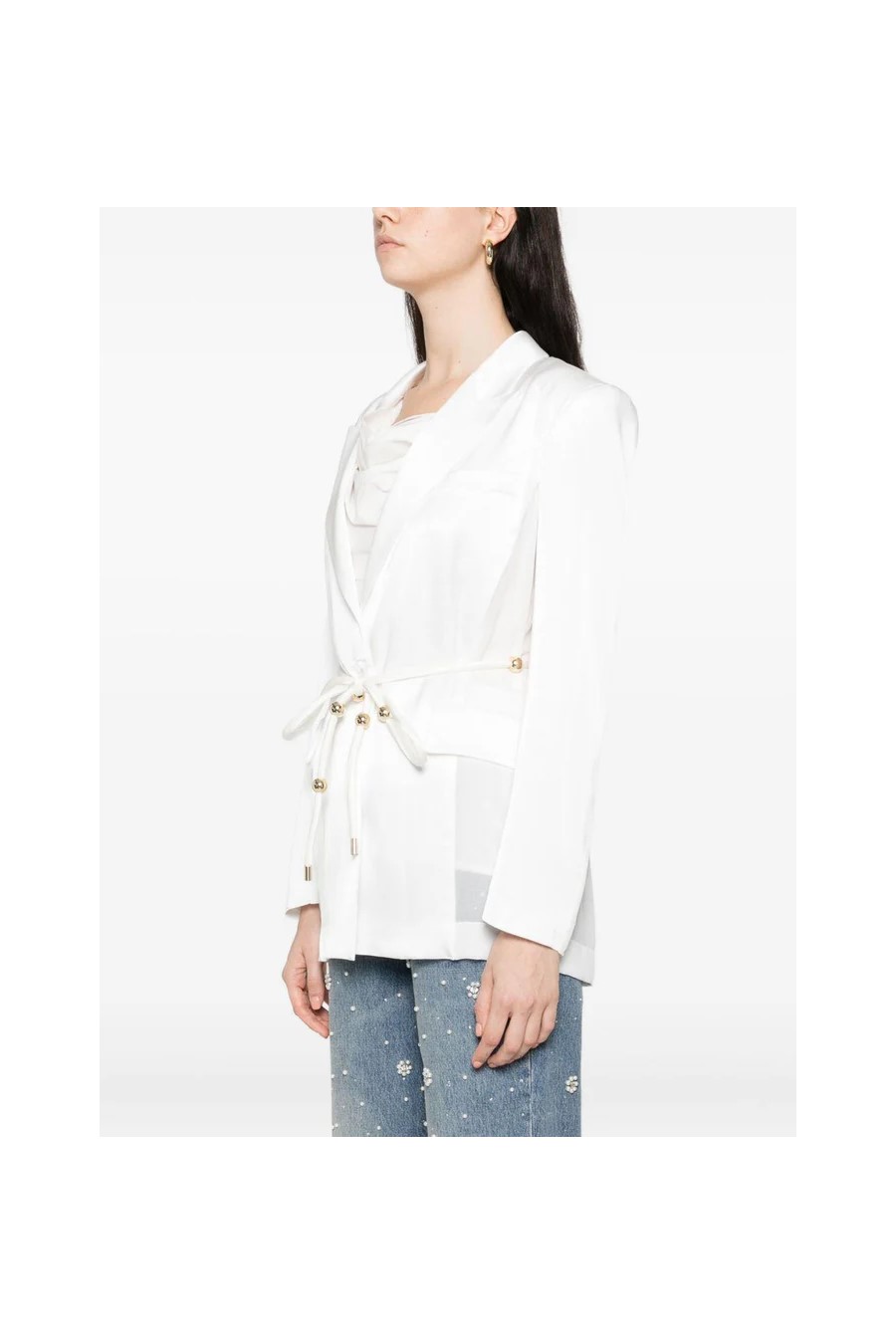 Pinko shiny satin blazer with belt and boules at the waist, featuring front pockets and a trekking-style belt fastening embellished with metal boules.