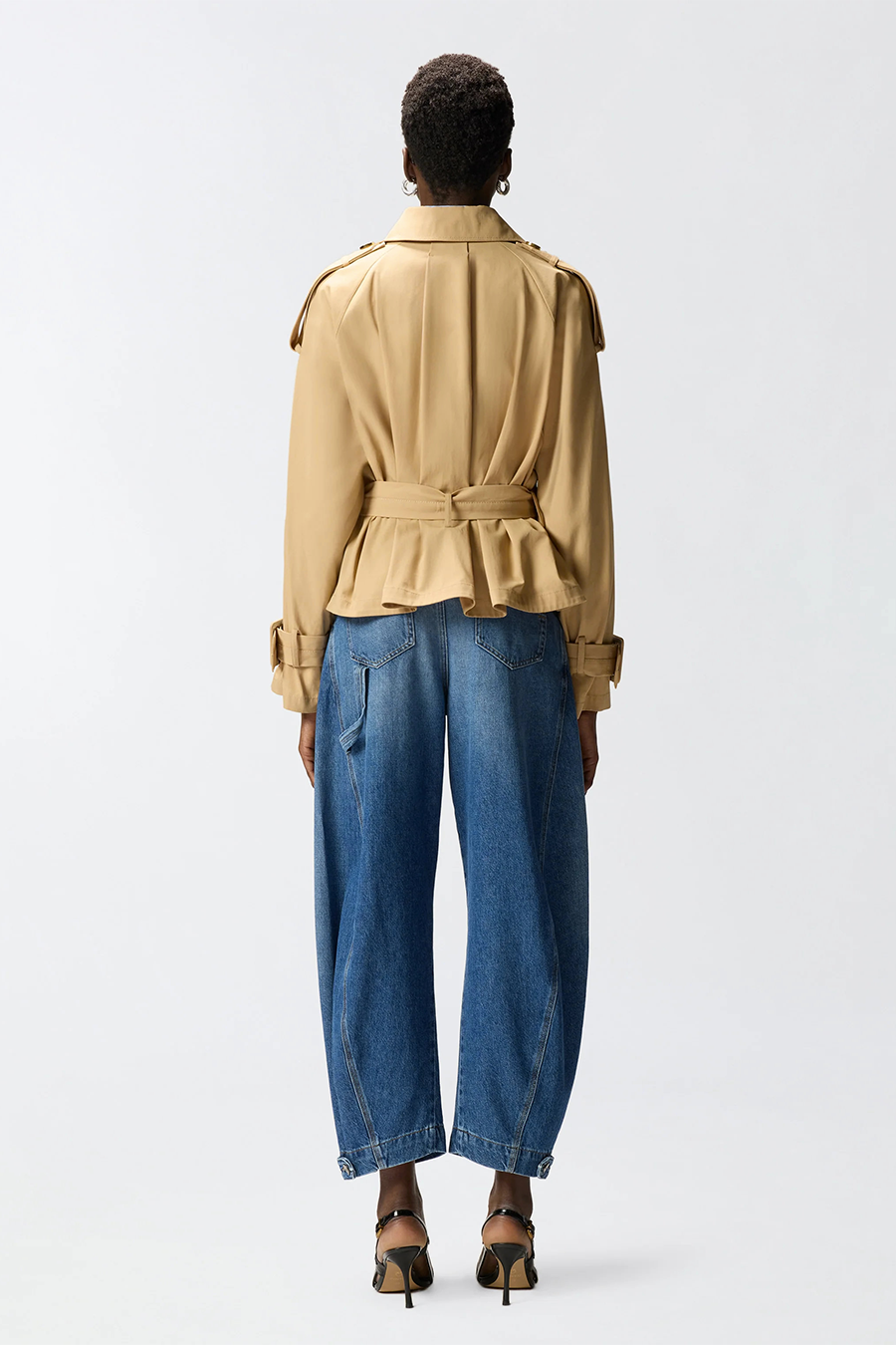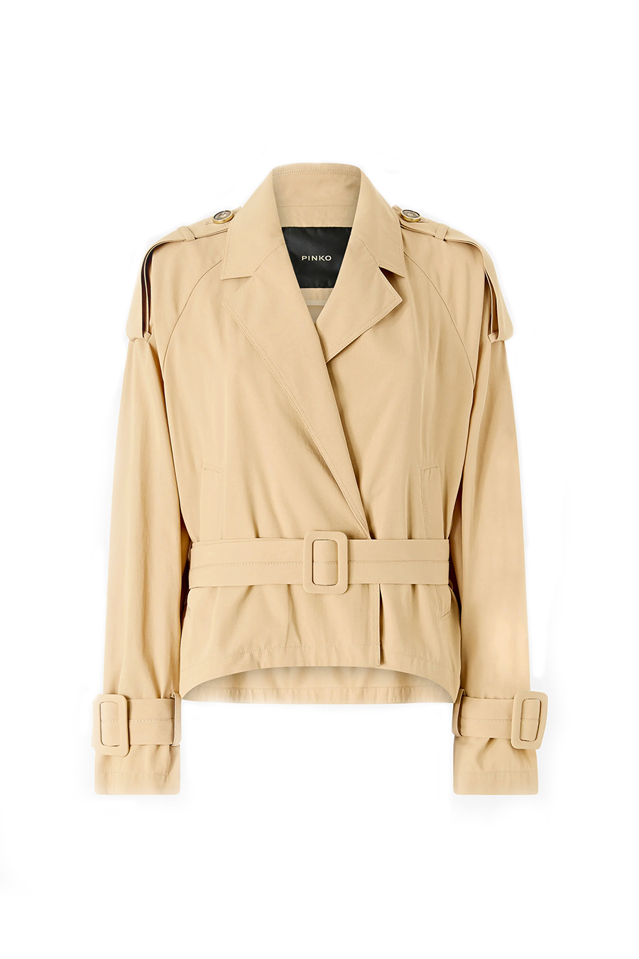 Pinko trench coat with inner lining, made from pure cotton twill with a crinkled yet fluid feel, an ideal fabric for accompanying the figure without constricting it, two side pockets, raglan sleeves with toggles at the shoulders, cuffs with straps and matching removable belt for a customisable fit.