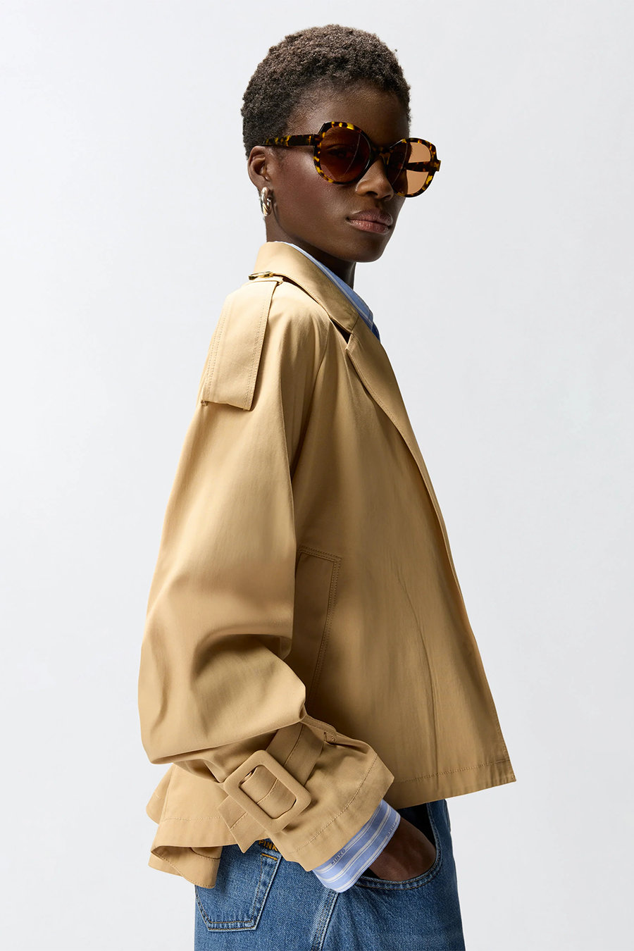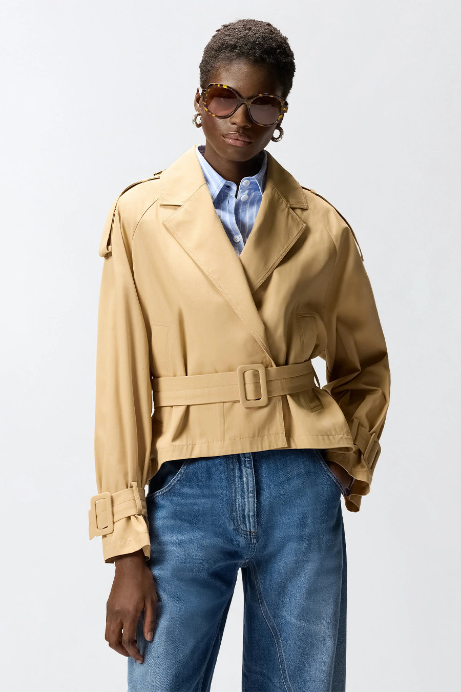 Pinko trench coat with inner lining, made from pure cotton twill with a crinkled yet fluid feel, an ideal fabric for accompanying the figure without constricting it, two side pockets, raglan sleeves with toggles at the shoulders, cuffs with straps and matching removable belt for a customisable fit.