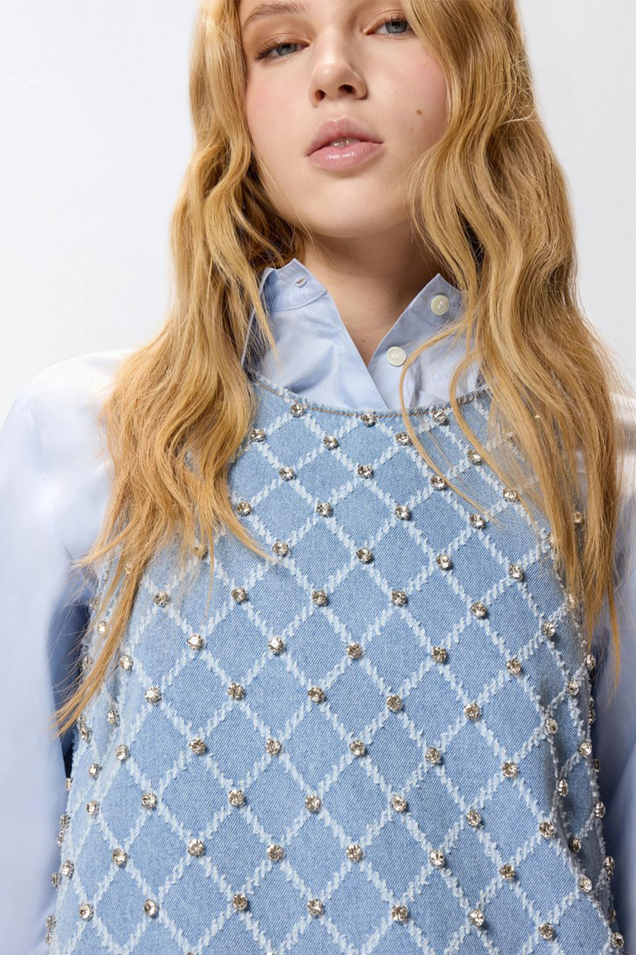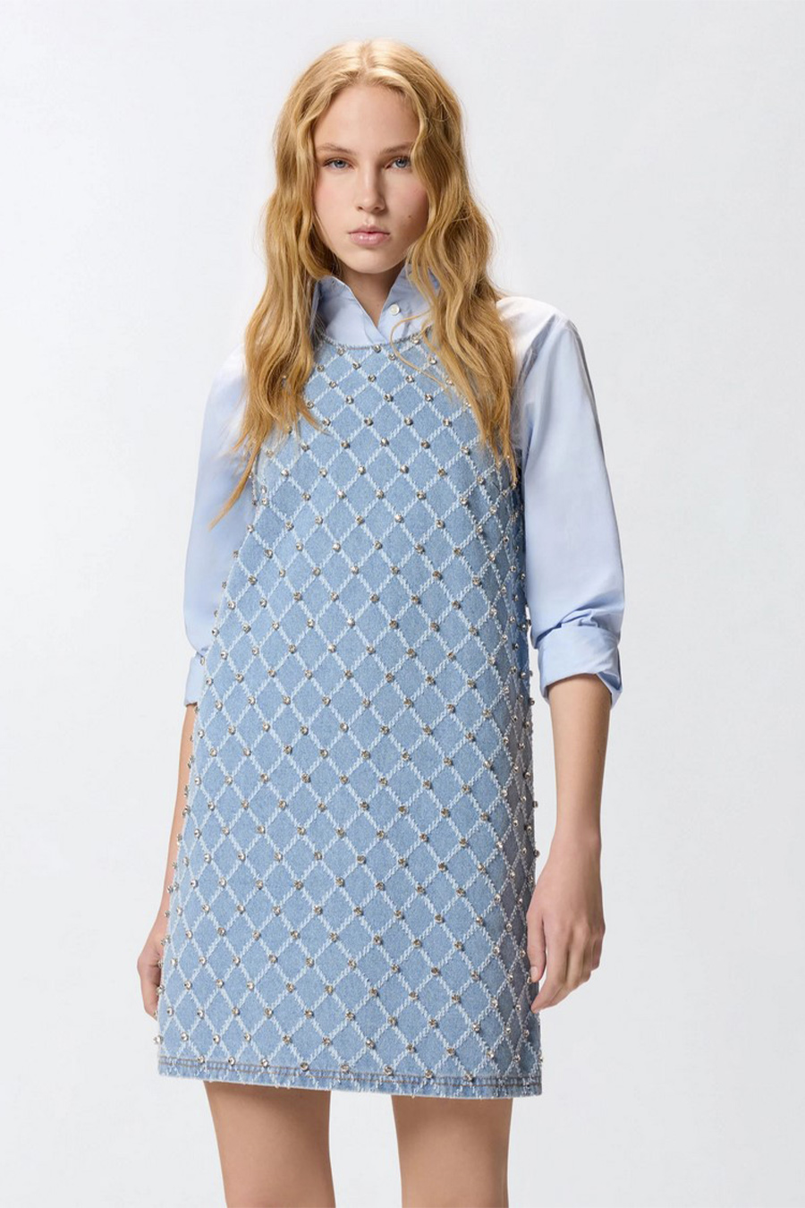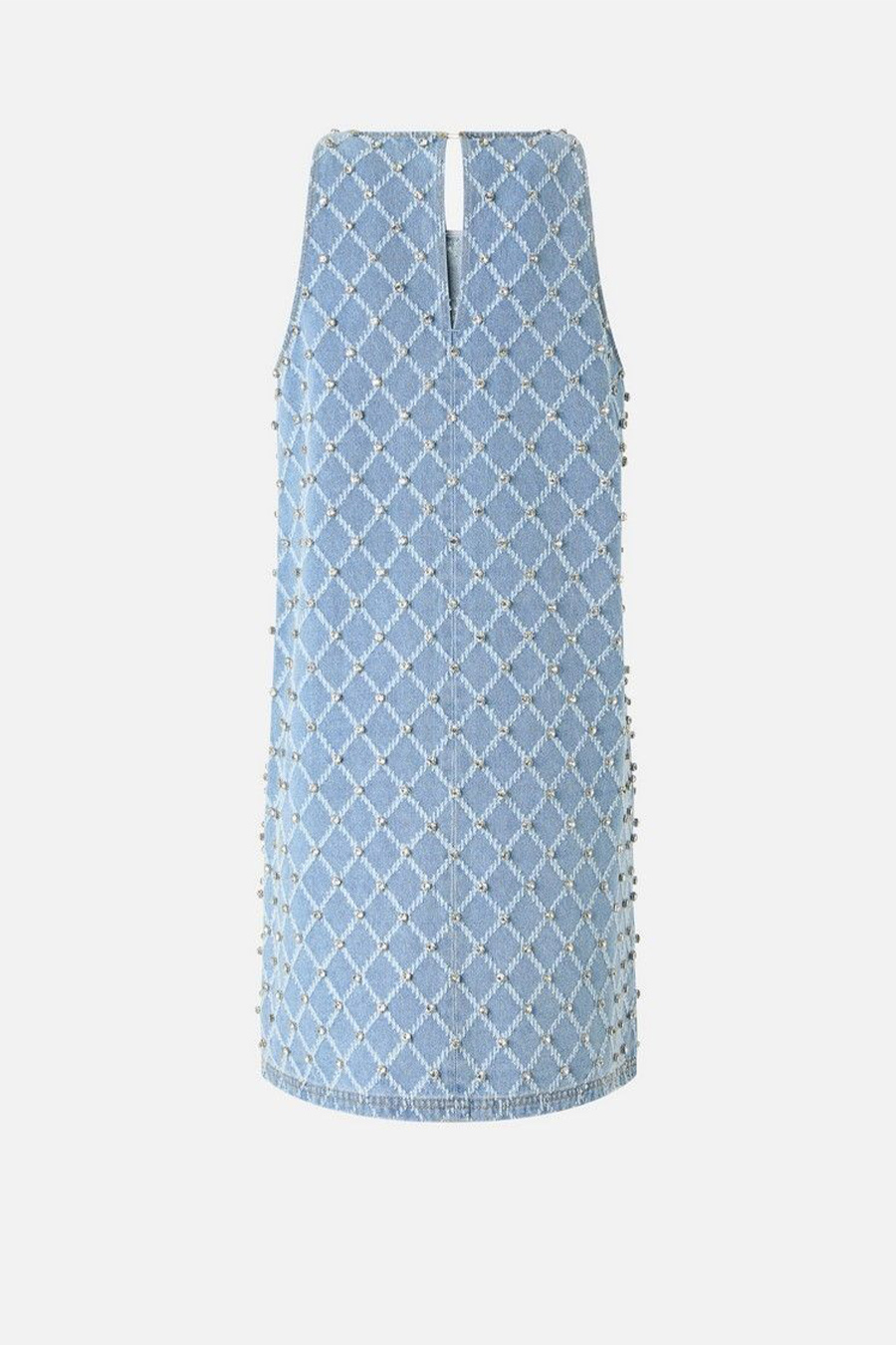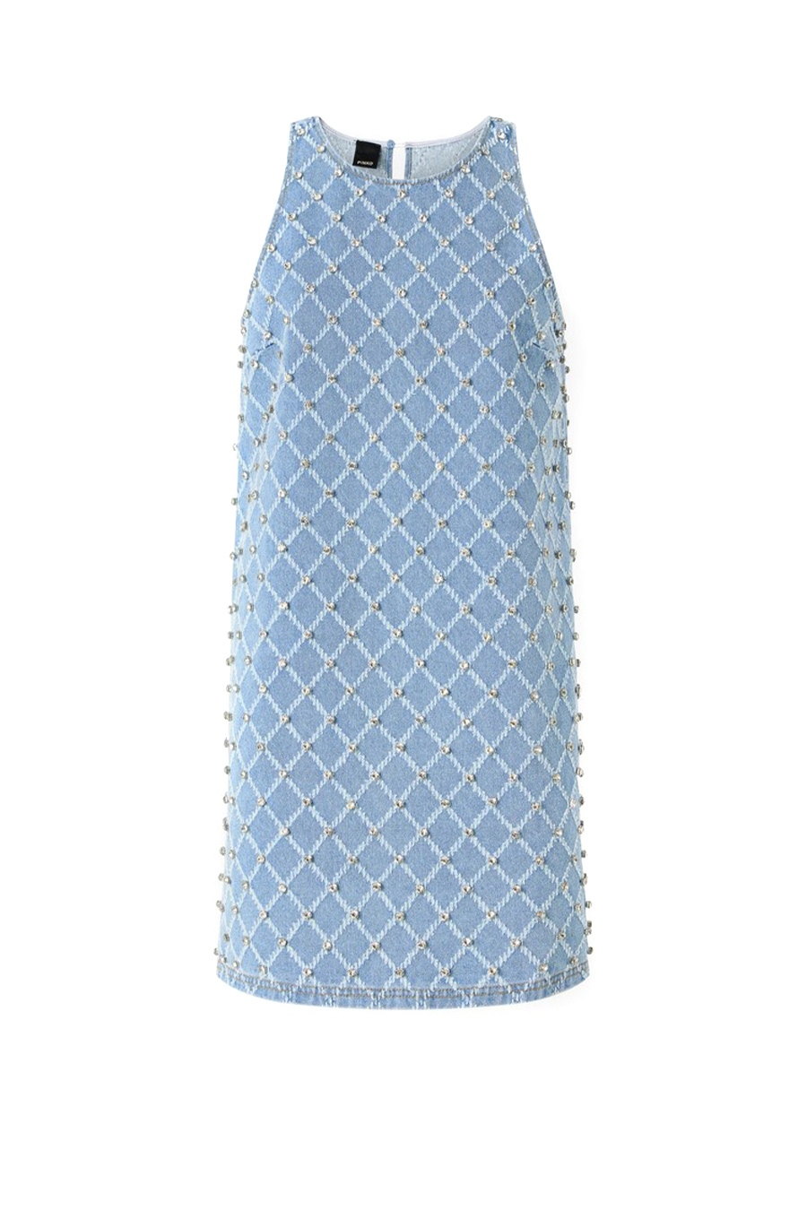 Pinko short sleeveless denim dress featuring a round neckline with a back opening, diamond pattern and embellished with bright hand-embroidered rhinestones.