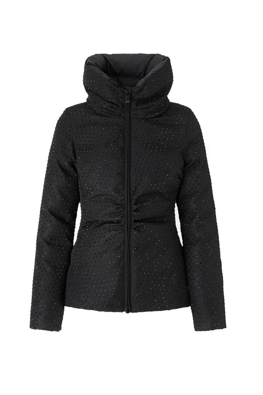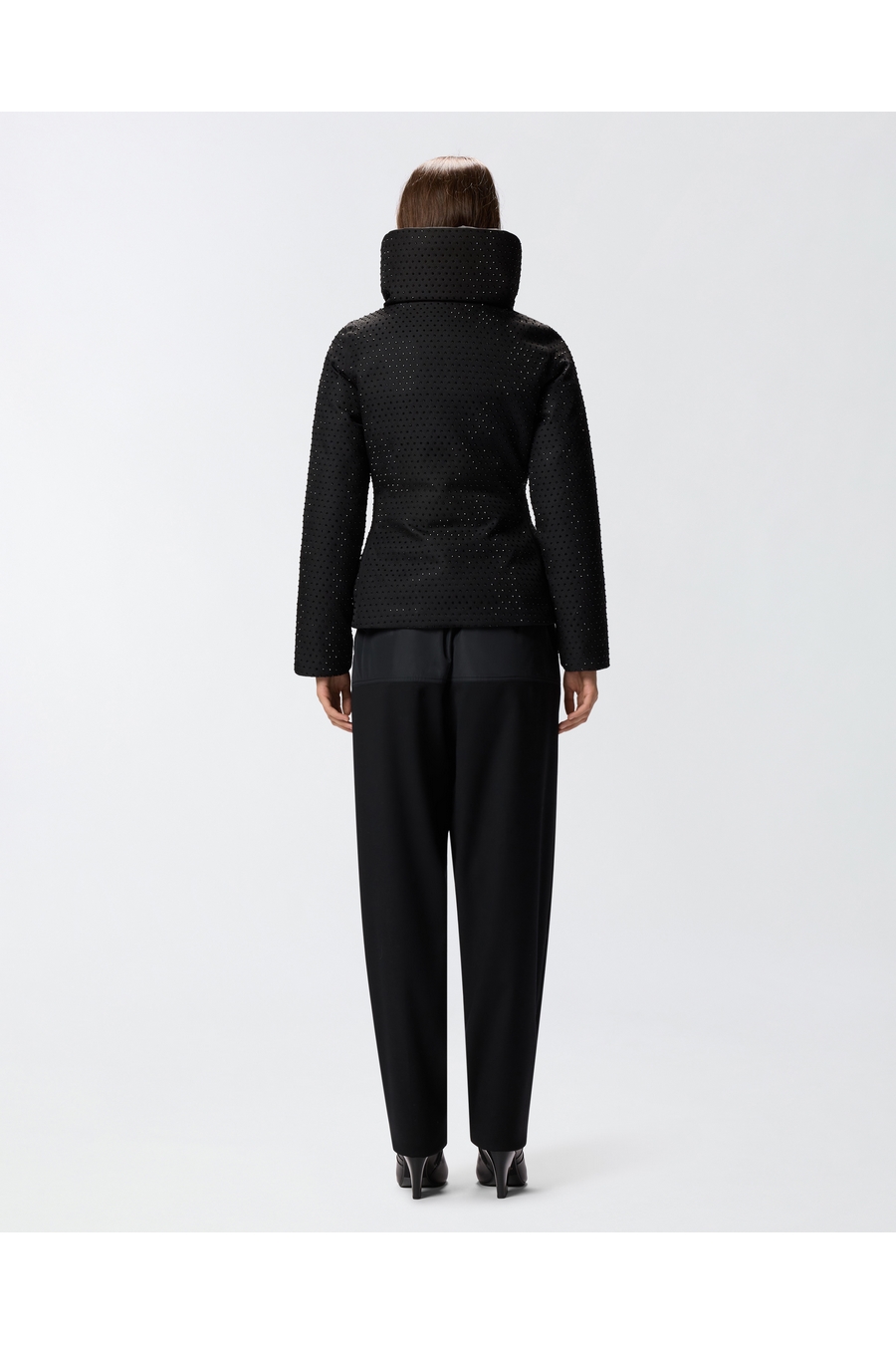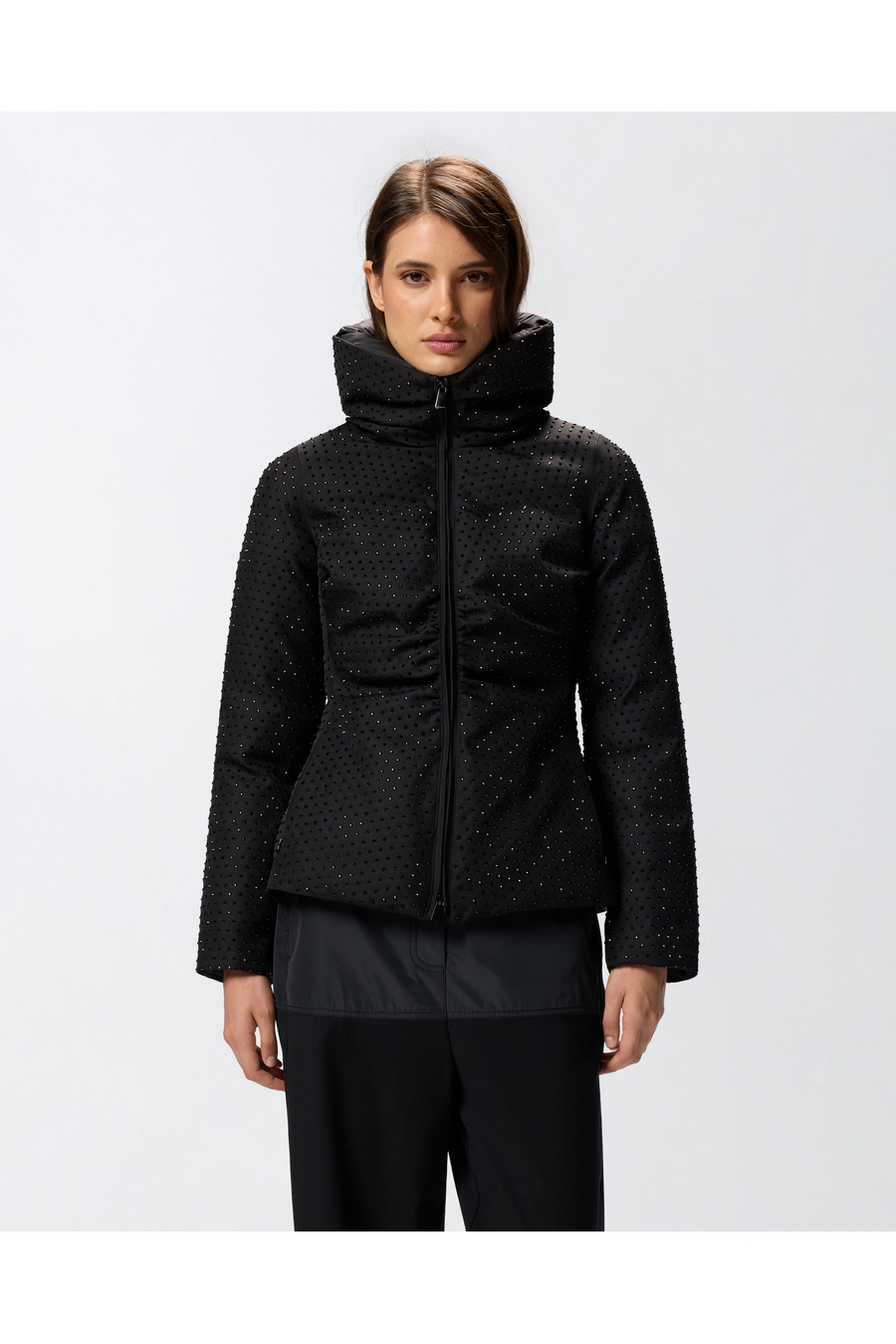 Pinko short down jacket with wraparound high collar, side pockets and full-length zip with double slider, with ruffles and mini rhinestones over the entire surface.