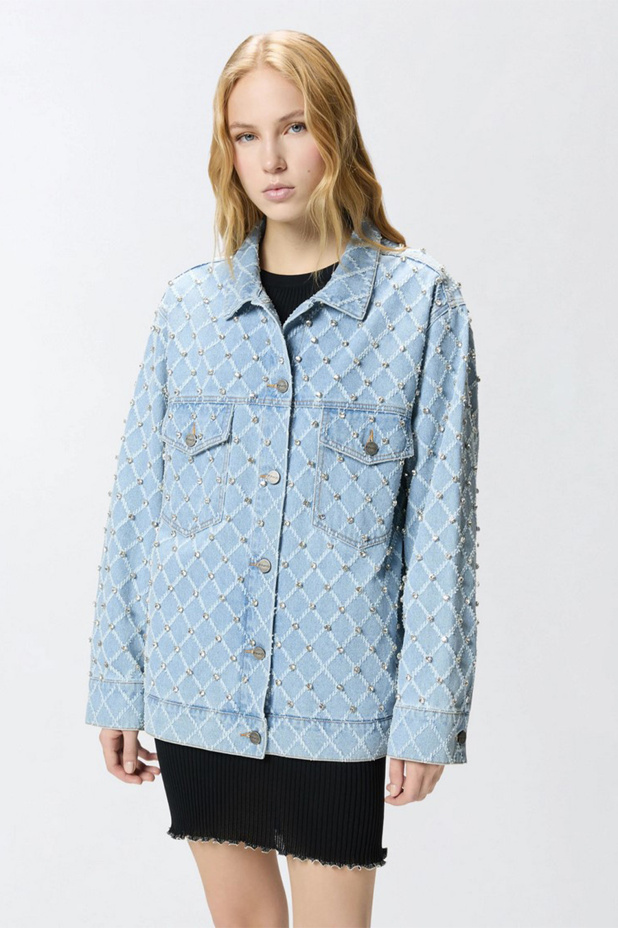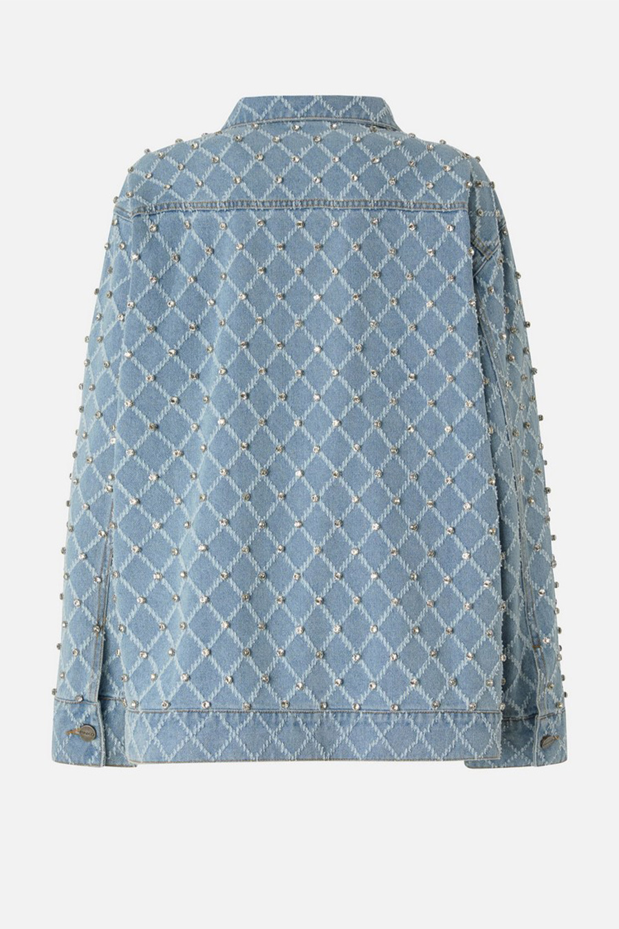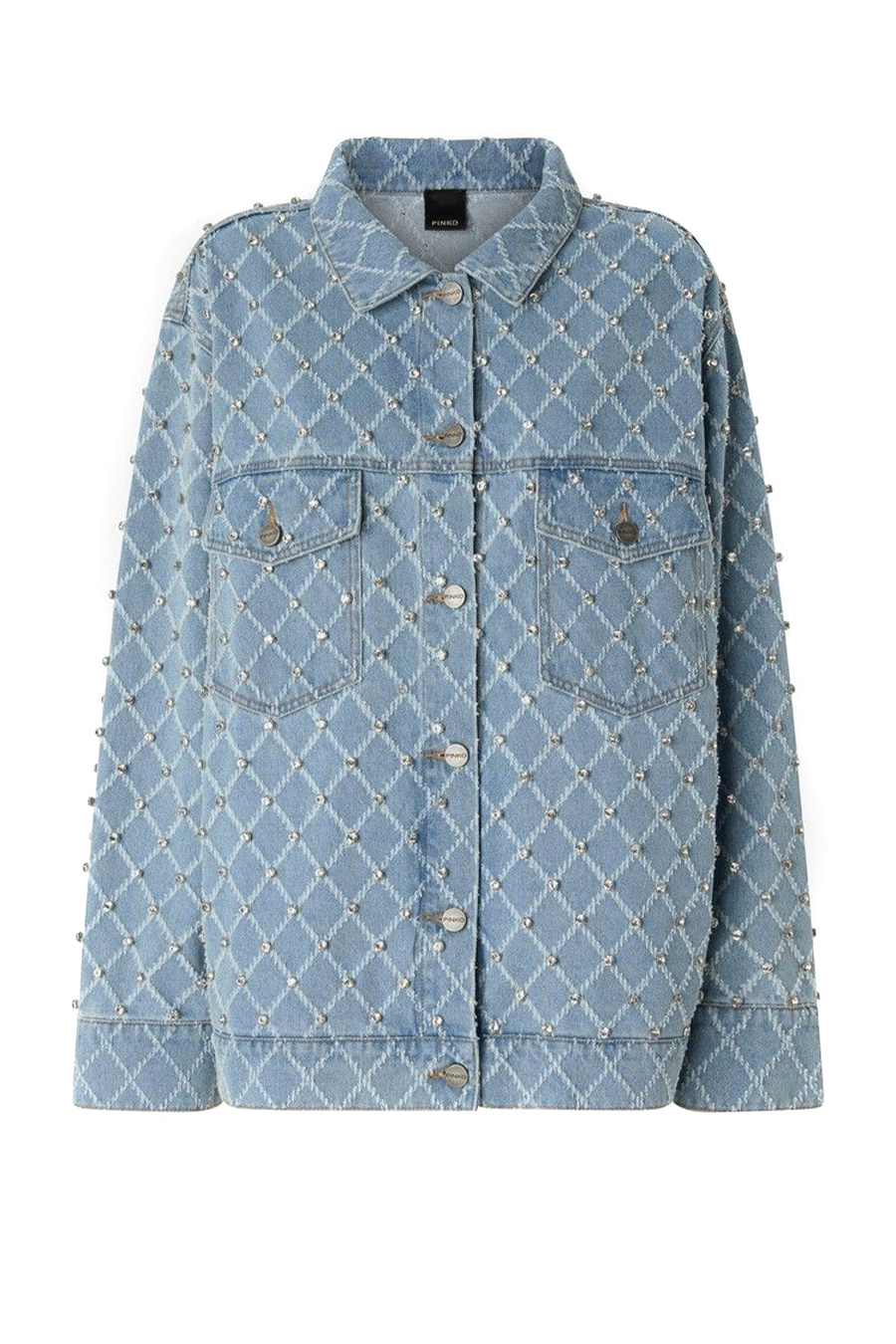 Pinko denim jacket with diamond pattern and rhinestones, featuring a shirt collar, front patch pockets with flaps and buttons, and buttoned cuffs.
