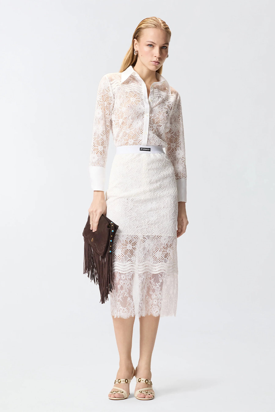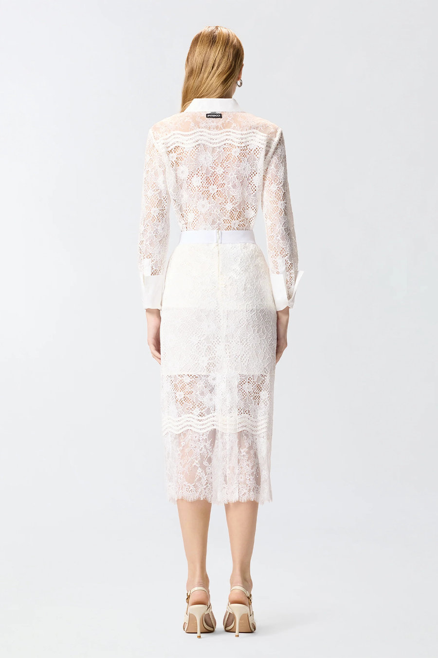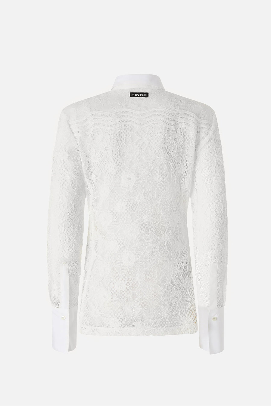 Pinko shirt in tulle and lace with a classic cut, featuring long sleeves with high cuffs and buttons, a straight hem and visible front button fastening.