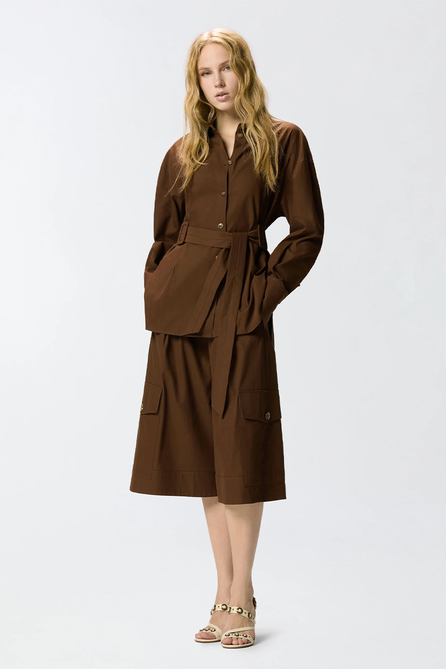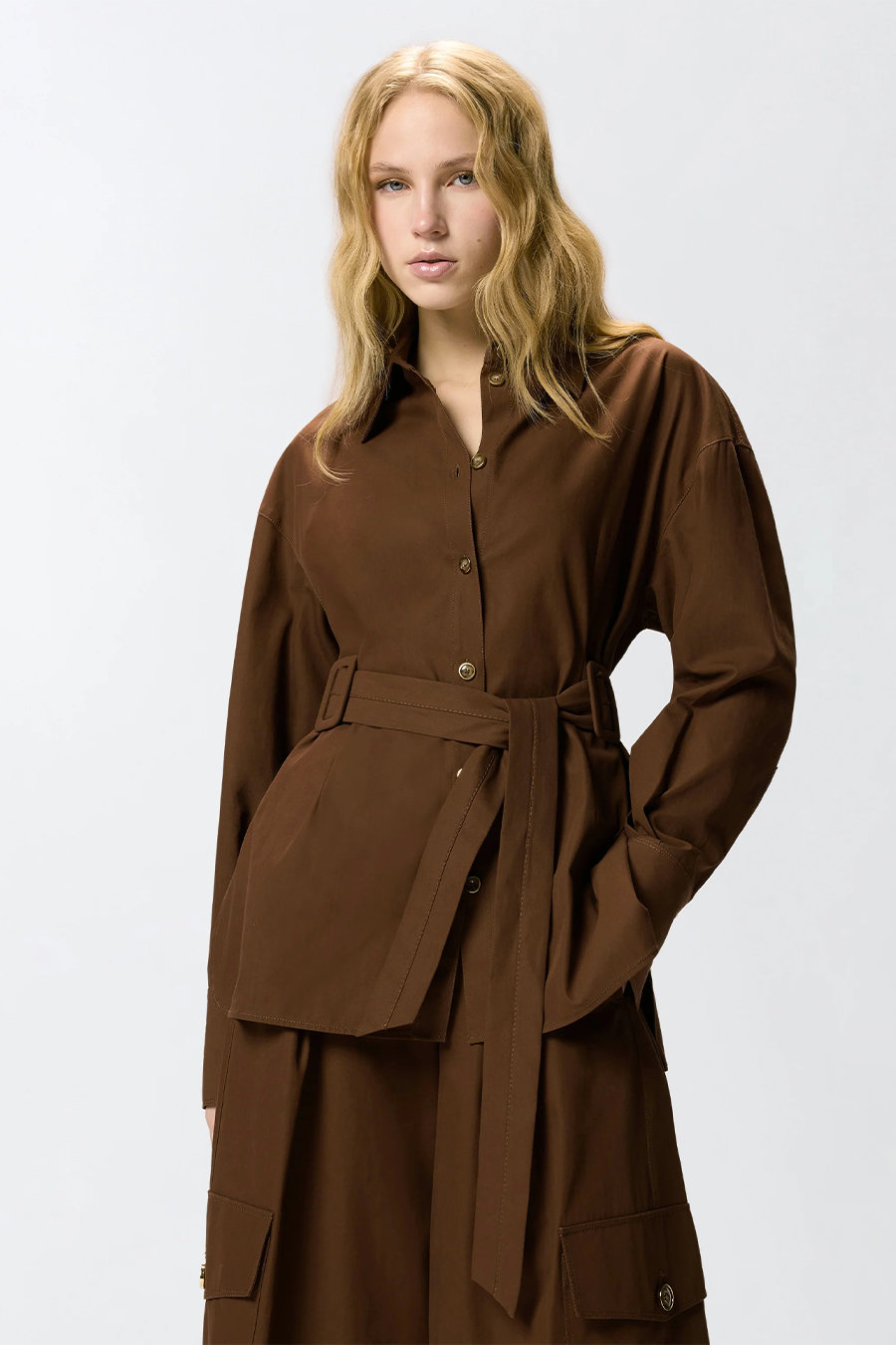 Long-cut Pinko cotton jacket with belt, made from pure cotton twill with a cotton lining, featuring a pointed collar, front button fastening, three-button cuffs and a matching removable belt to tie at the waist.