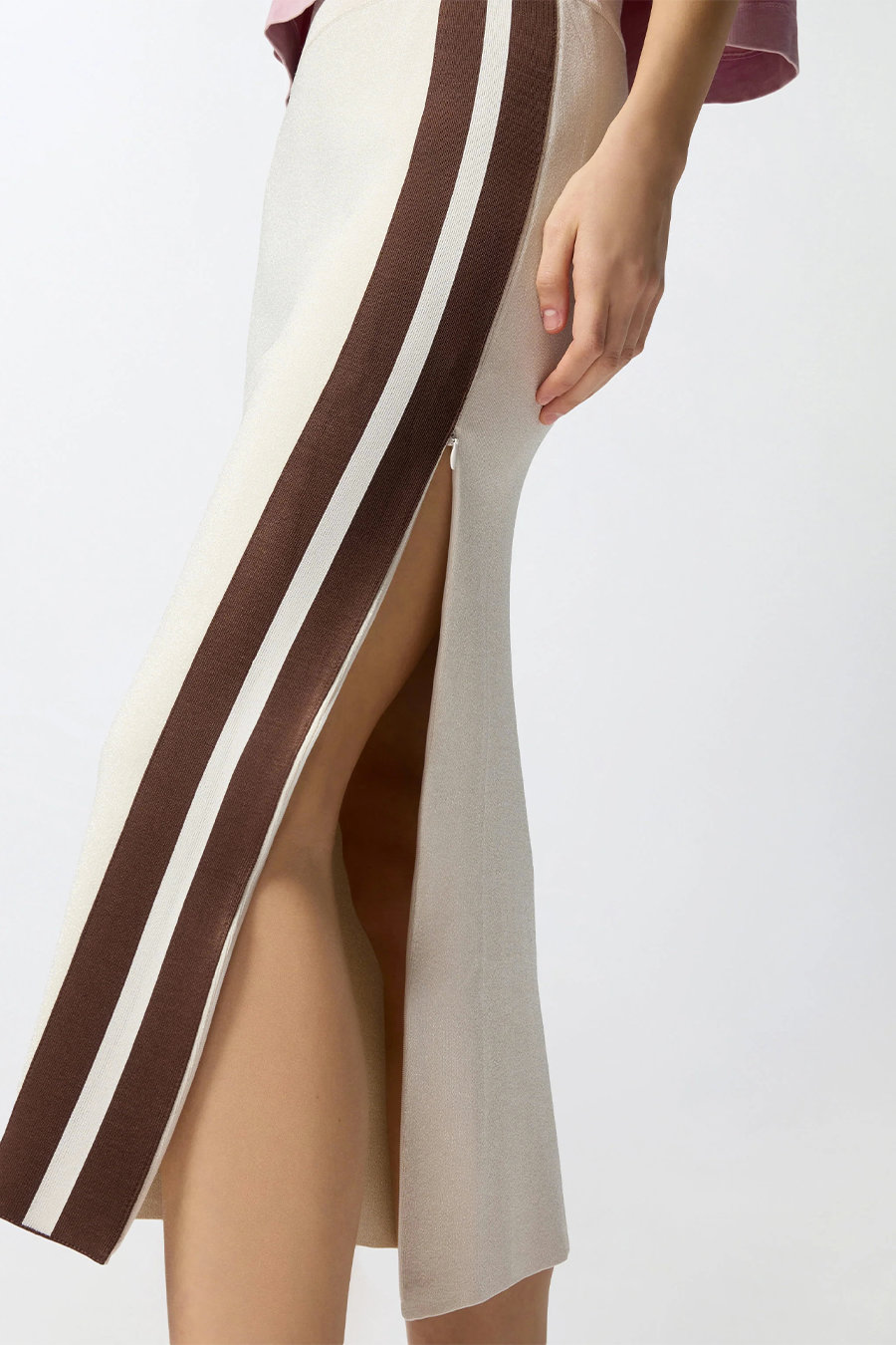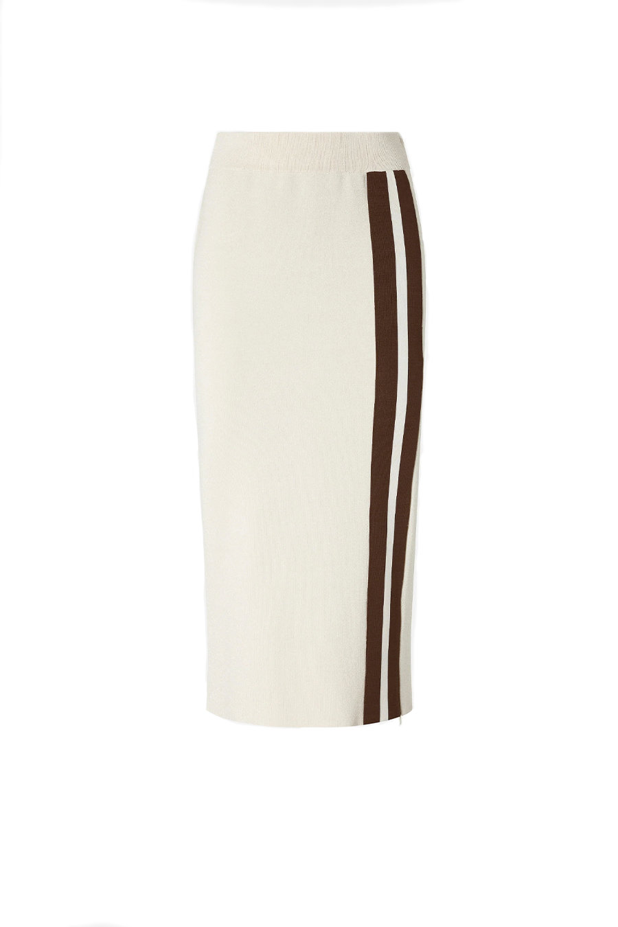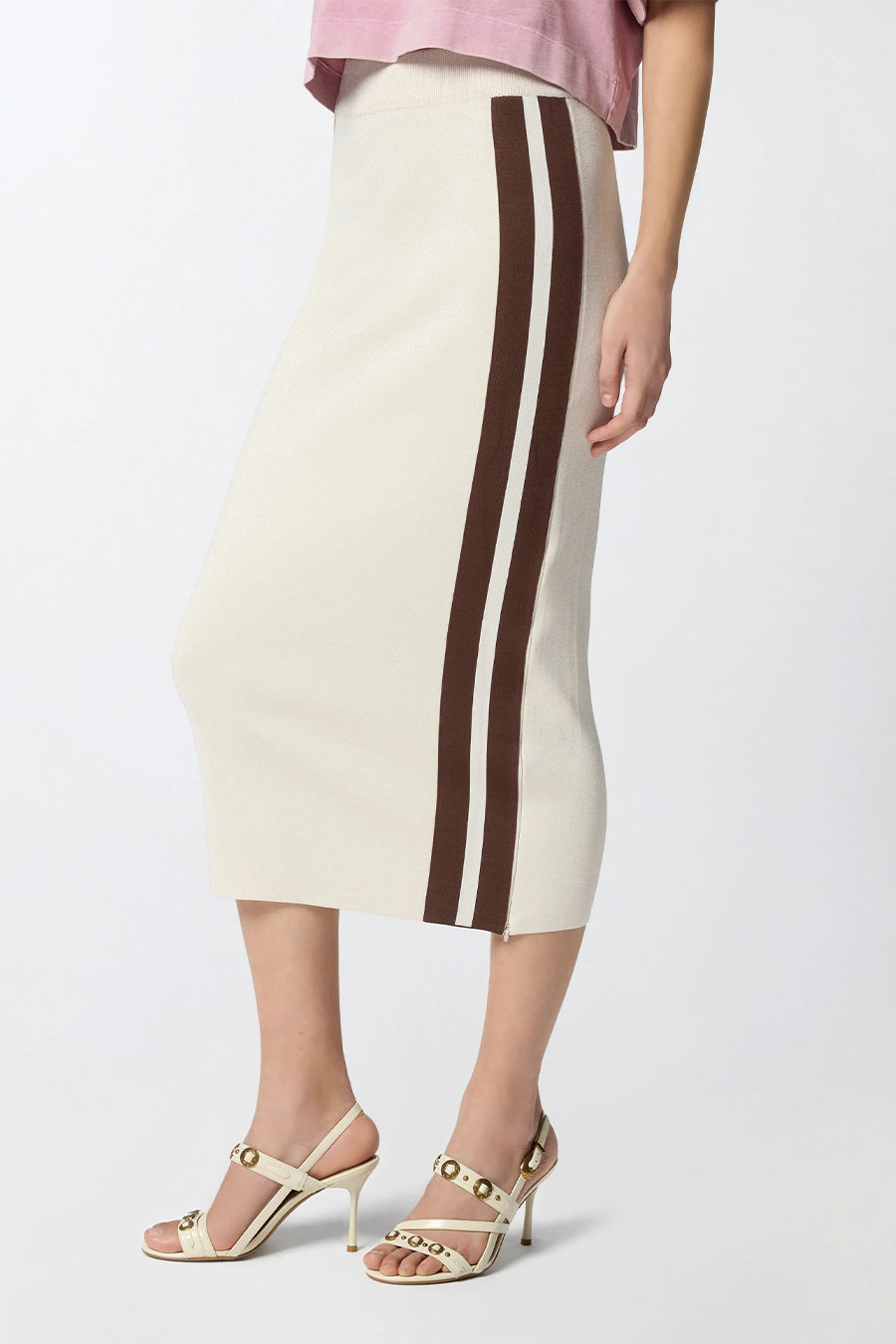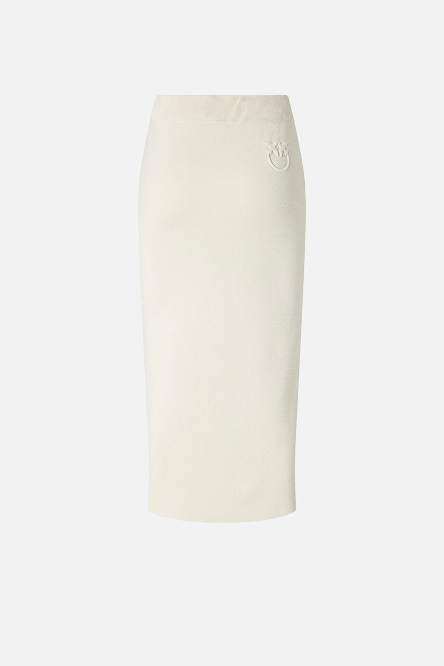 Pinko fitted midi skirt with contrasting bands, featuring a comfortable ribbed waistband for added comfort. Made from technical sweatshirt-effect piqué fabric embellished with a very fine luminous yarn and two contrasting side bands on the front. Also customised with a tone-on-tone Love Birds logo in relief on the back.