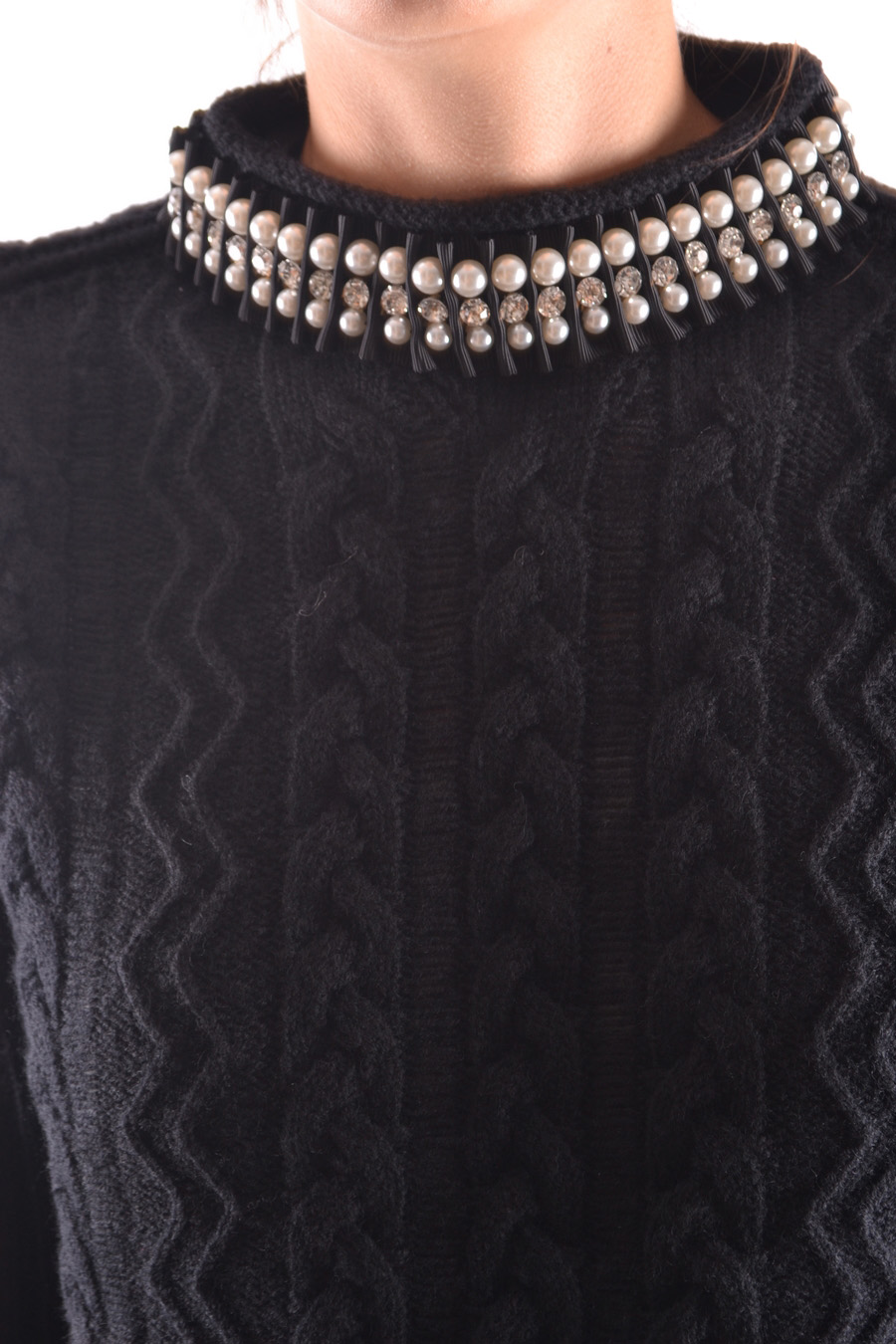 knitted sweater with high collar and applications with lateral splits