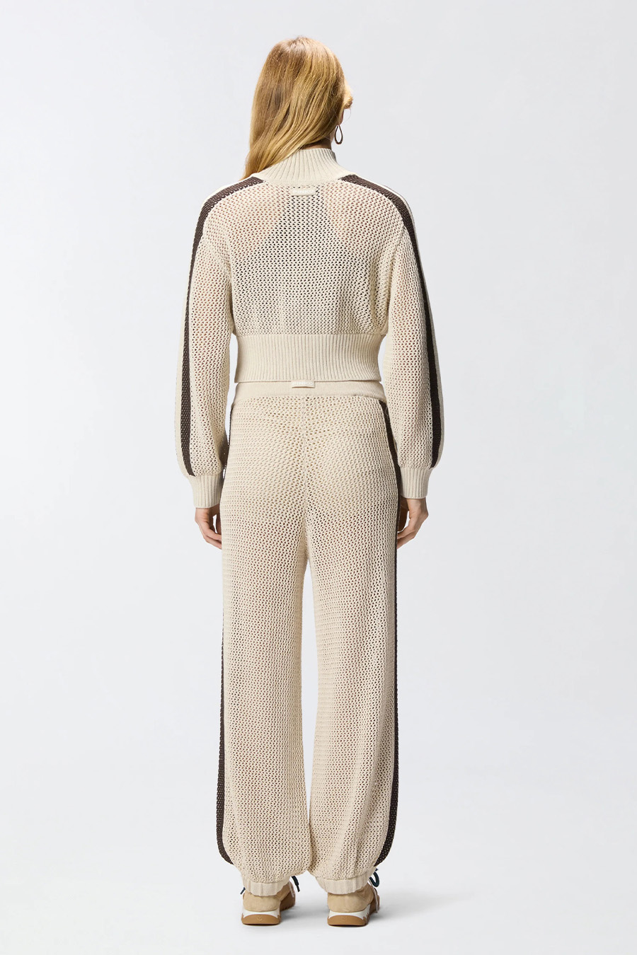 Pinkore cropped mesh sweatshirt, crafted from a soft, cool cotton blend with a mesh-effect weave, featuring contrasting stripes on the sleeves. It has a high neck, ribbed hem and cuffs, whilst the front fastens with a two-way zip.