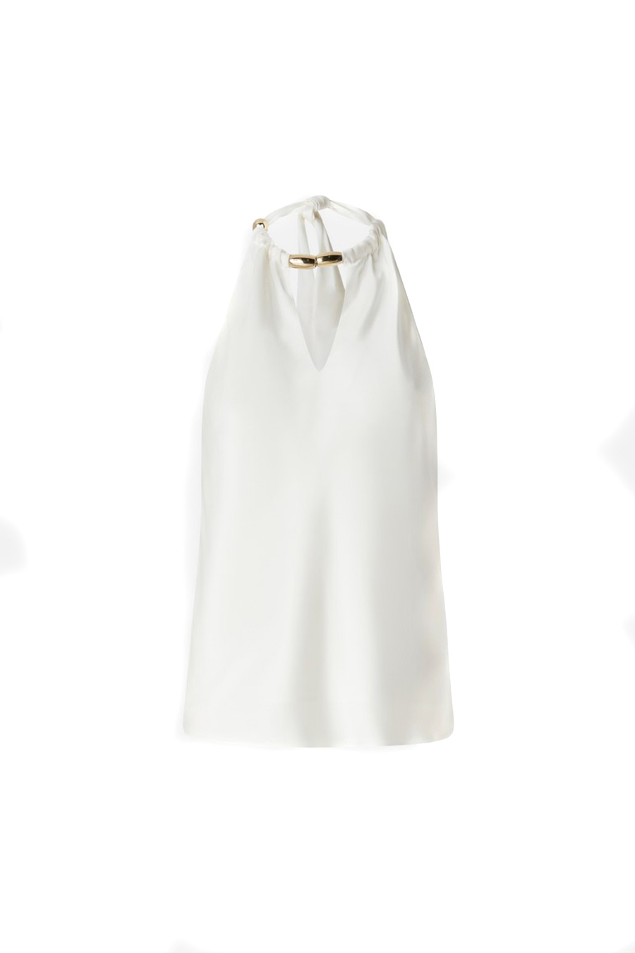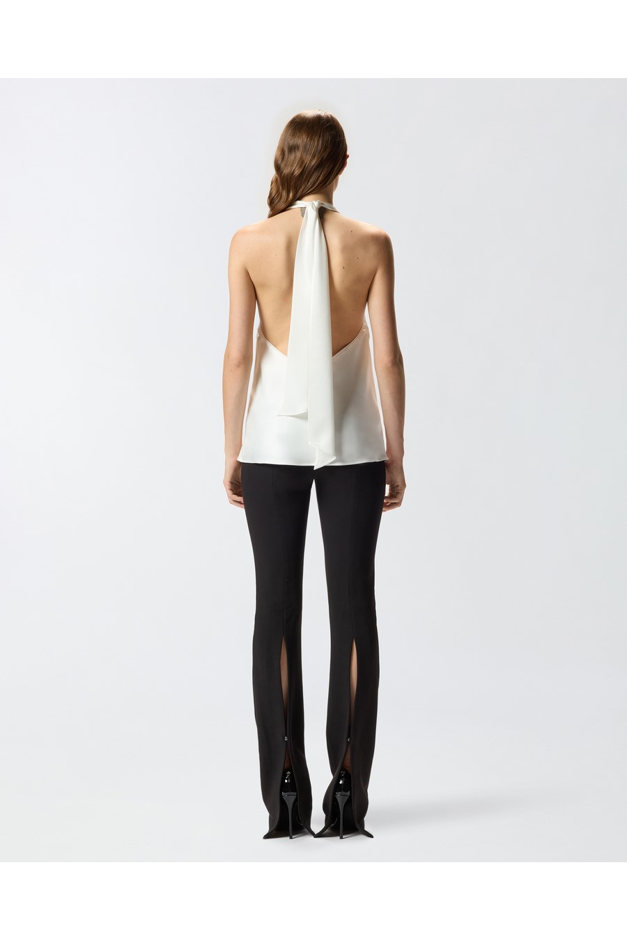 Soft Pinko sleeveless top with halter neck embellished with metal beads, open back with shiny satin sash tied at the neck.