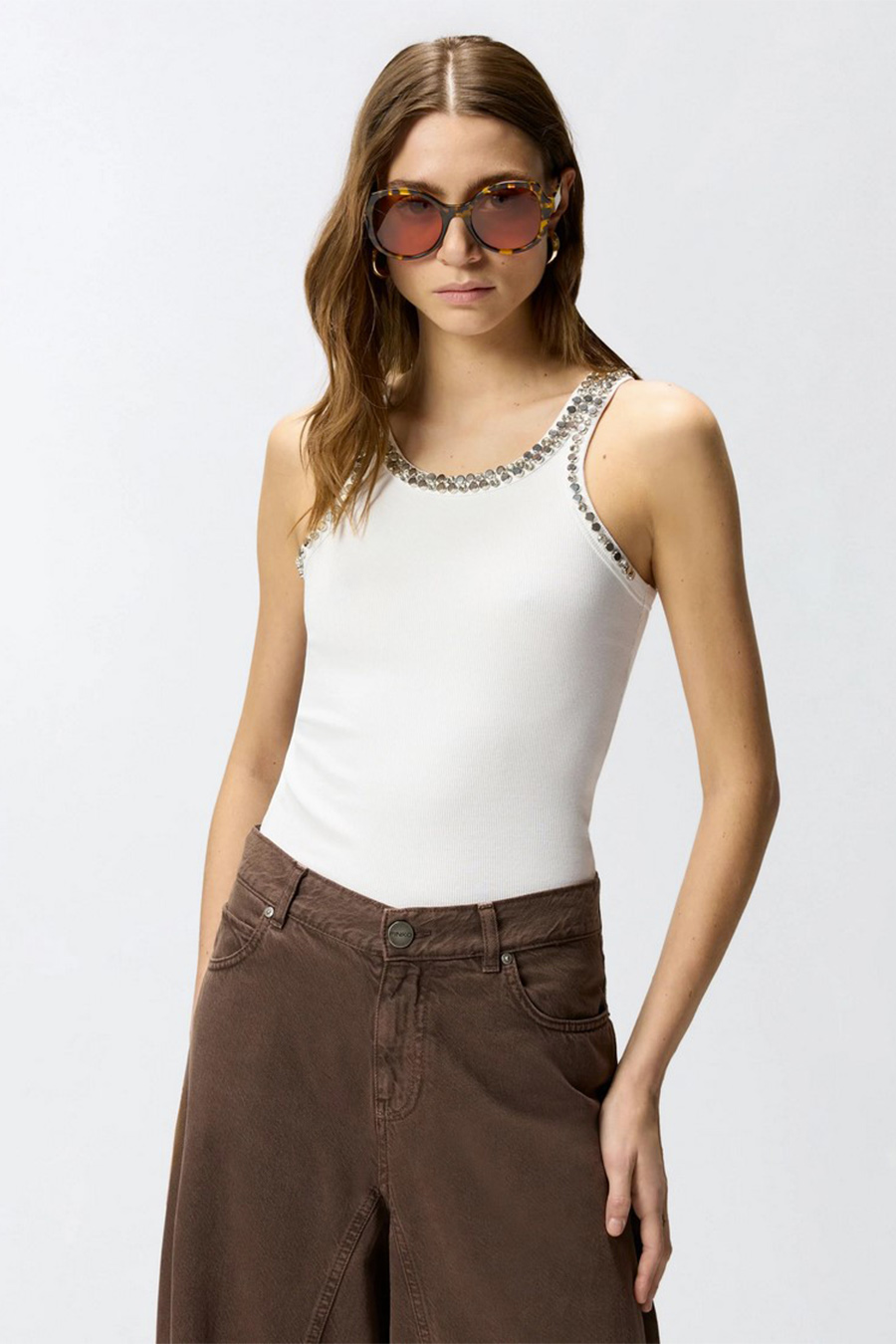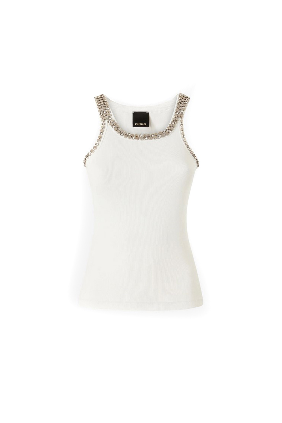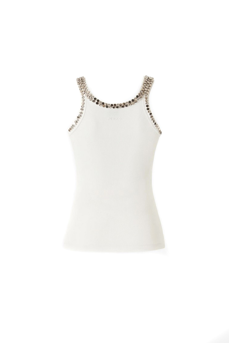 Pinko tank top made from ribbed cotton blend jersey, with crystal and stud detailing on the straps and front and back necklines.