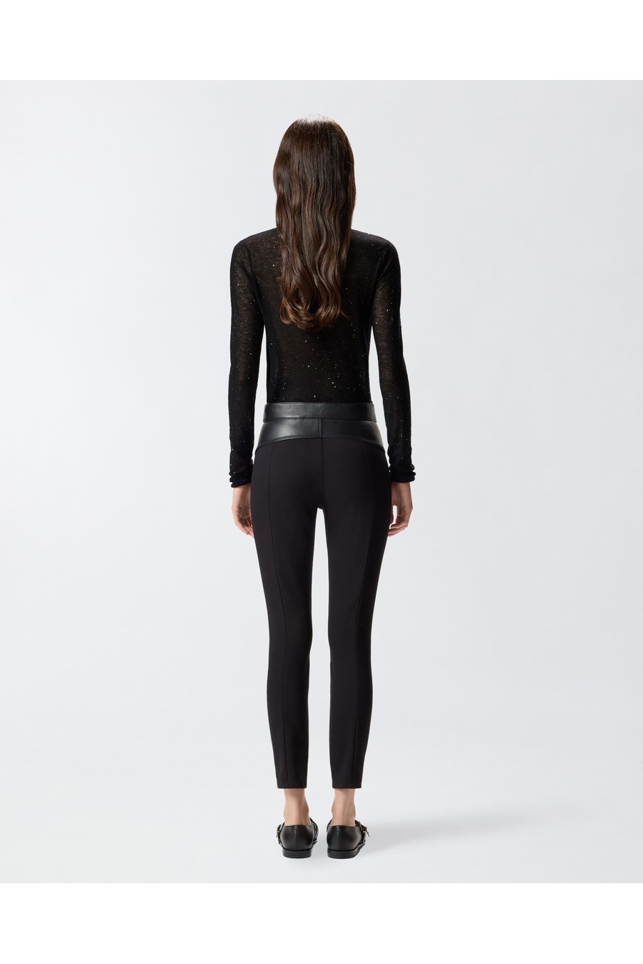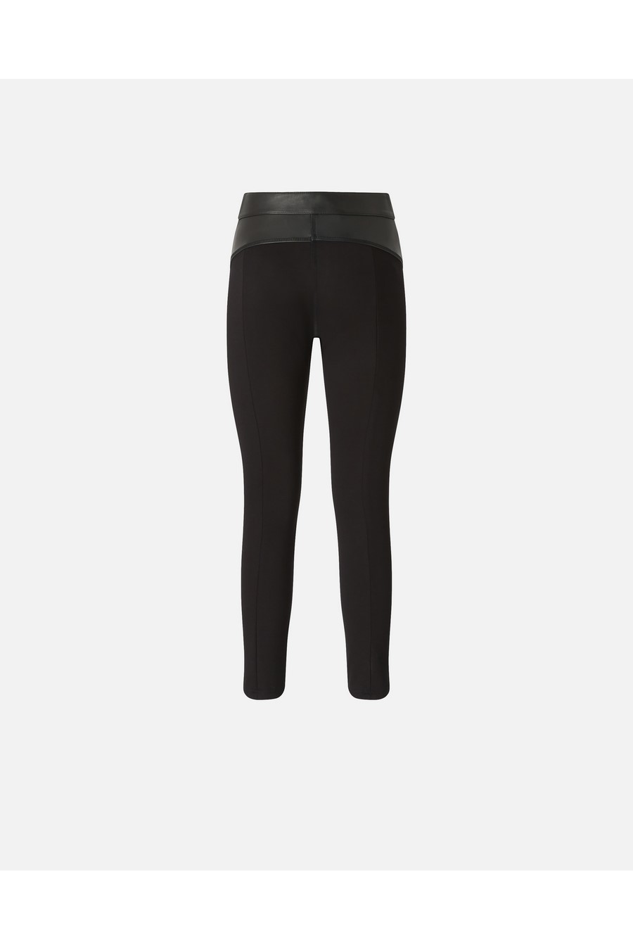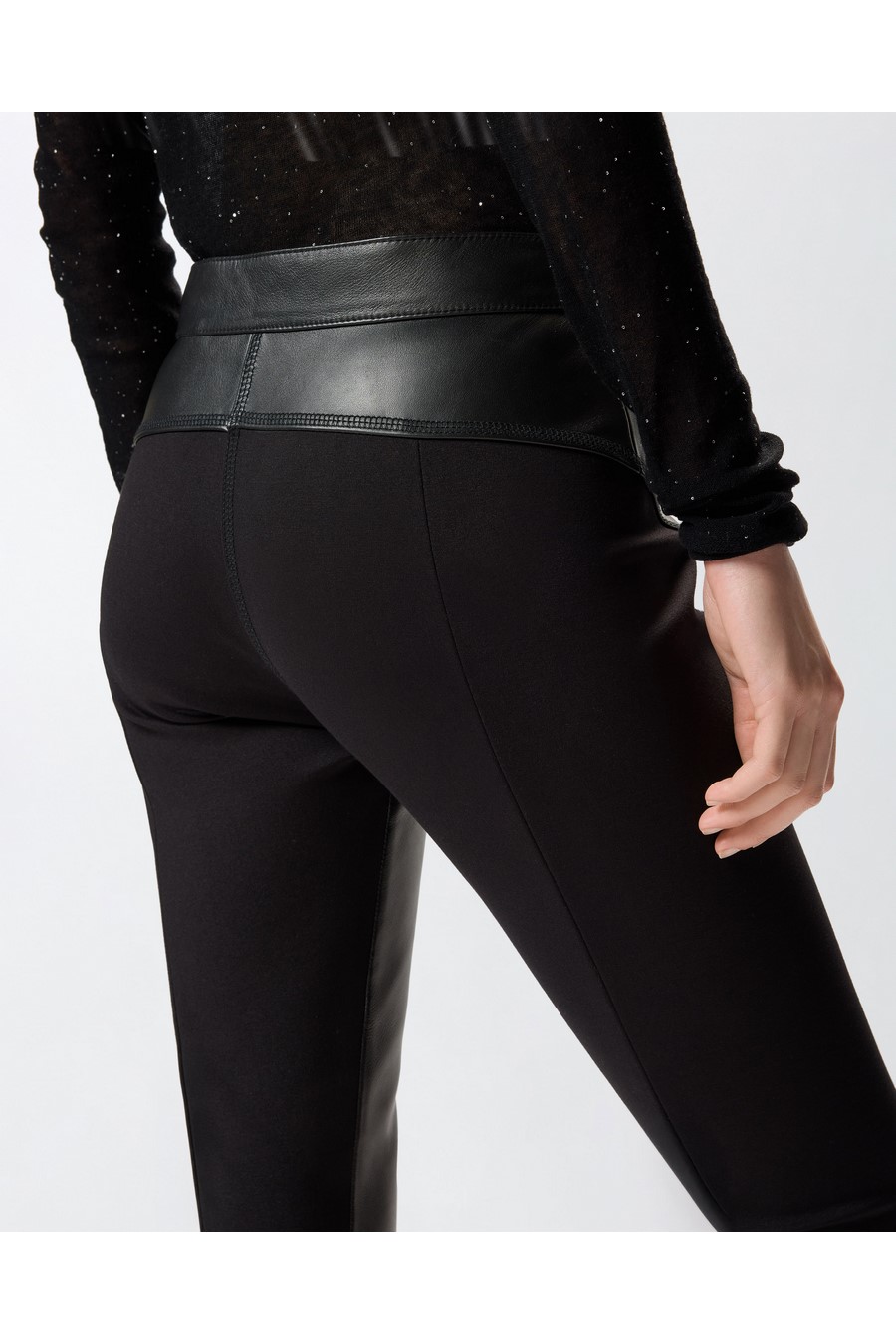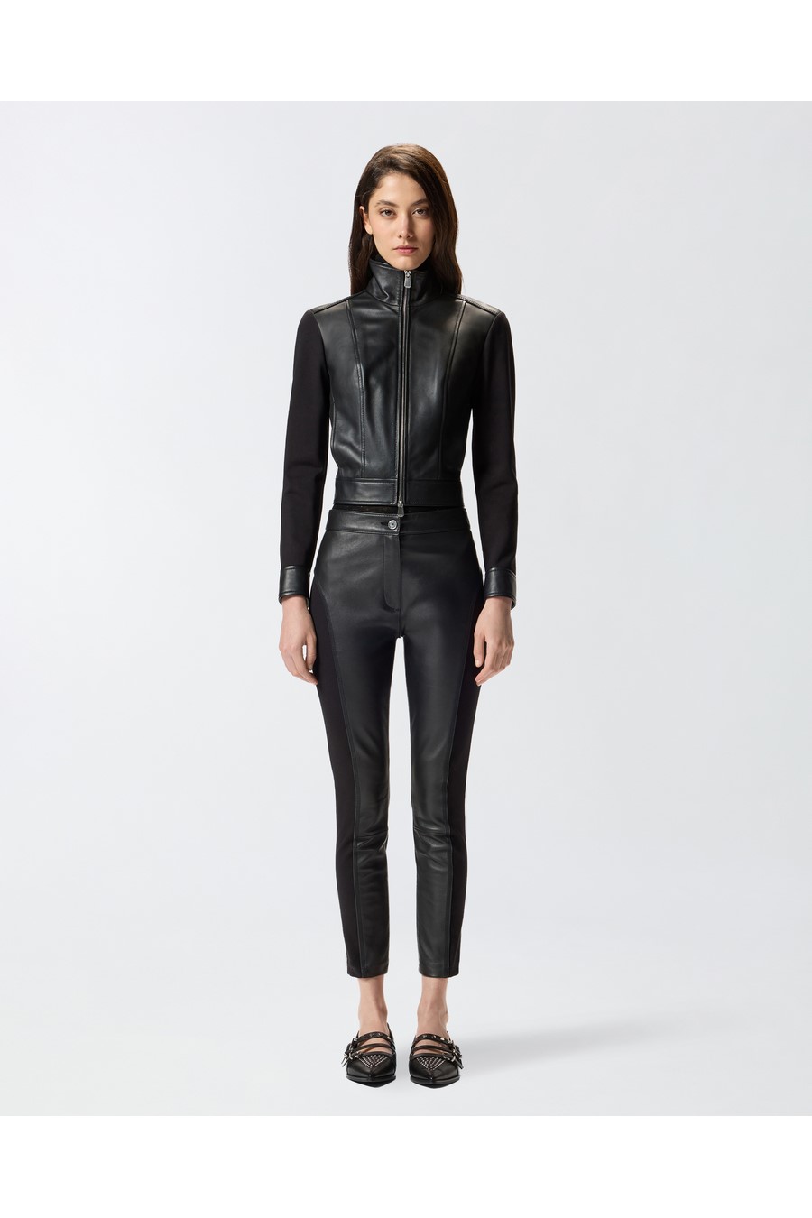 Pinko skinny leather and stretch fabric trousers with a slim fit and a concealed zip fastening at the front with a visible button.