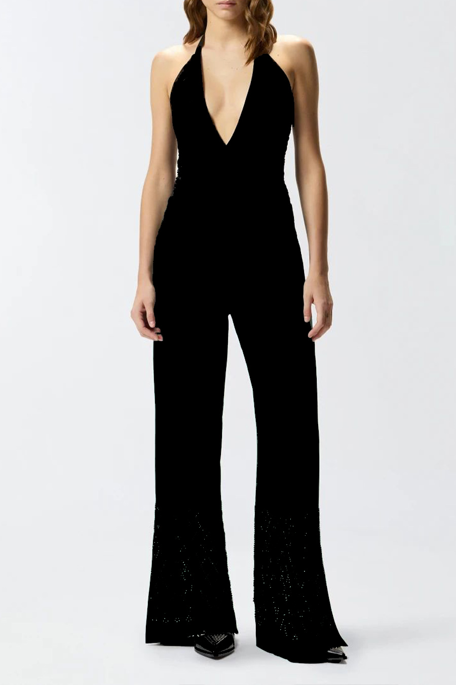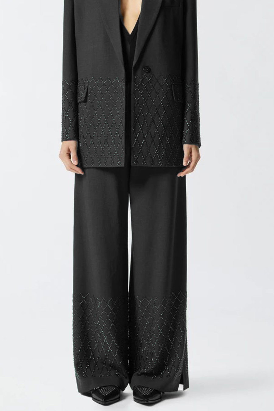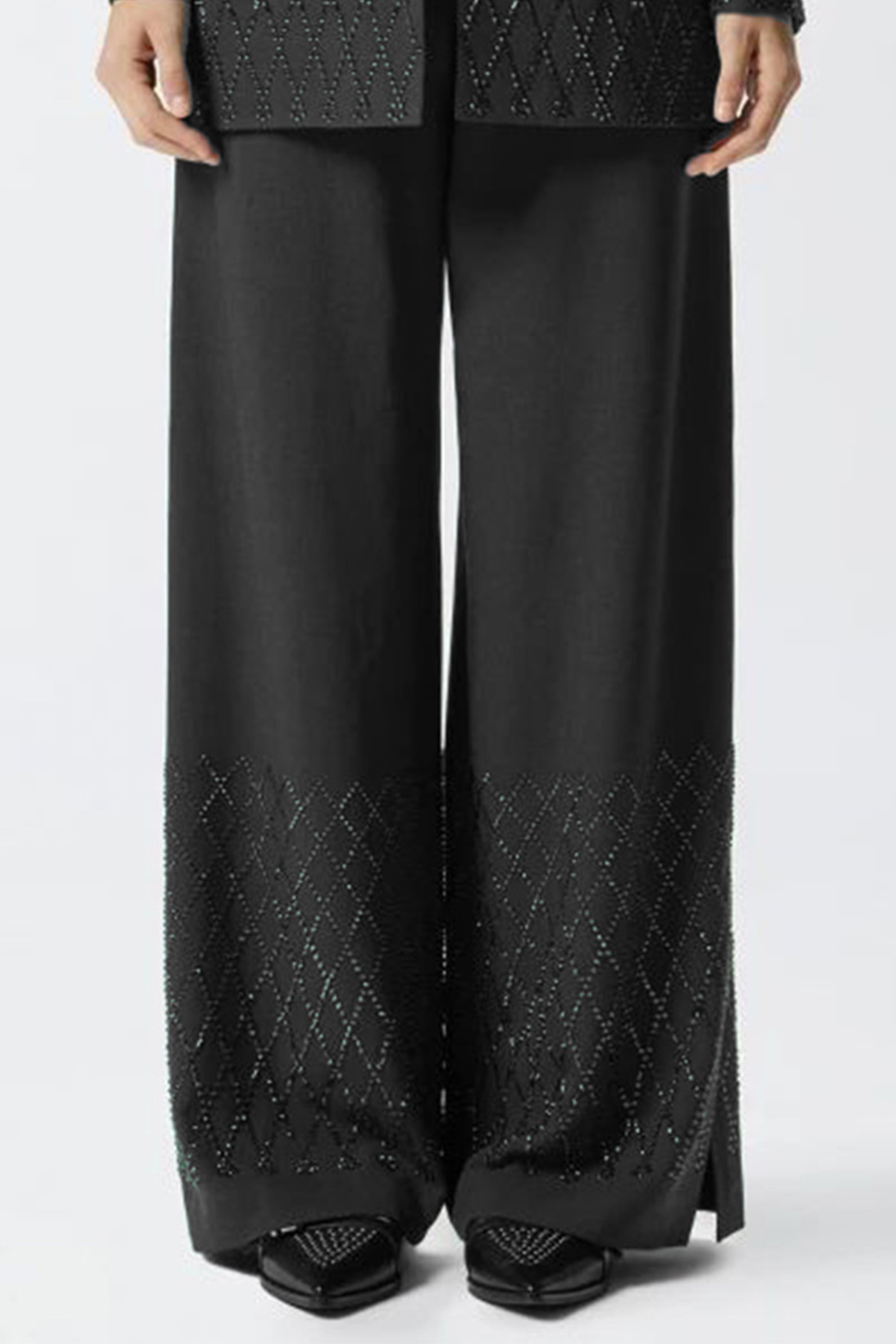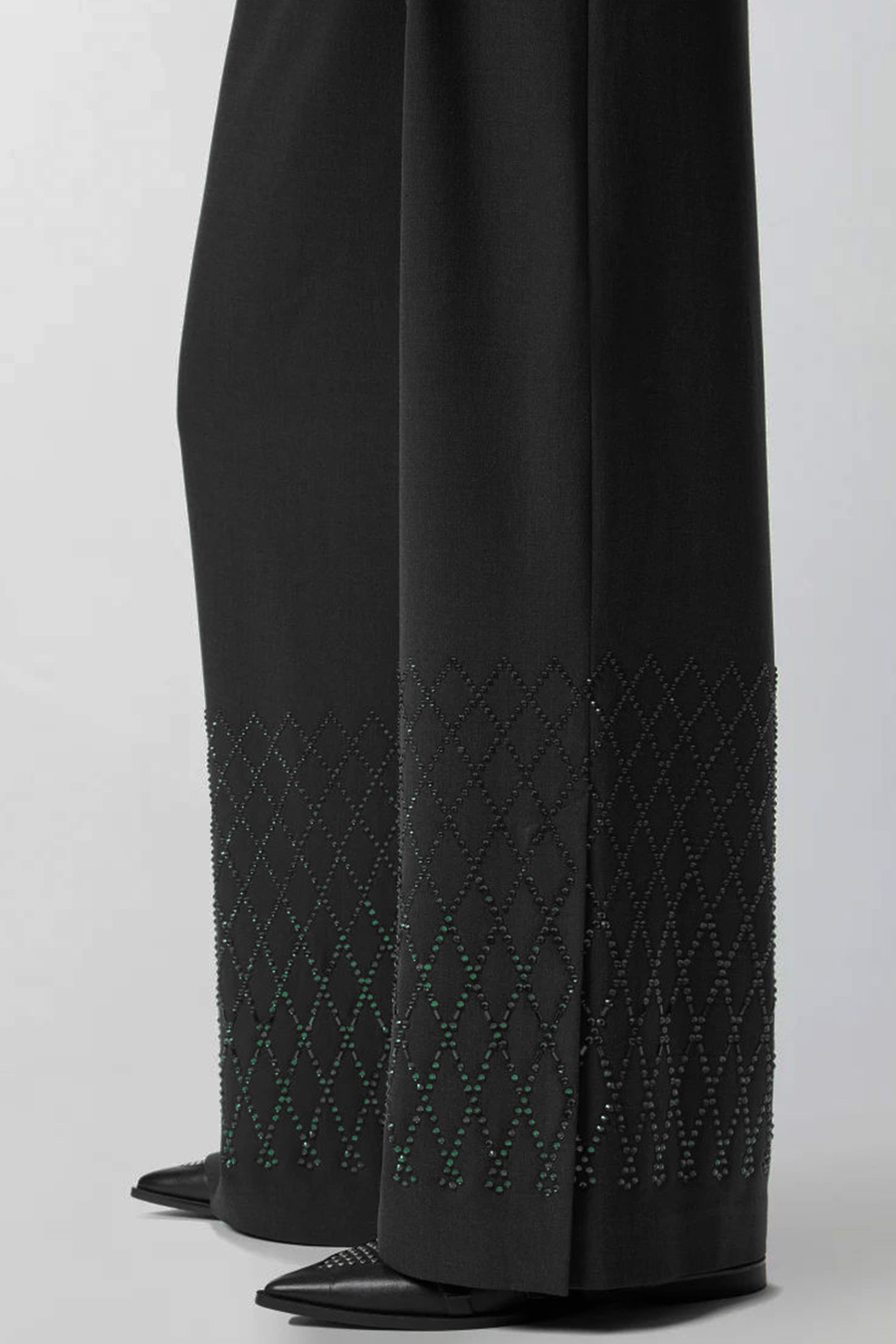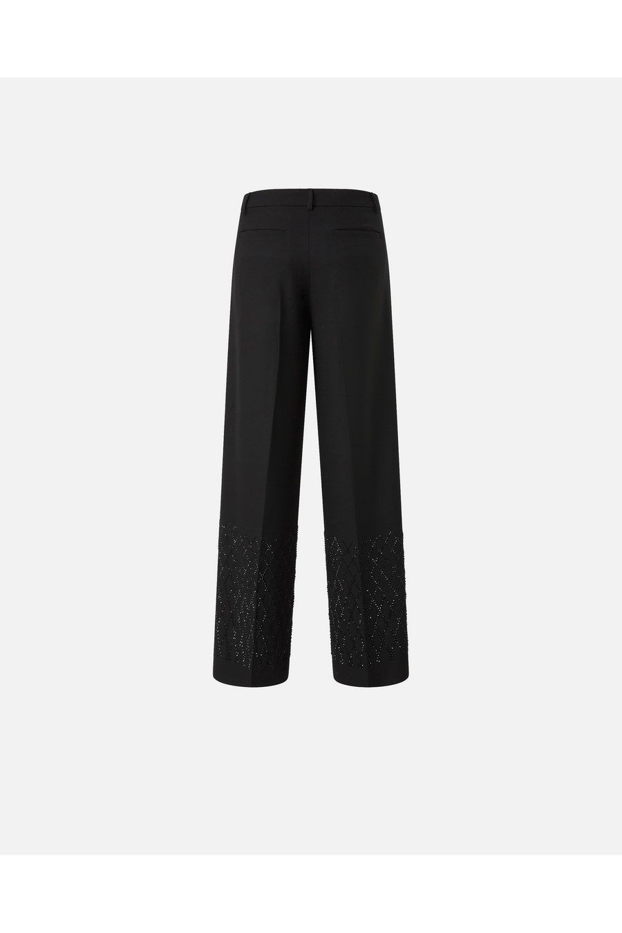 Pinko wide-fit trousers with rhinestones, slit at the bottom and welt pockets at the back, featuring rhinestones of various sizes and shapes that create a sophisticated geometric design at the bottom.
