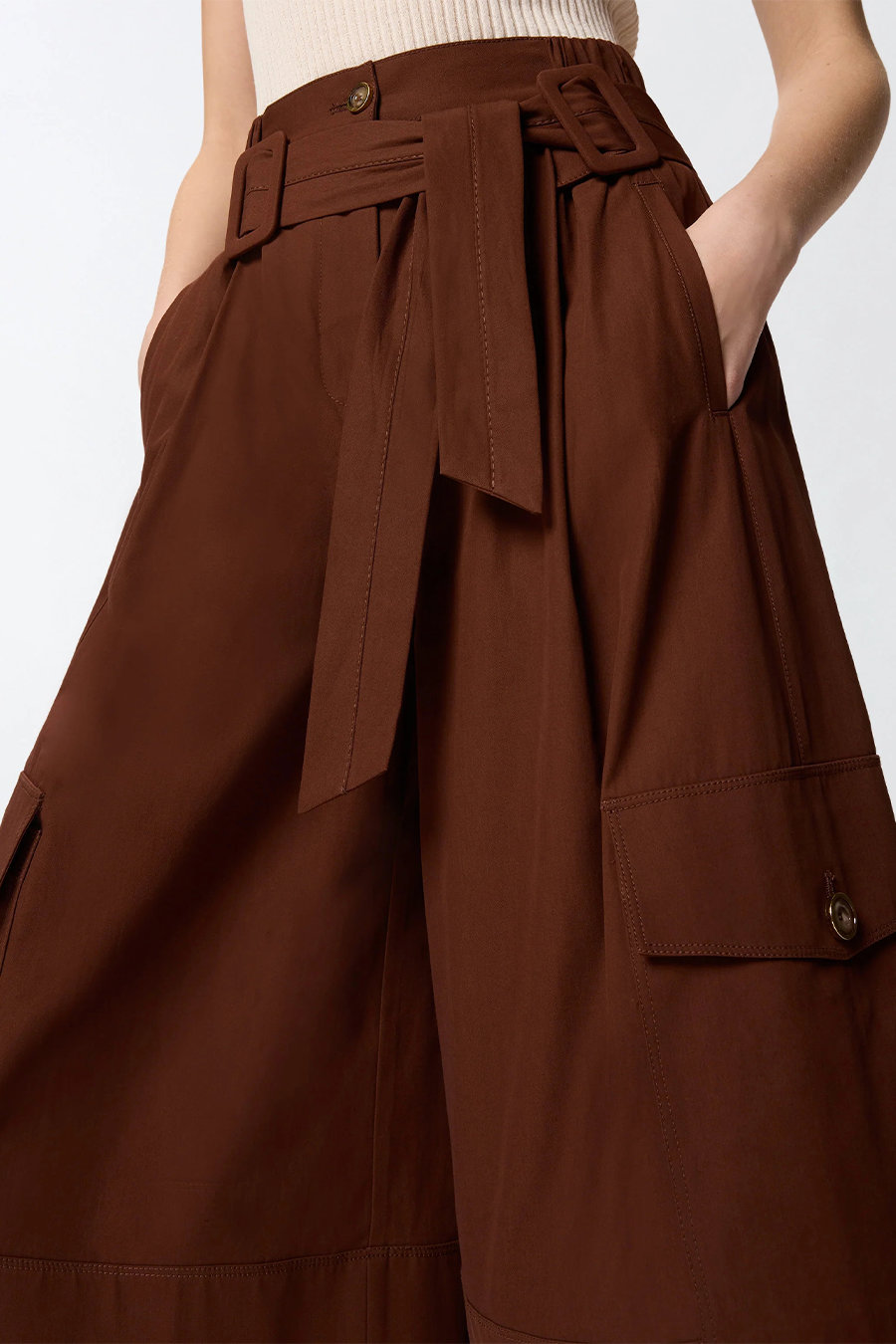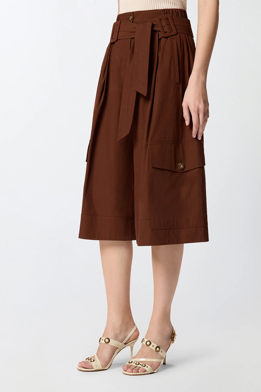 Long Pinko Bermuda shorts in pure cotton twill with a thick, fluid look and refined front pleats, featuring a matching fabric belt with double buckle to tie at the front, side pockets, back welt pockets, flap pockets with buttons along the legs and an elasticated waist at the sides.