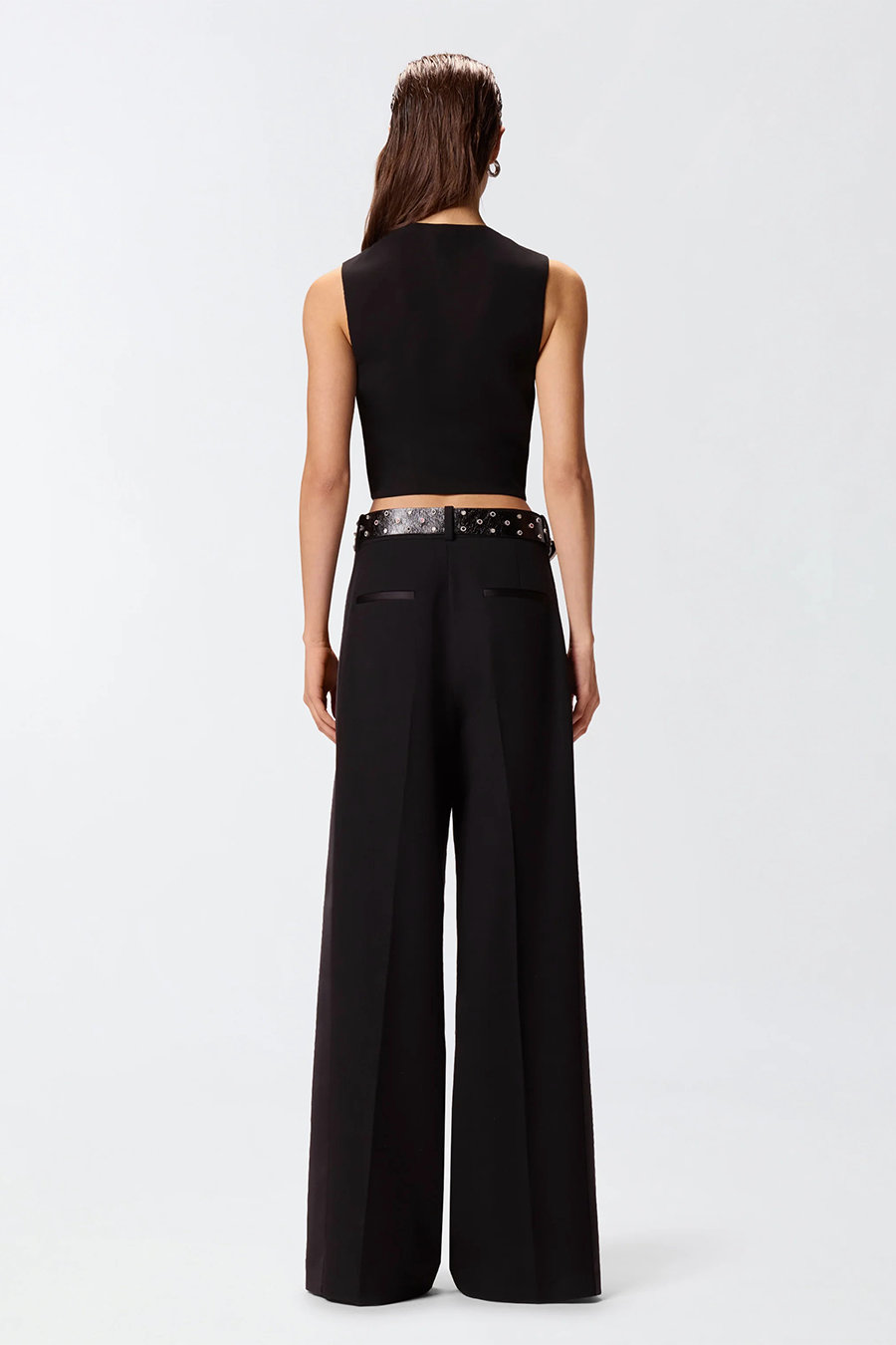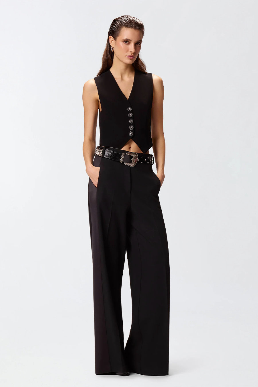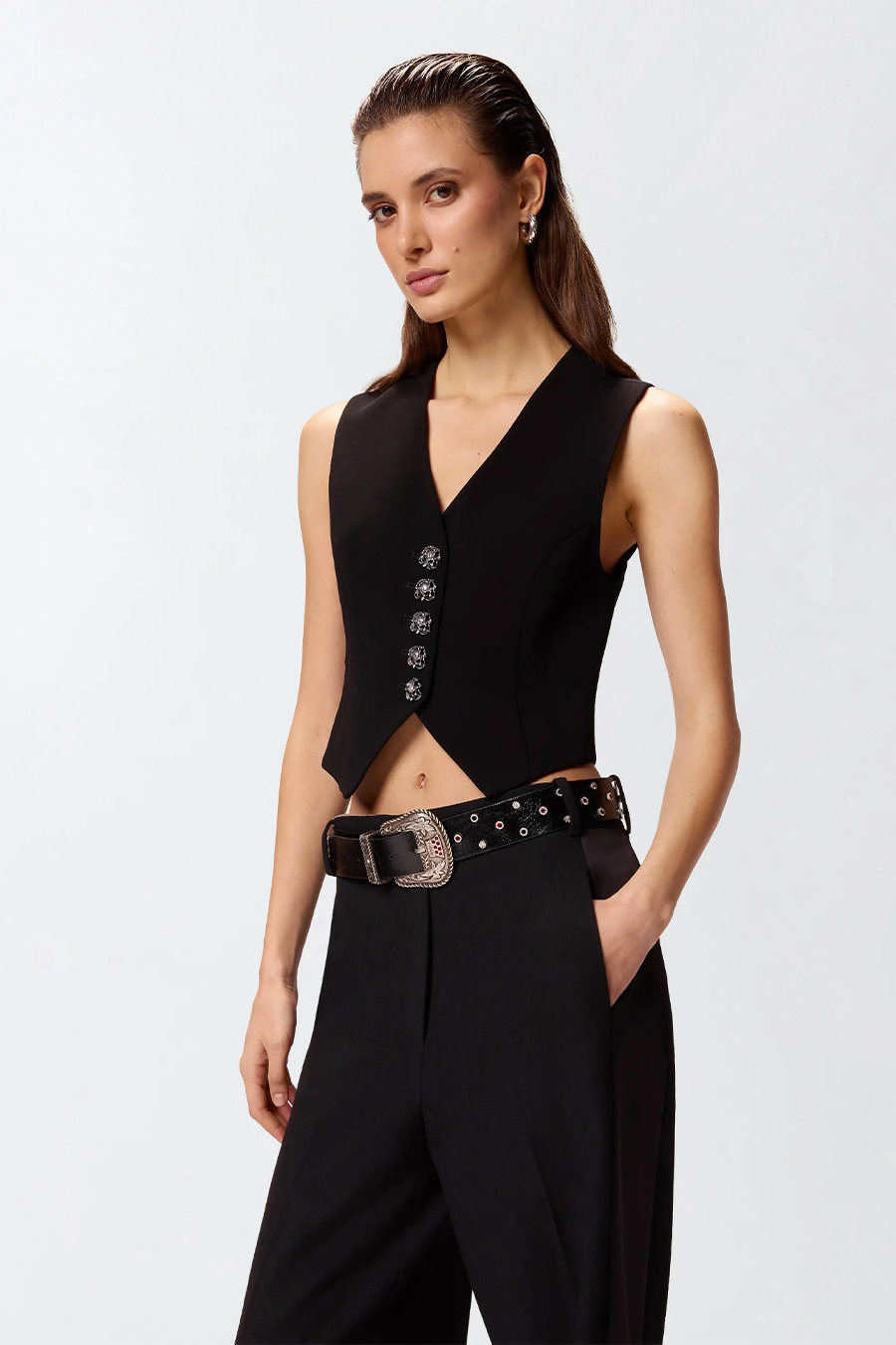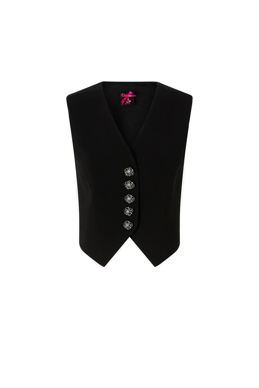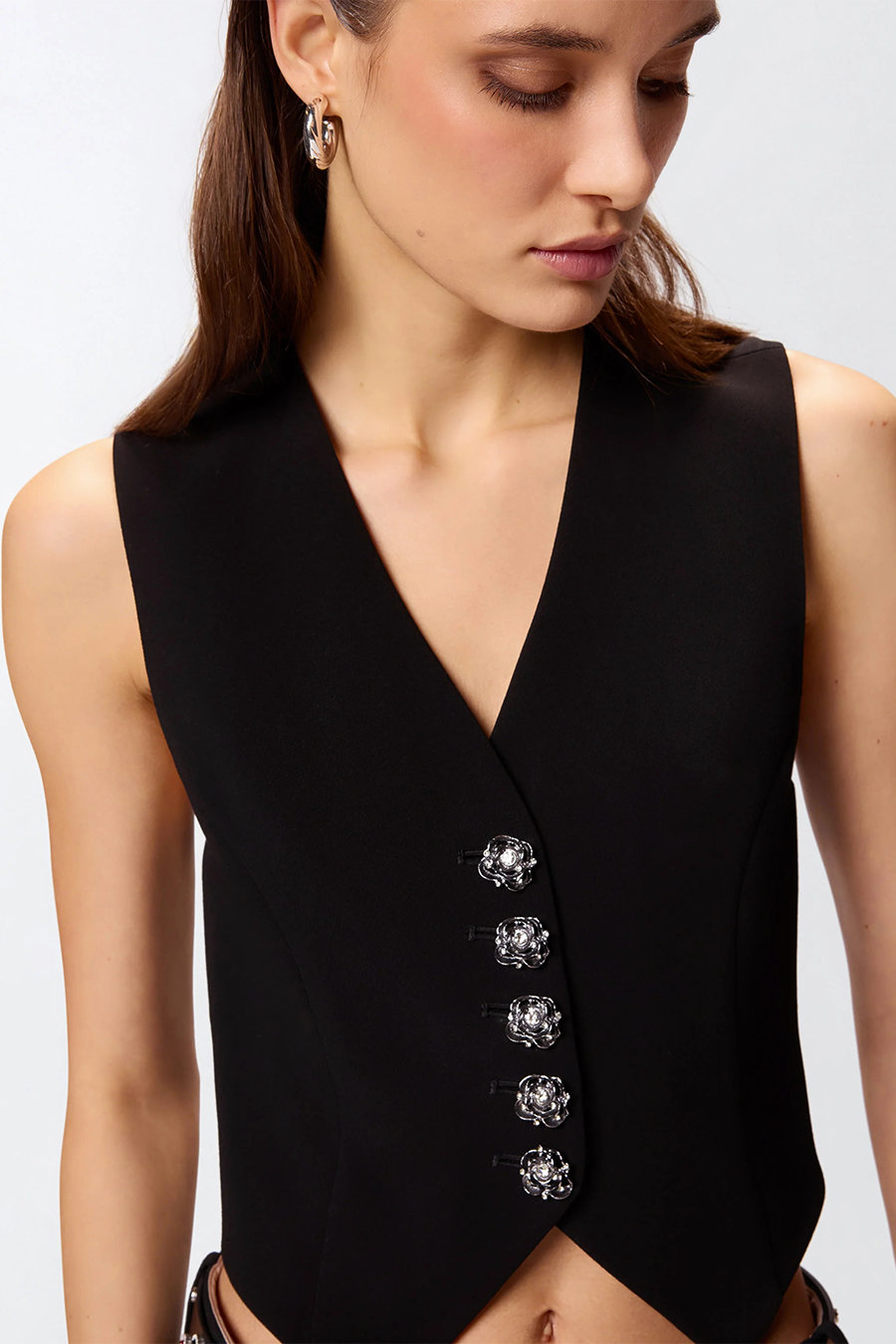 Pinko waistcoat with jewelled rose buttons made from stretch viscose, an iconic fabric reminiscent of classic cady, featuring a V-neck and double-pointed hem. It stands out for its sensual transparent insert at the back and button fastening with rose-shaped jewelled appliqués, each petal delicately encrusted with sparkling crystals.