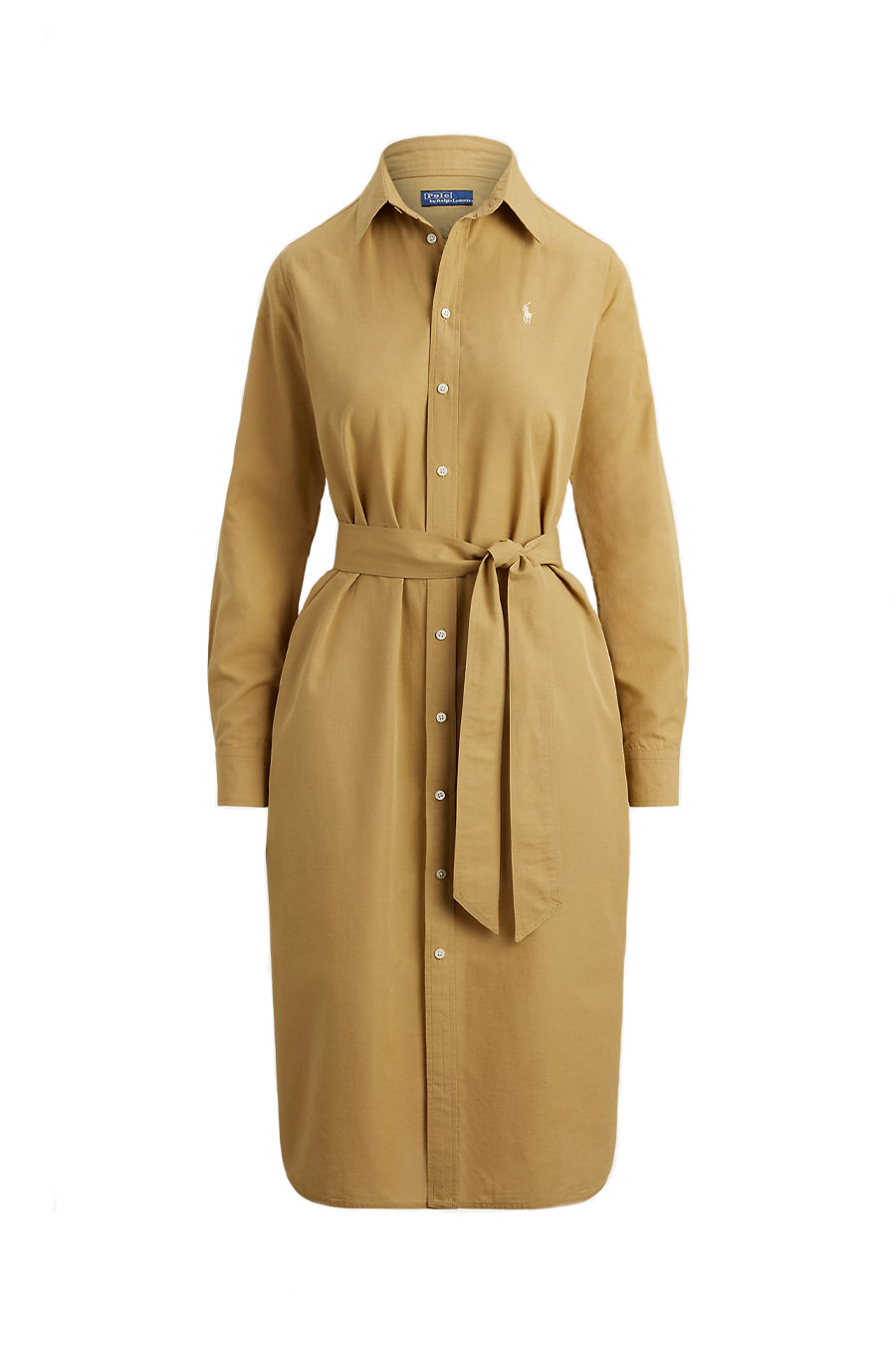 Straight-cut cotton and linen shirt dress with belt by Polo Ralph Lauren, length to the top of the calf.
