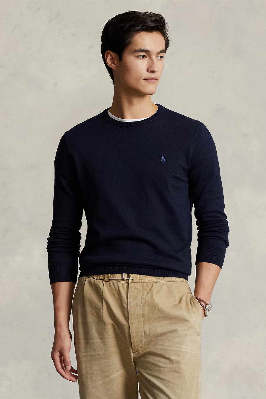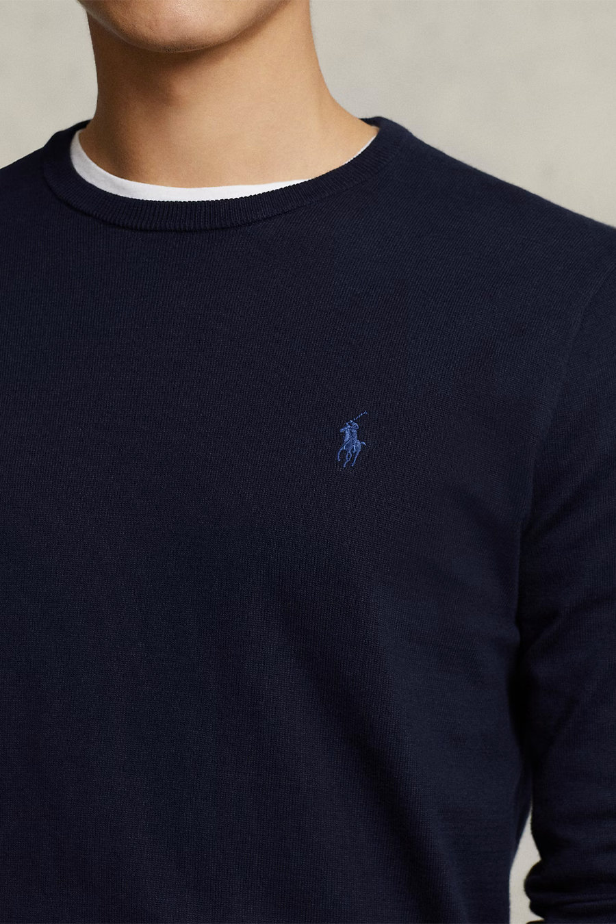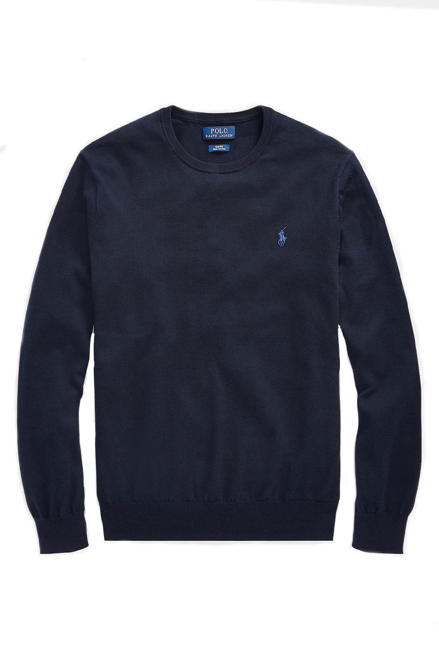 navy cotton sweater from Polo Ralph Lauren featuring round neck, long sleeves, logo embroidered to the chest, ribbed edge, straight hem