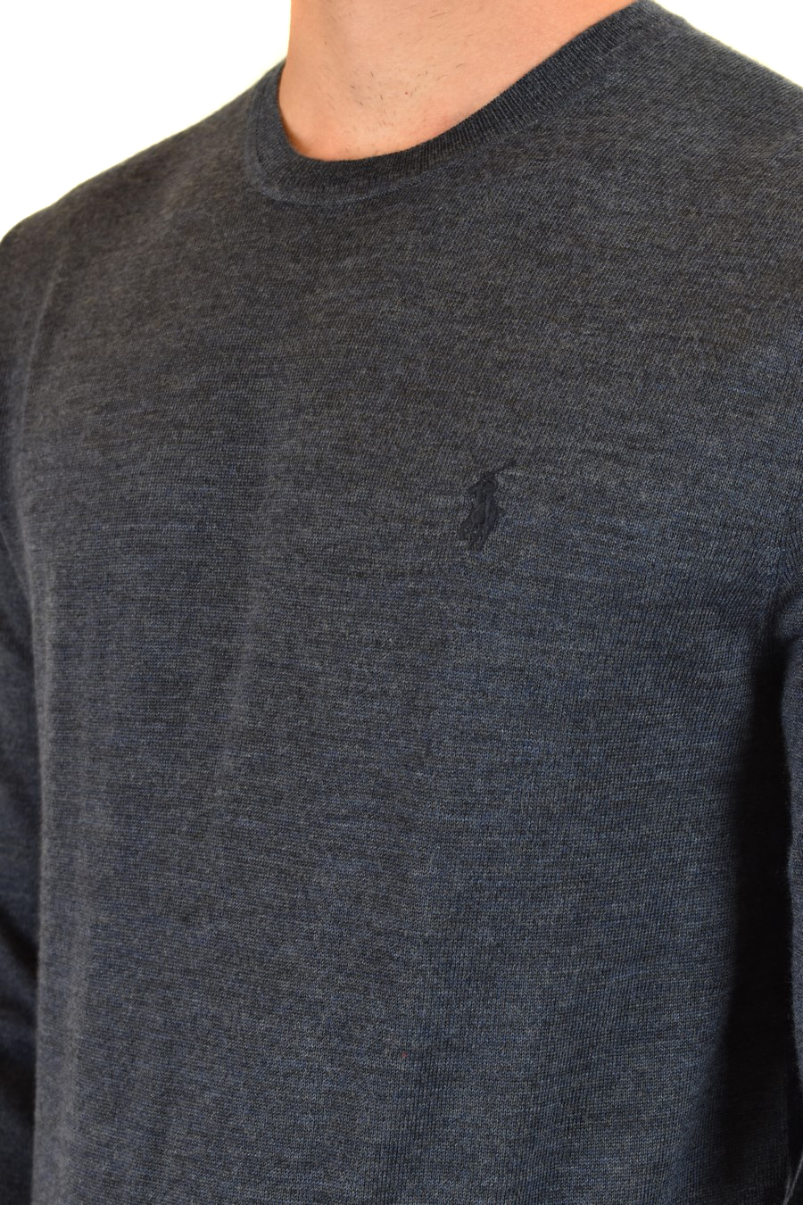 light blue sweater from Polo Ralph Lauren featuring round neck, long sleeves, dark blue logo embroidered on the side, slim fit