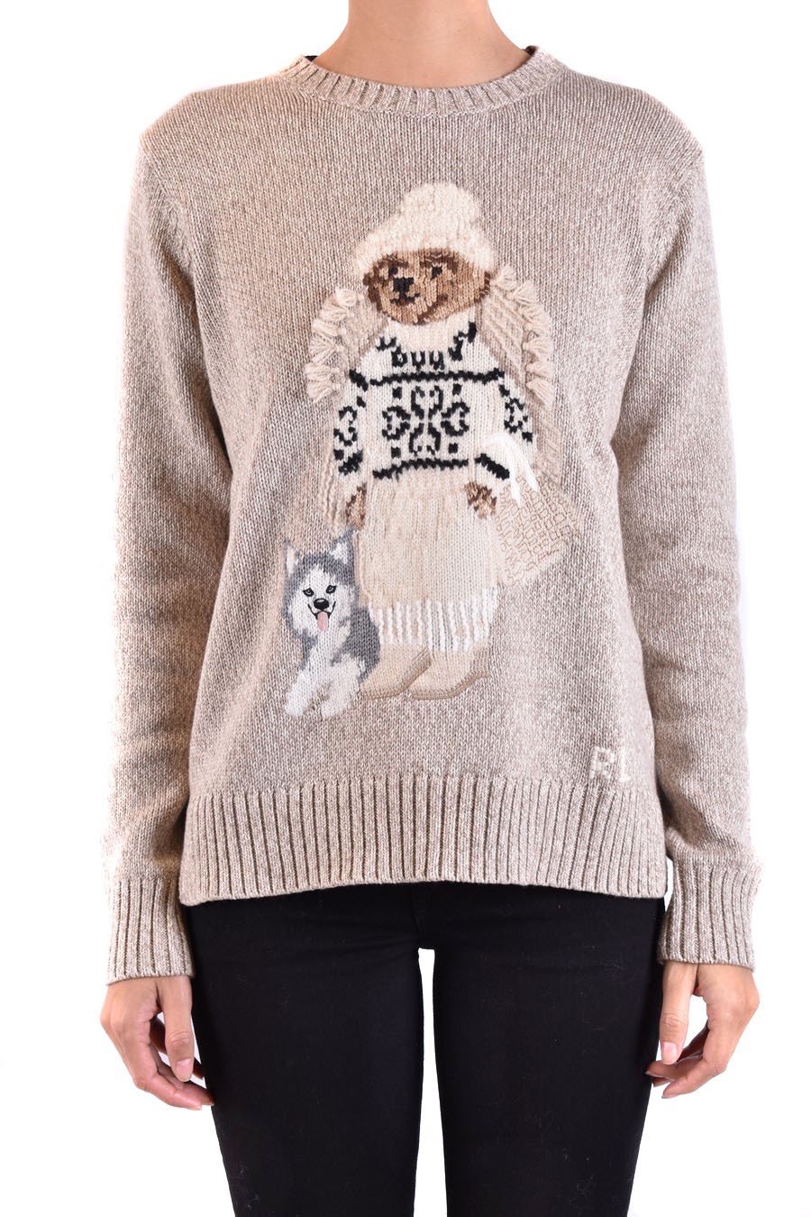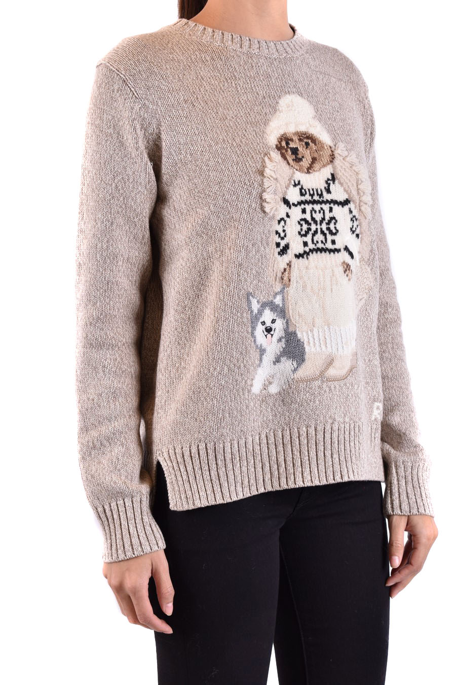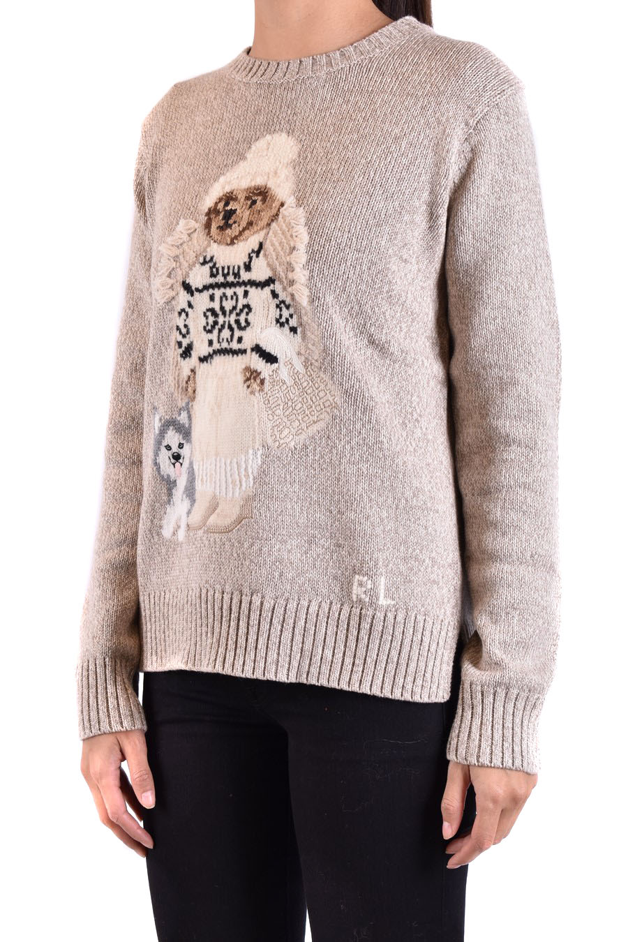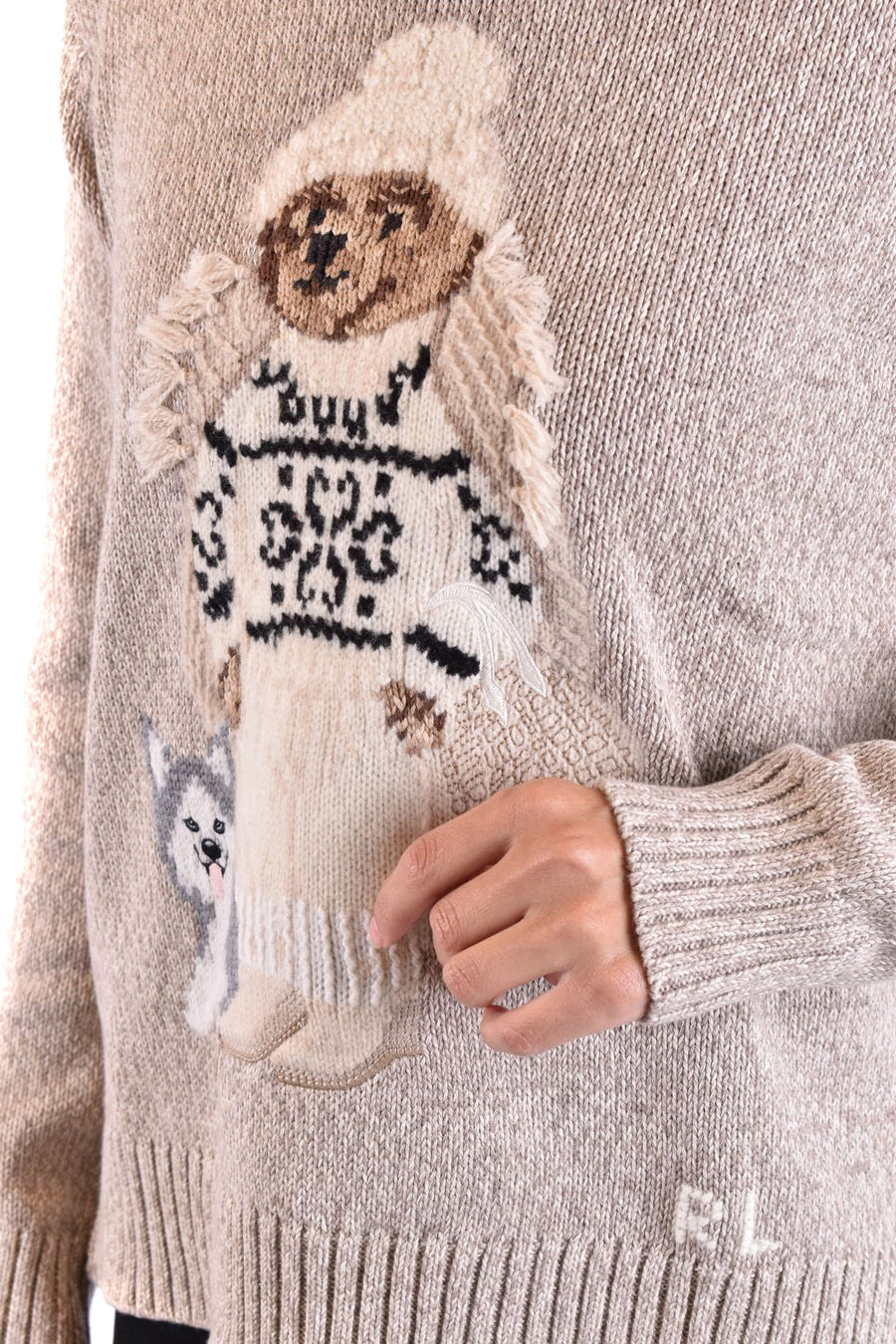 beige sweater from Polo Ralph Lauren featuring round neck, long sleeves, ribbed cuffs, ribbed hem, intarsia knit, signature Polo Bear motif