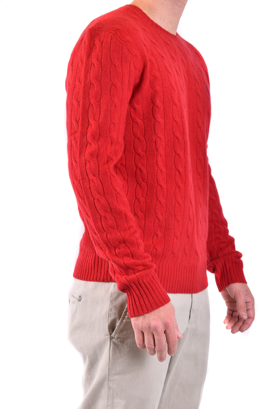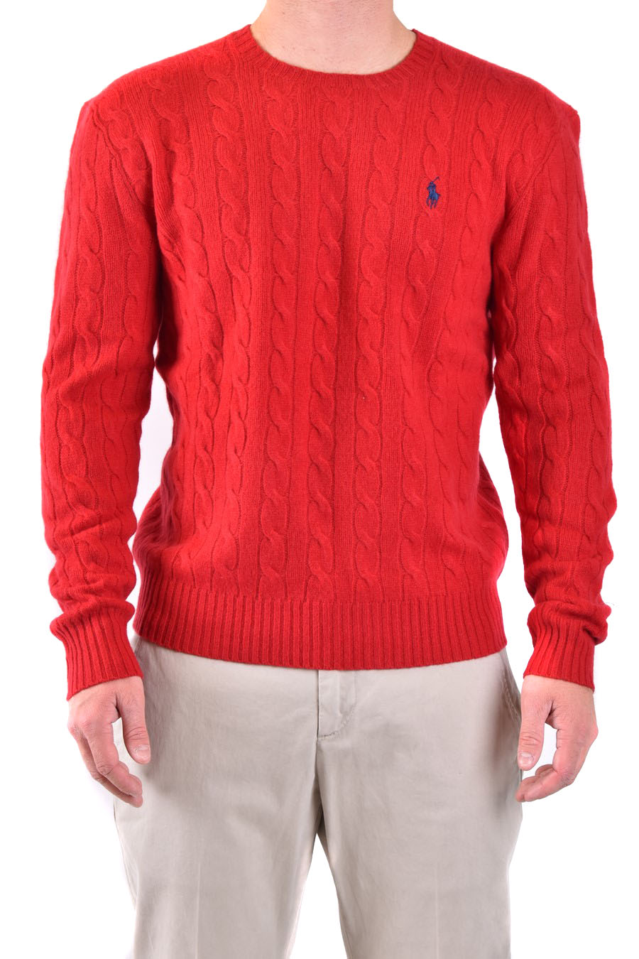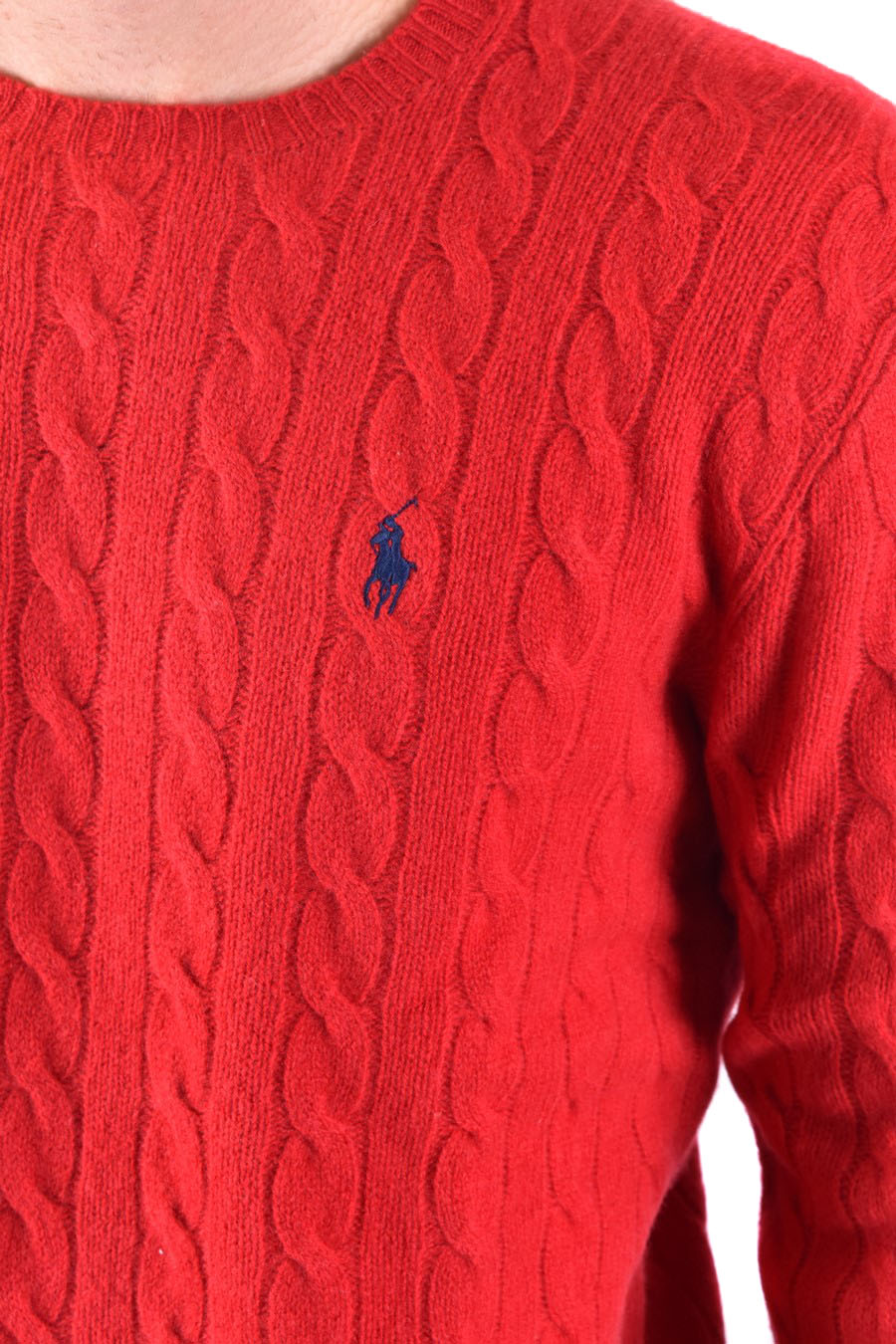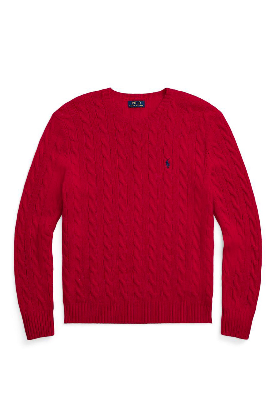 red cashmere blend cable sweater from Polo Ralph Lauren featuring crew neck, logo embroidered, ribbed cuffs and hem