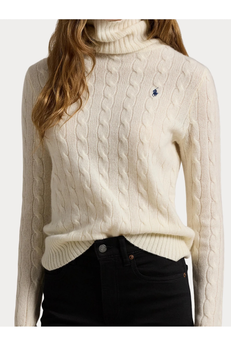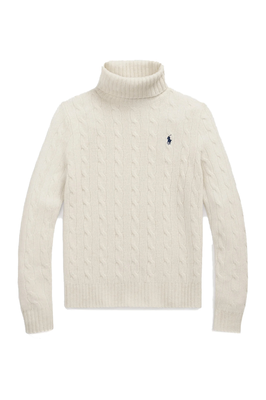 Cable knit, straight and slightly slim fit, ribbed turtleneck, long sleeves with ribbed cuffs, embroidered pony on the left chest.