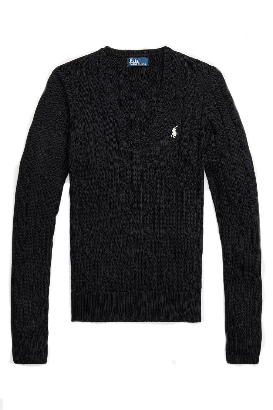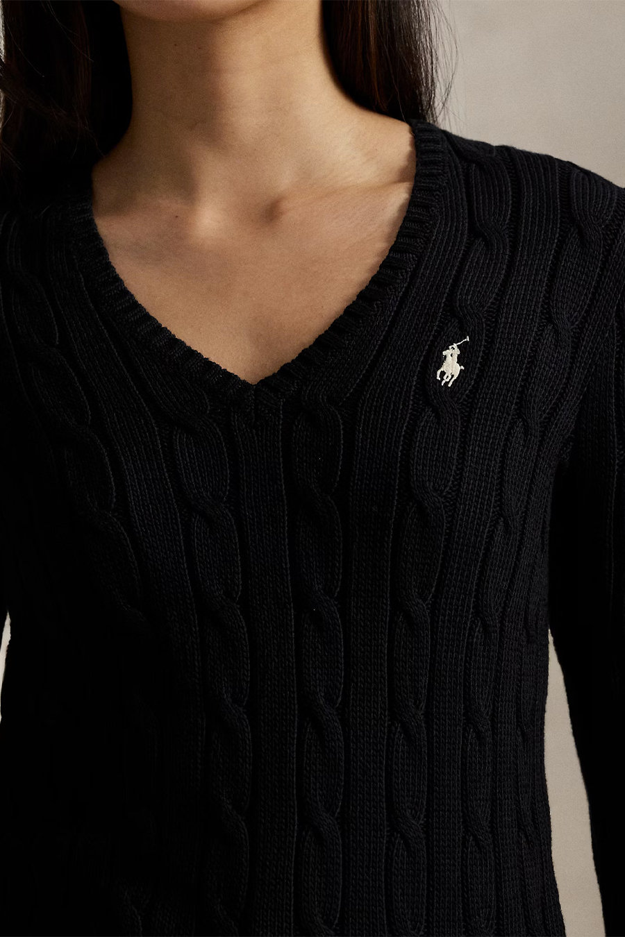 This Ralph Lauren polo shirt in soft combed cotton features a V-neck, cable knit detailing and a fitted silhouette with an embroidered pony on the left side of the chest.