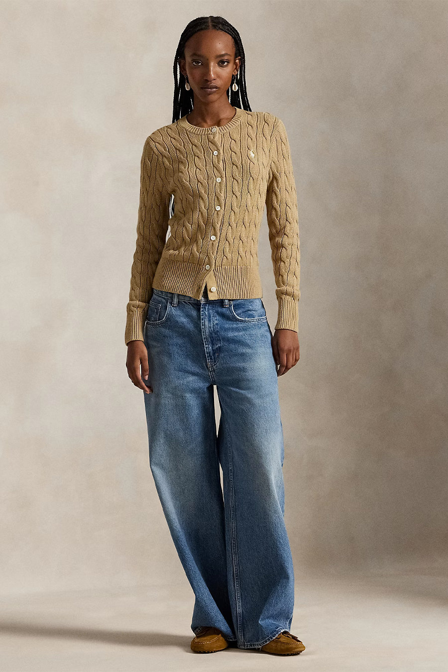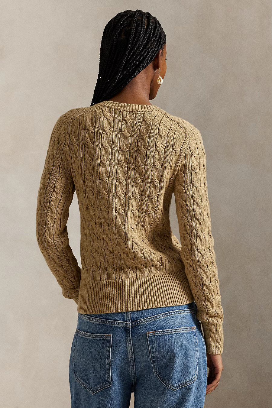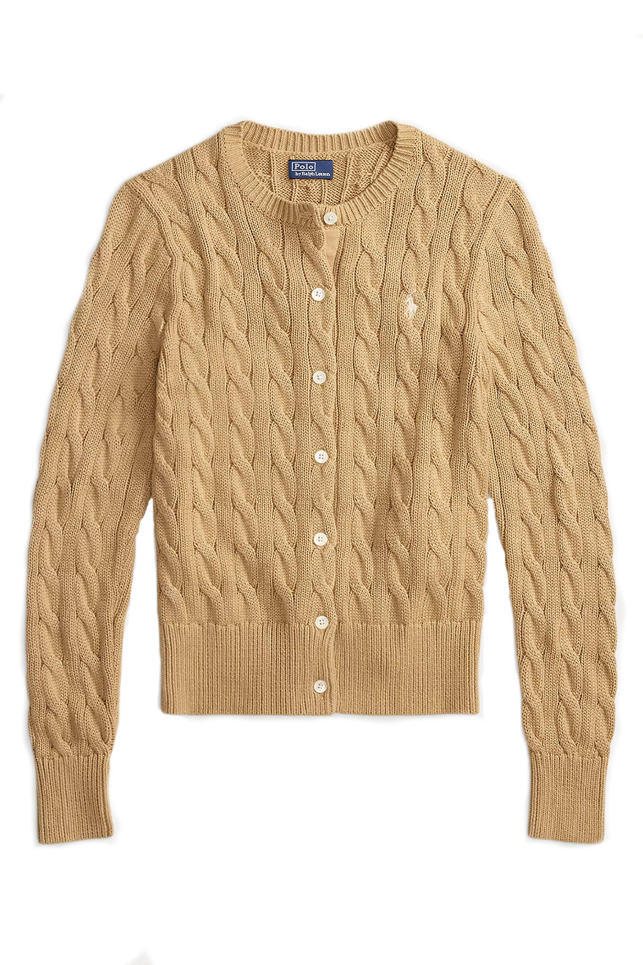 Polo Ralph Lauren crew neck cardigan, made from pure cotton with a classic cable knit, embroidered pony on the chest, button fastening and grosgrain trim, long sleeves with ribbed cuffs, ribbed hem.