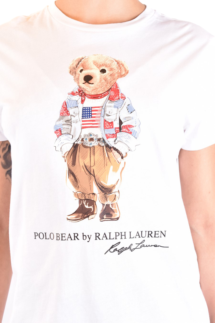 white t-shirt from Ralph Lauren featuring round neck, short sleeves, multicolor teddy bear at the front, straight hem.