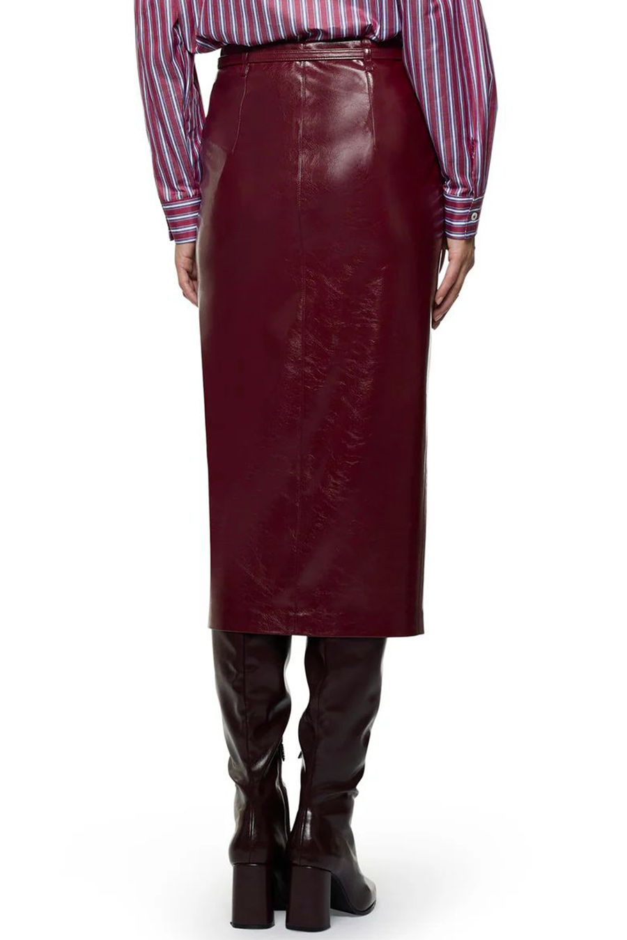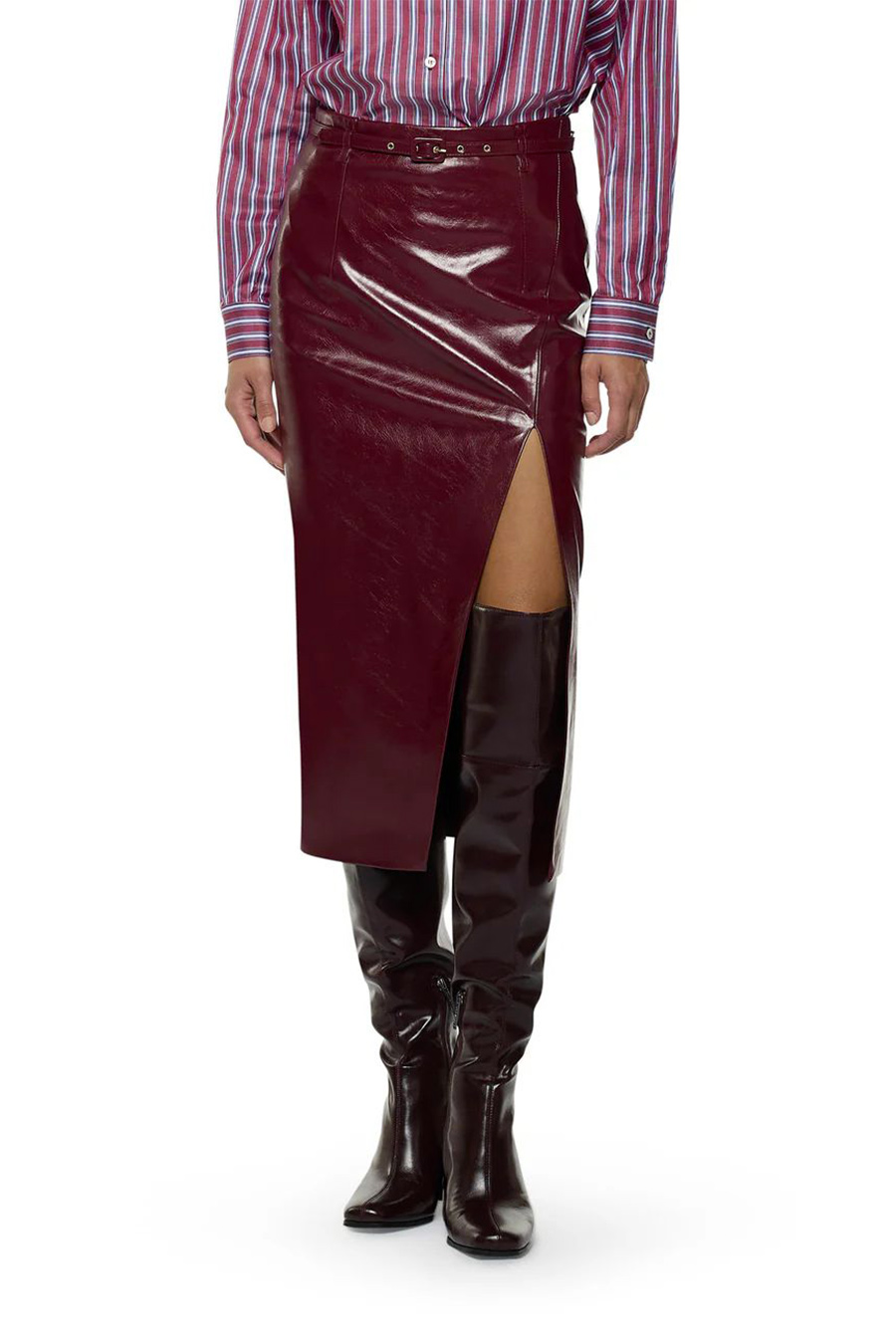 Simona Corsellini pencil skirt with shiny faux leather belt, deep diagonal slit at the front, zip fastening at the side.