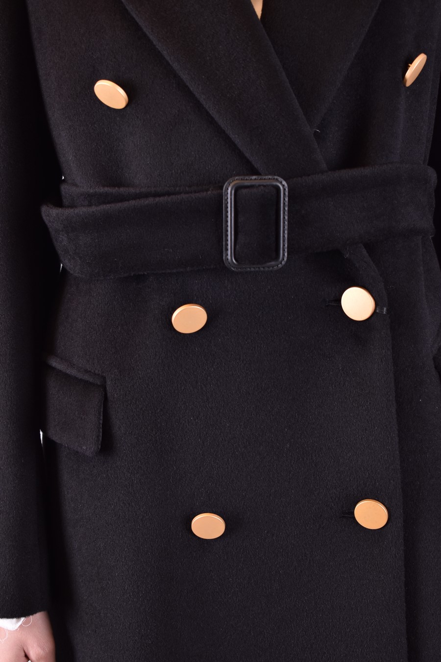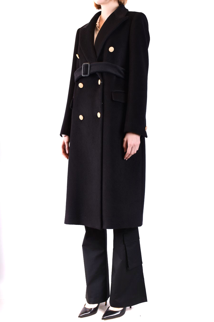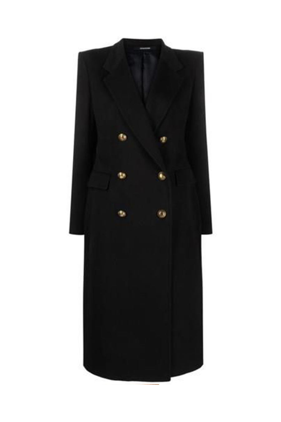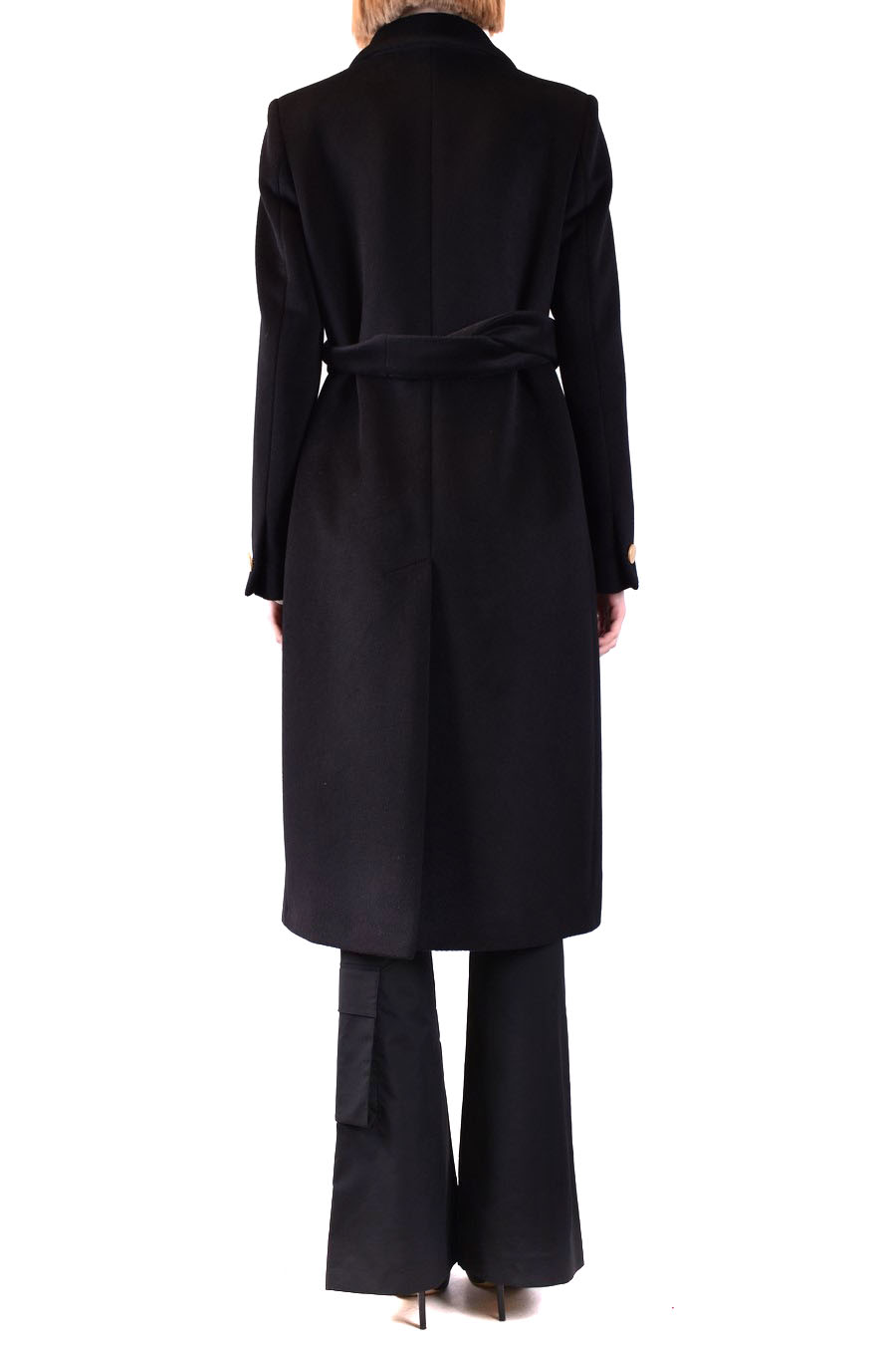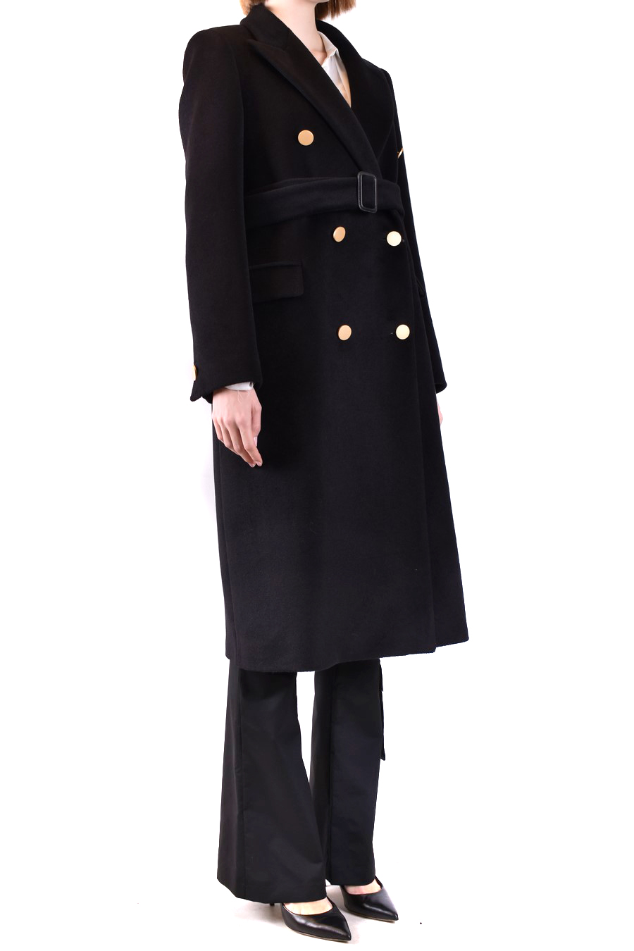 black wool blend coat from Tagliatore featuring v-neck, doubled-breasted one button closure, front flap pockets, knee lenght, straight hem