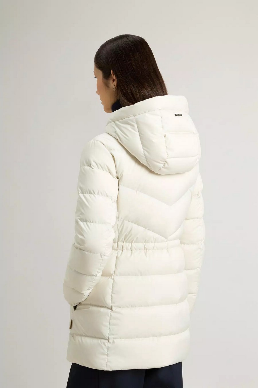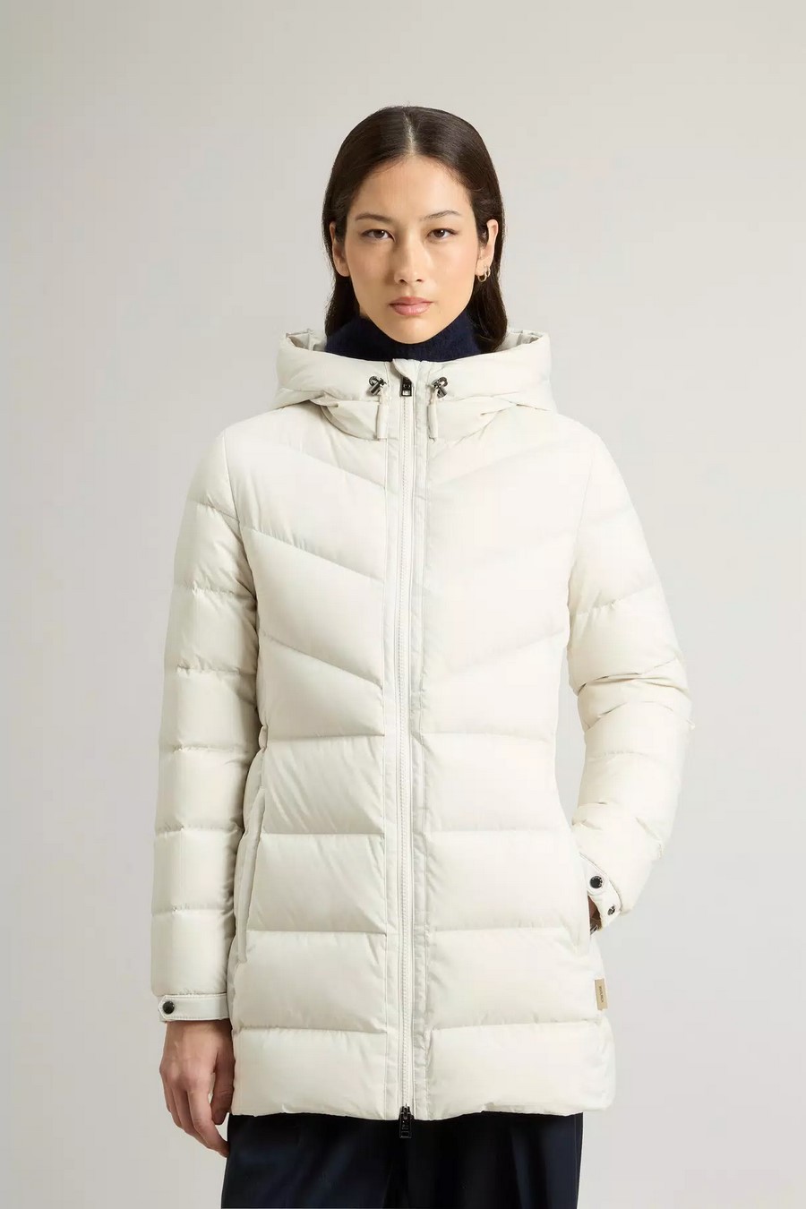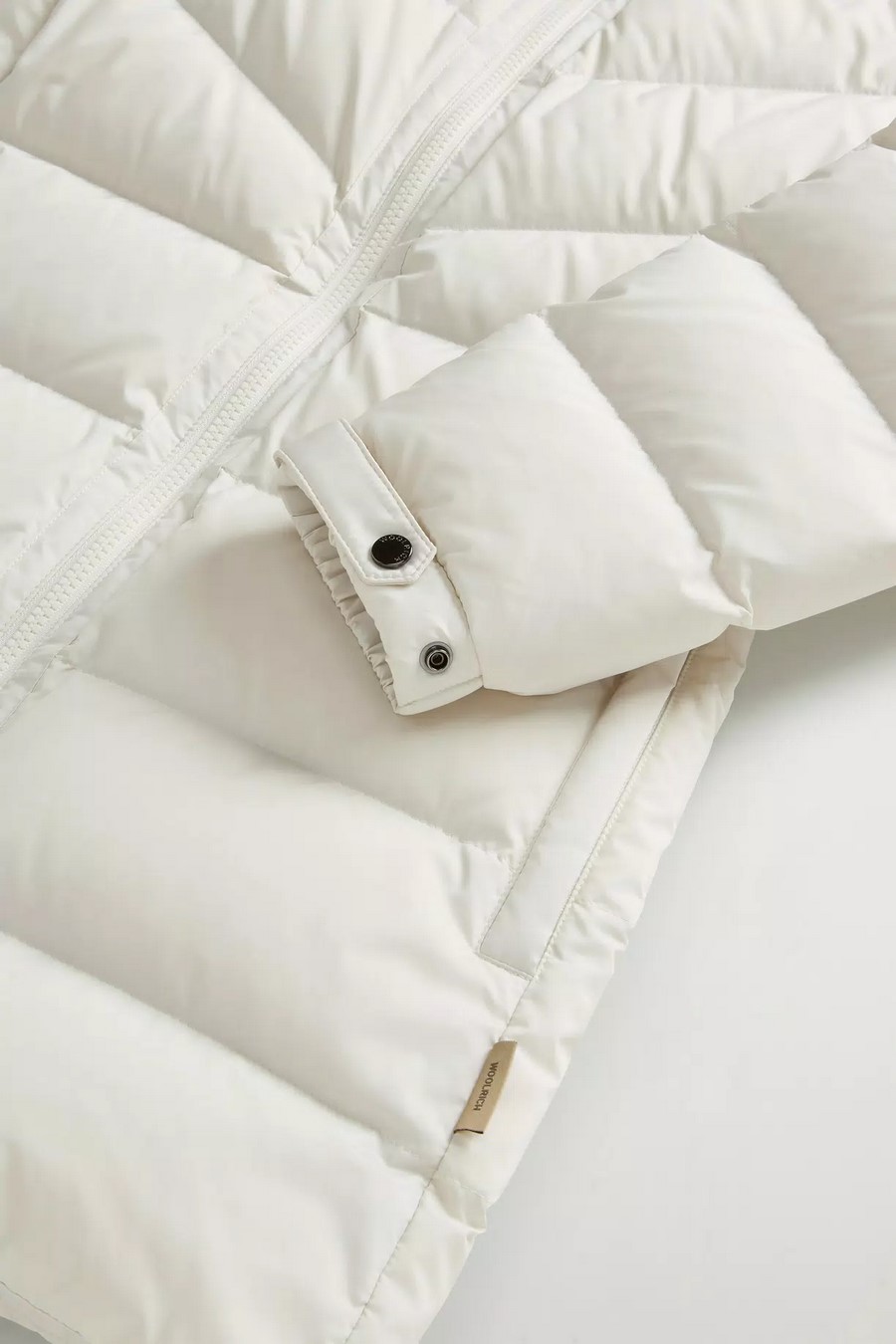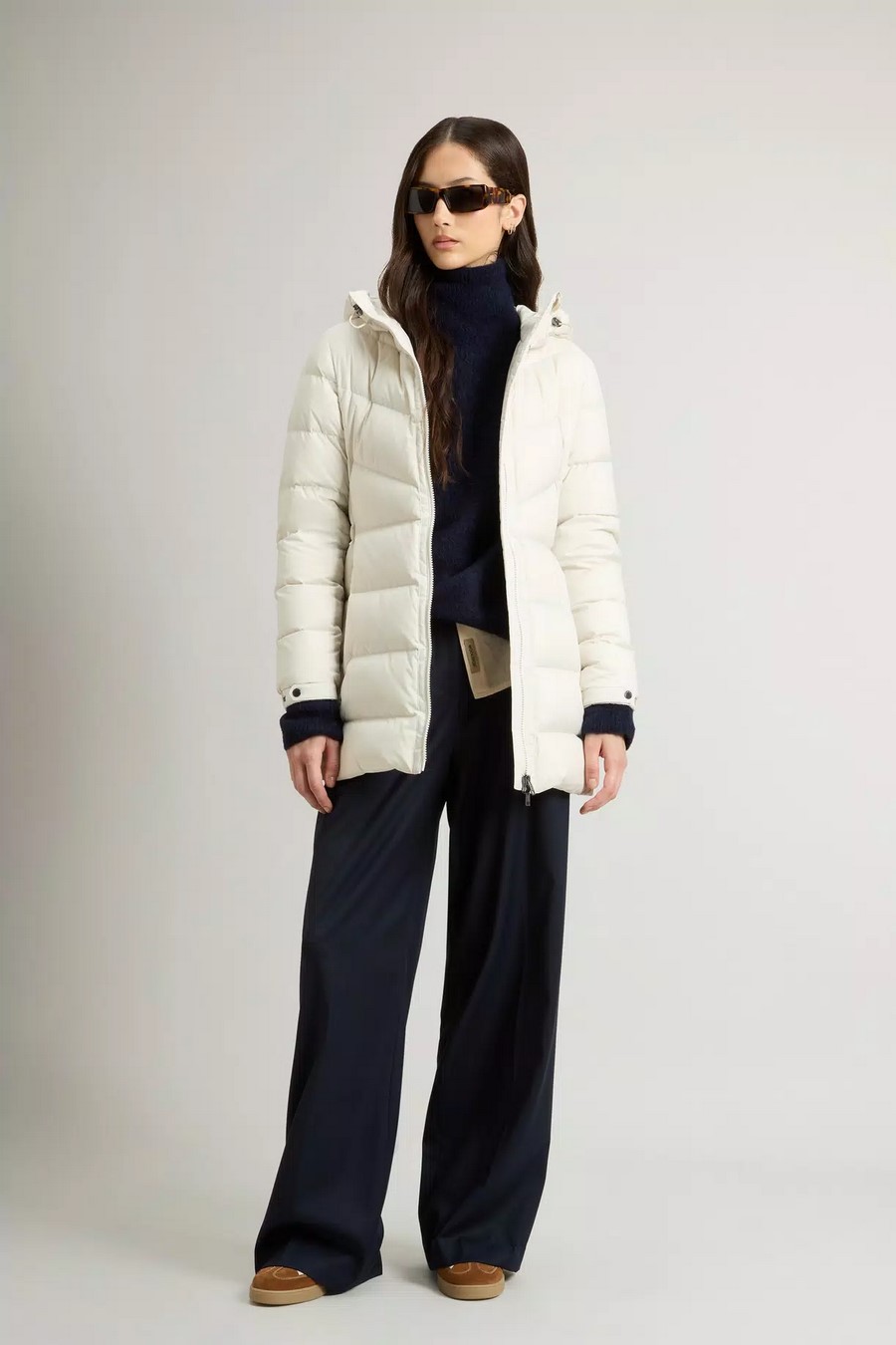 Shirley Woolrich down jacket made from water-repellent microfibre, duck down padding, two-way zip fastening and a hood finished with a logo tag.