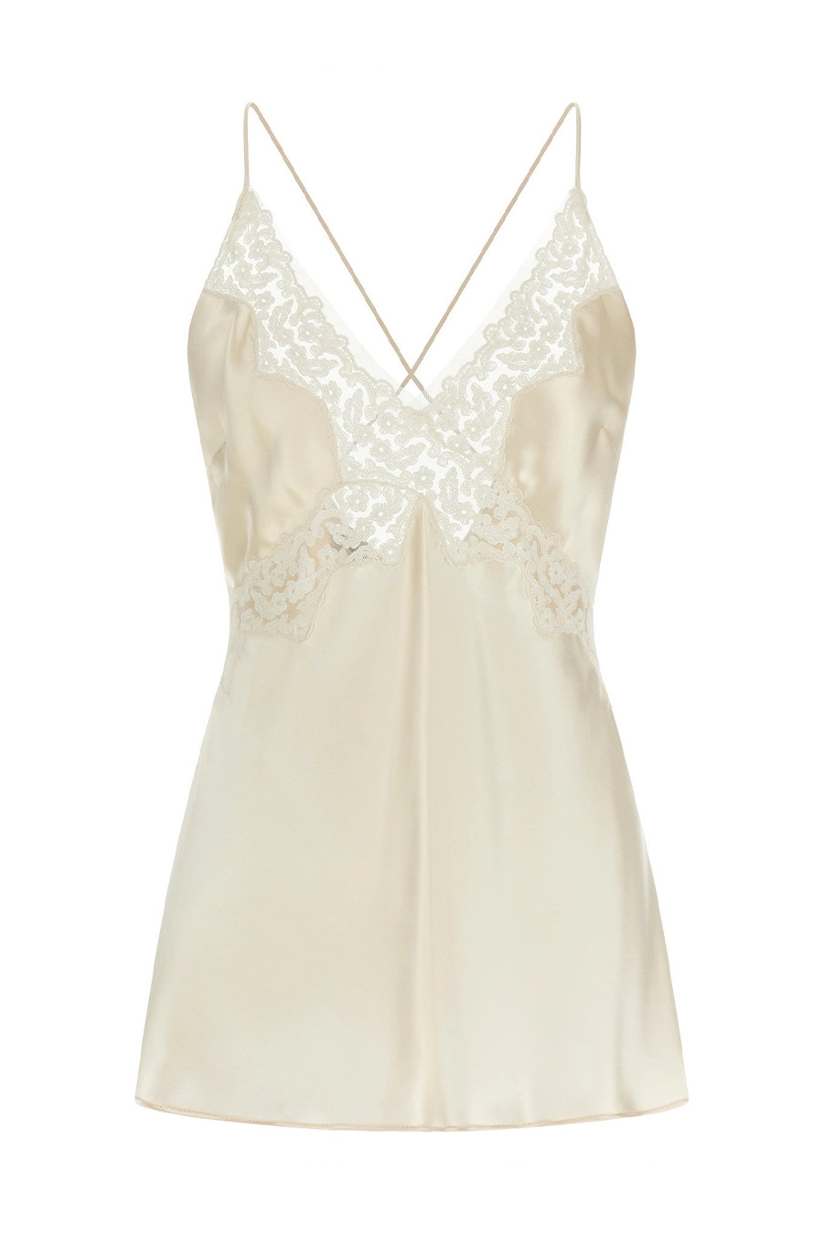 Alberta Ferretti satin top with tone-on-tone lace inserts, hourglass silhouette, thin straps crossed at the back, V-neckline, rear zip fastening.