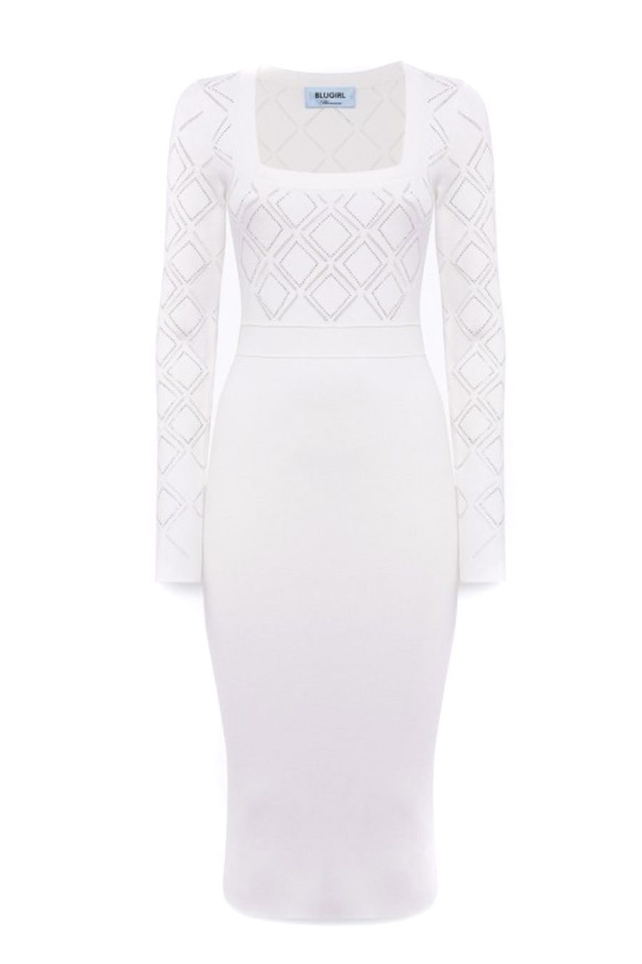Blugirl fitted knit dress with rhinestones featuring a punched effect that creates a diamond pattern illuminated by heat-activated rhinestones, fitted waist, square neckline and midi length.
