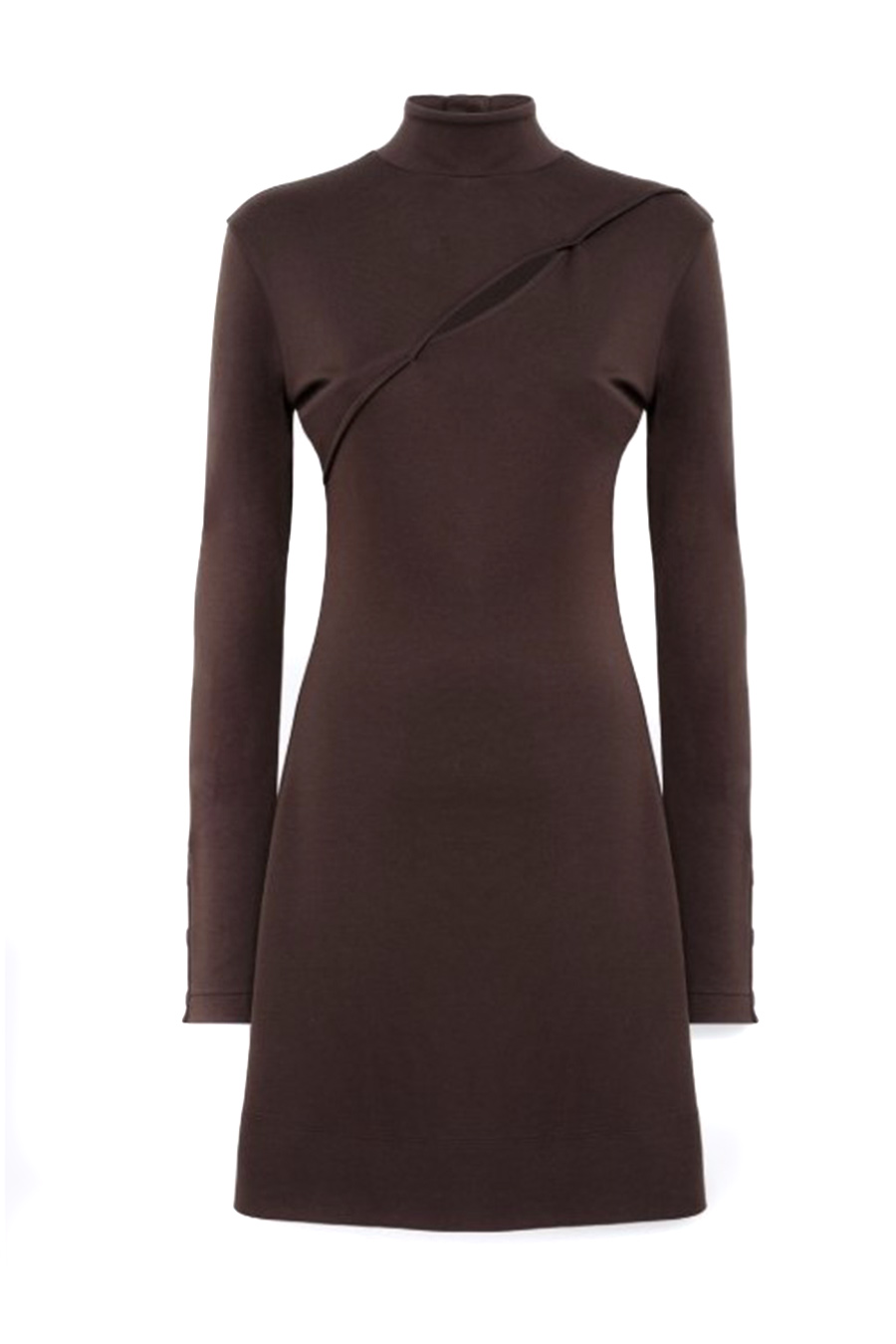 Blugirl jersey dress with high neck and slanted cut-out, long sleeves with covered buttons at the cuffs, opening and covered buttons at the back, flared silhouette.