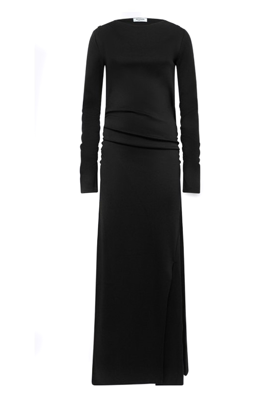 Abito Blugirl long dress in viscose jersey with ruffles on the shoulders and hips, round neckline, shoulders with covered buttons, long glove sleeves, side slit at the bottom.
