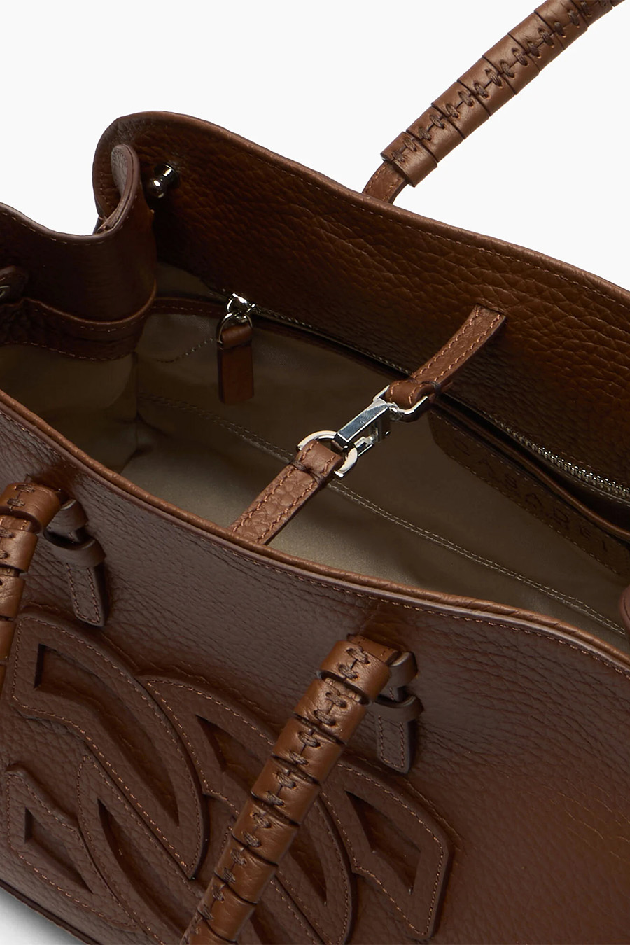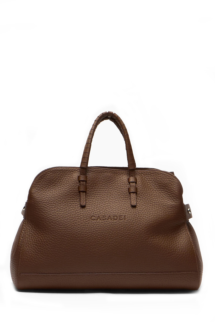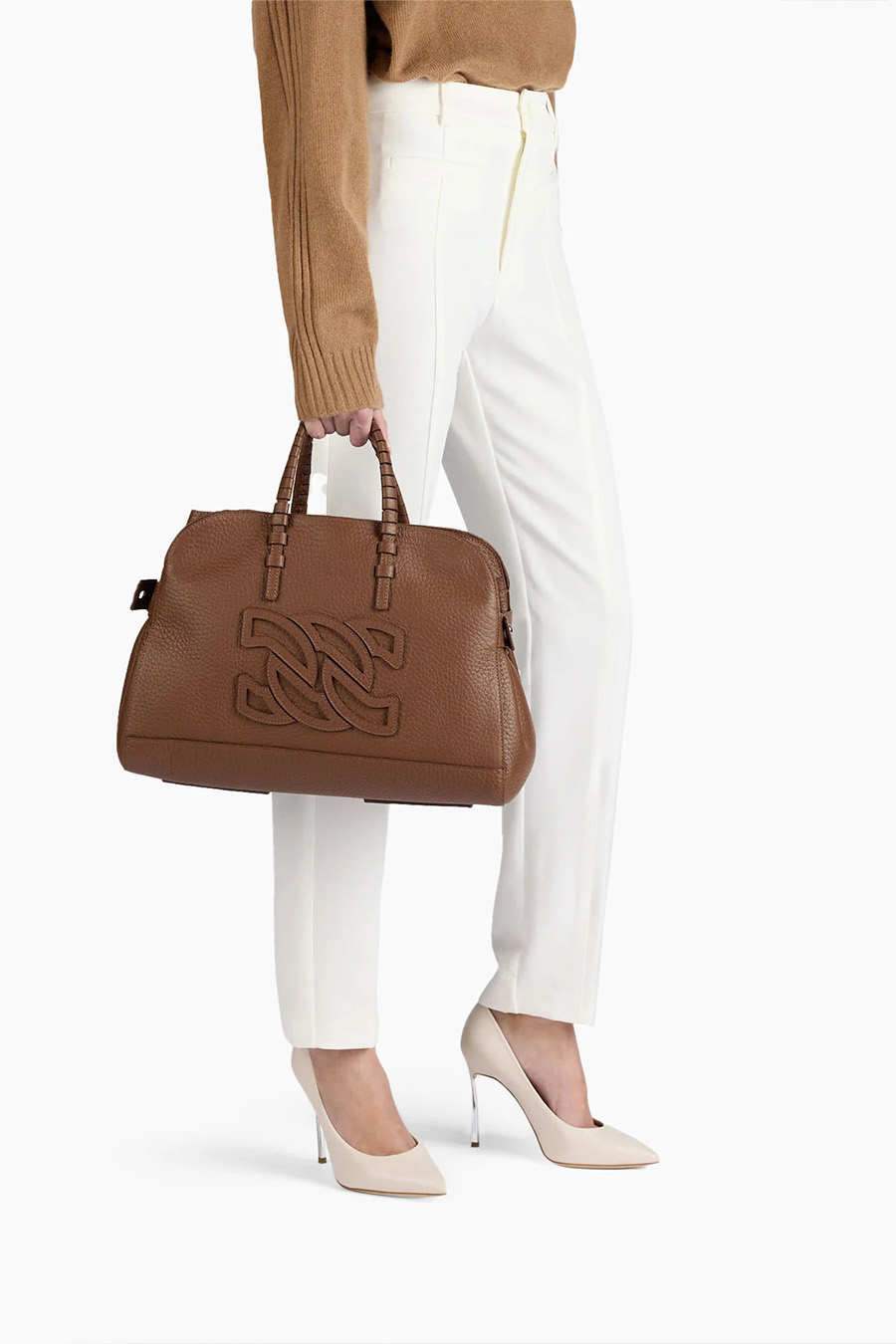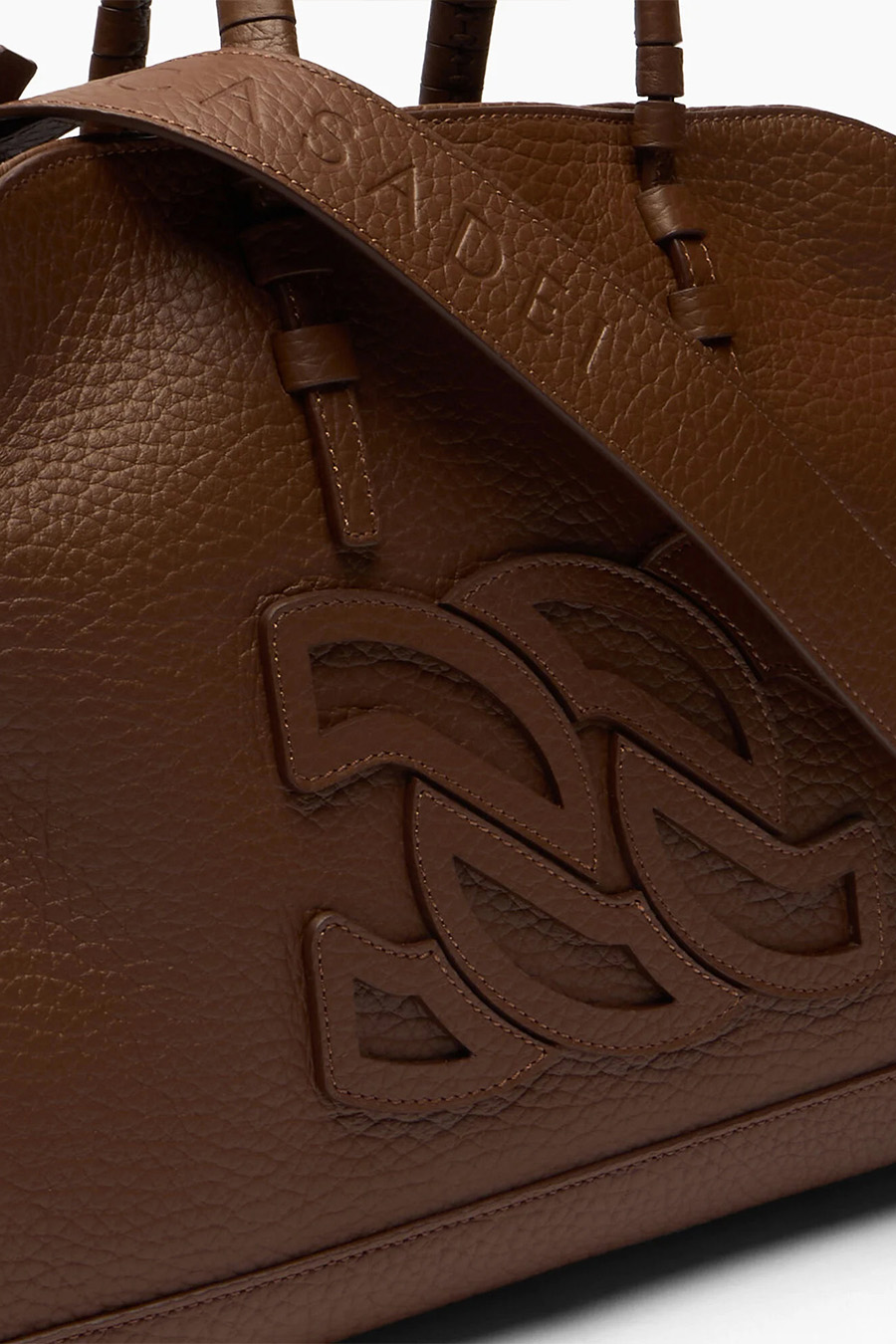 Casadei Park Avenue Mini Bag crafted from fine cocoa-coloured hammered leather, it can be carried by hand or worn over the shoulder, with the iconic C-Chain logo standing out in the centre.