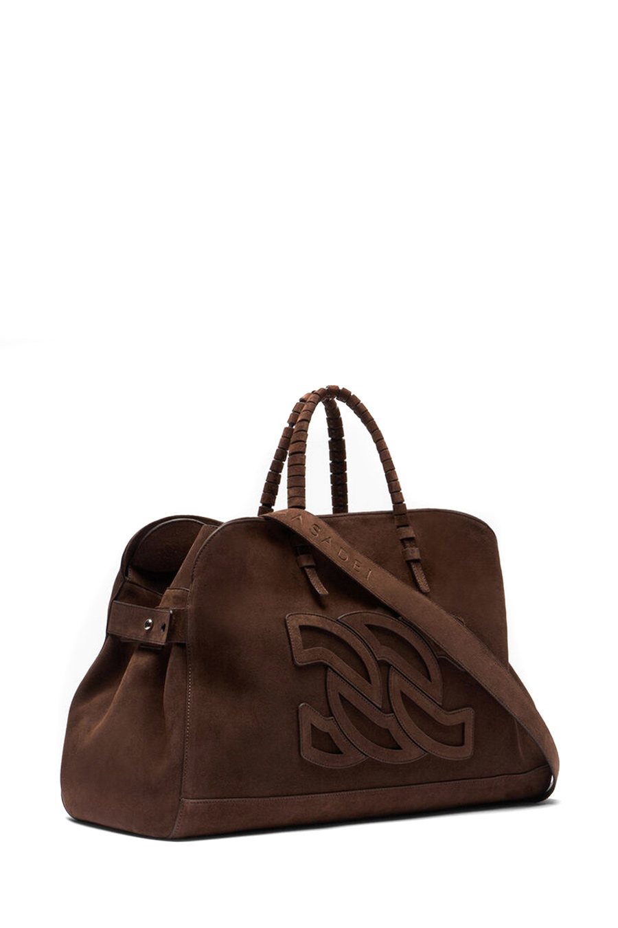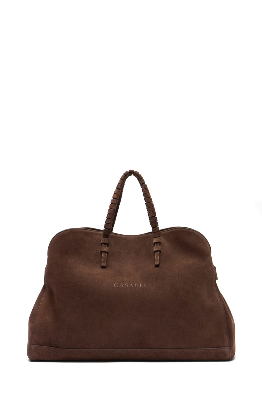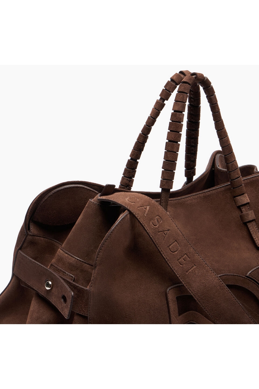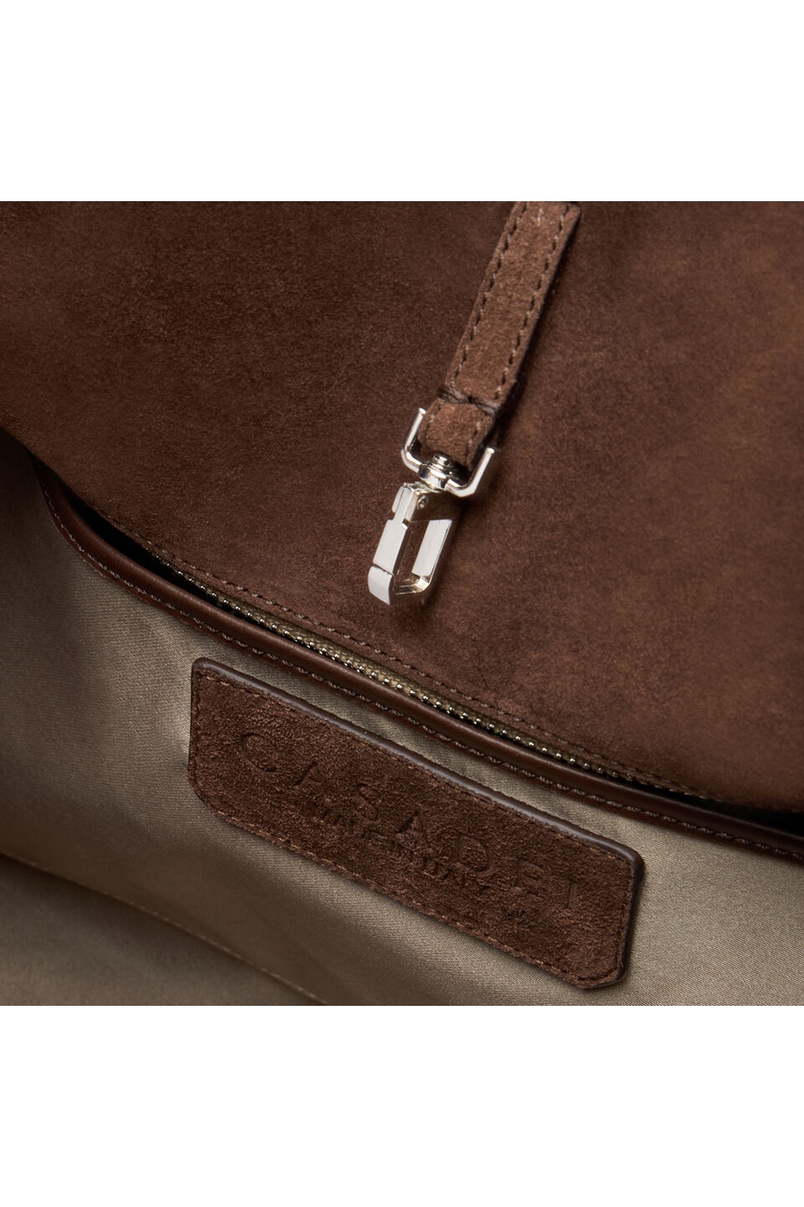 Park Avenue Velour Bag by Casadei, crafted from fine cocoa-coloured suede calfskin, this versatile bag can be carried by hand or worn over the shoulder. The iconic C-chain logo stands out elegantly in the centre of the bag.