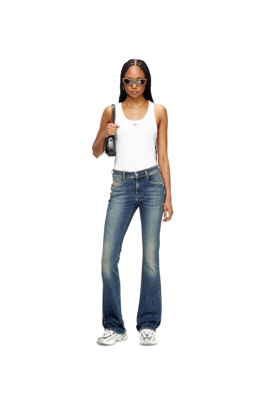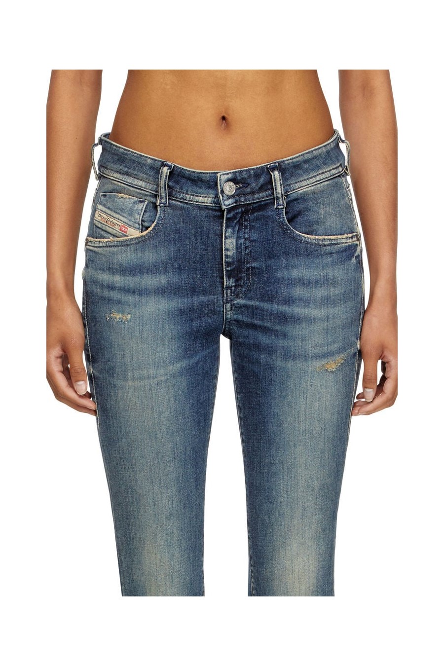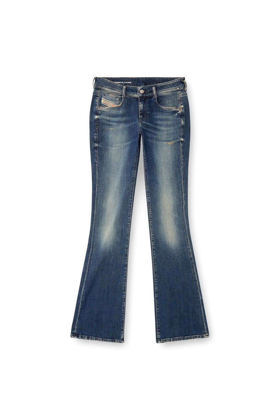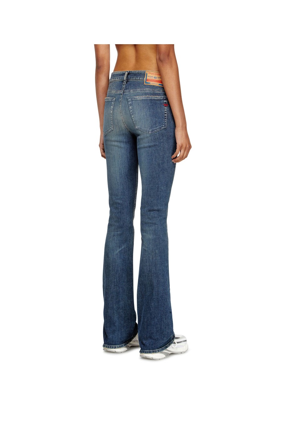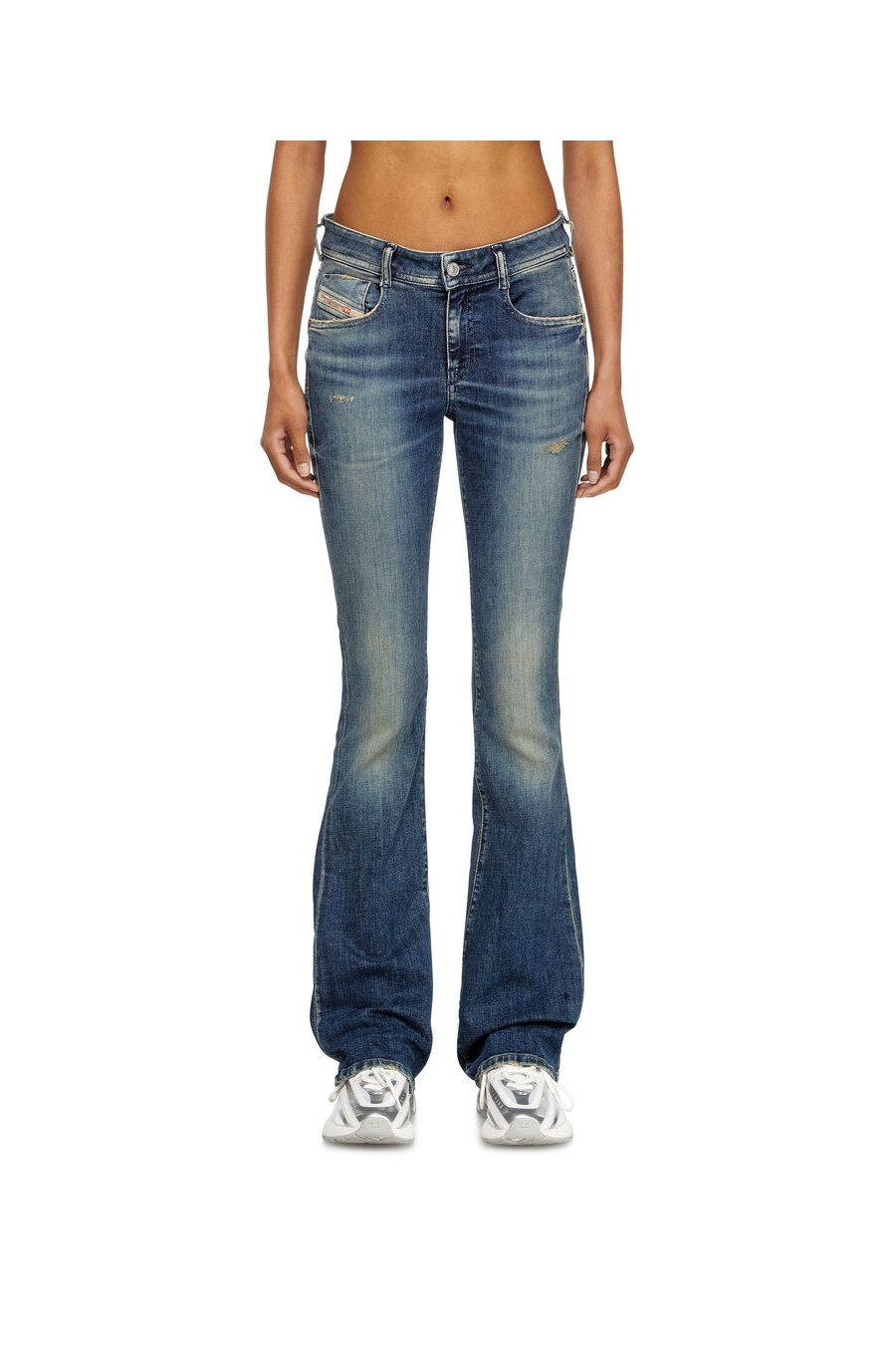 1969 d-ebbey 09l96 Diesel bootcut jeans, low-rise waist and slim leg, dark blue wash with small abrasions and contrasting whiskers that add depth to the look.