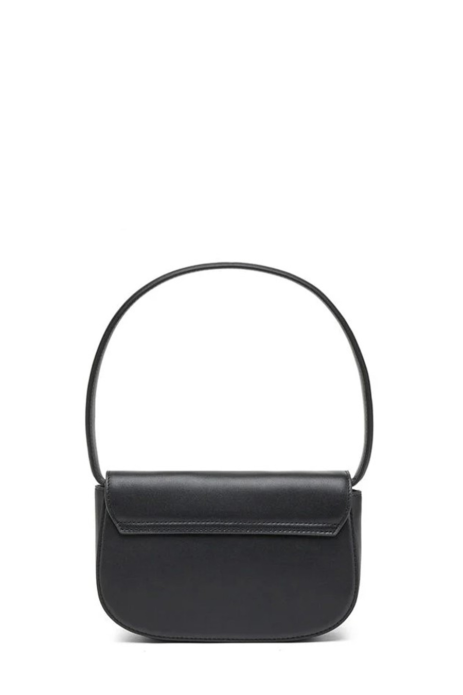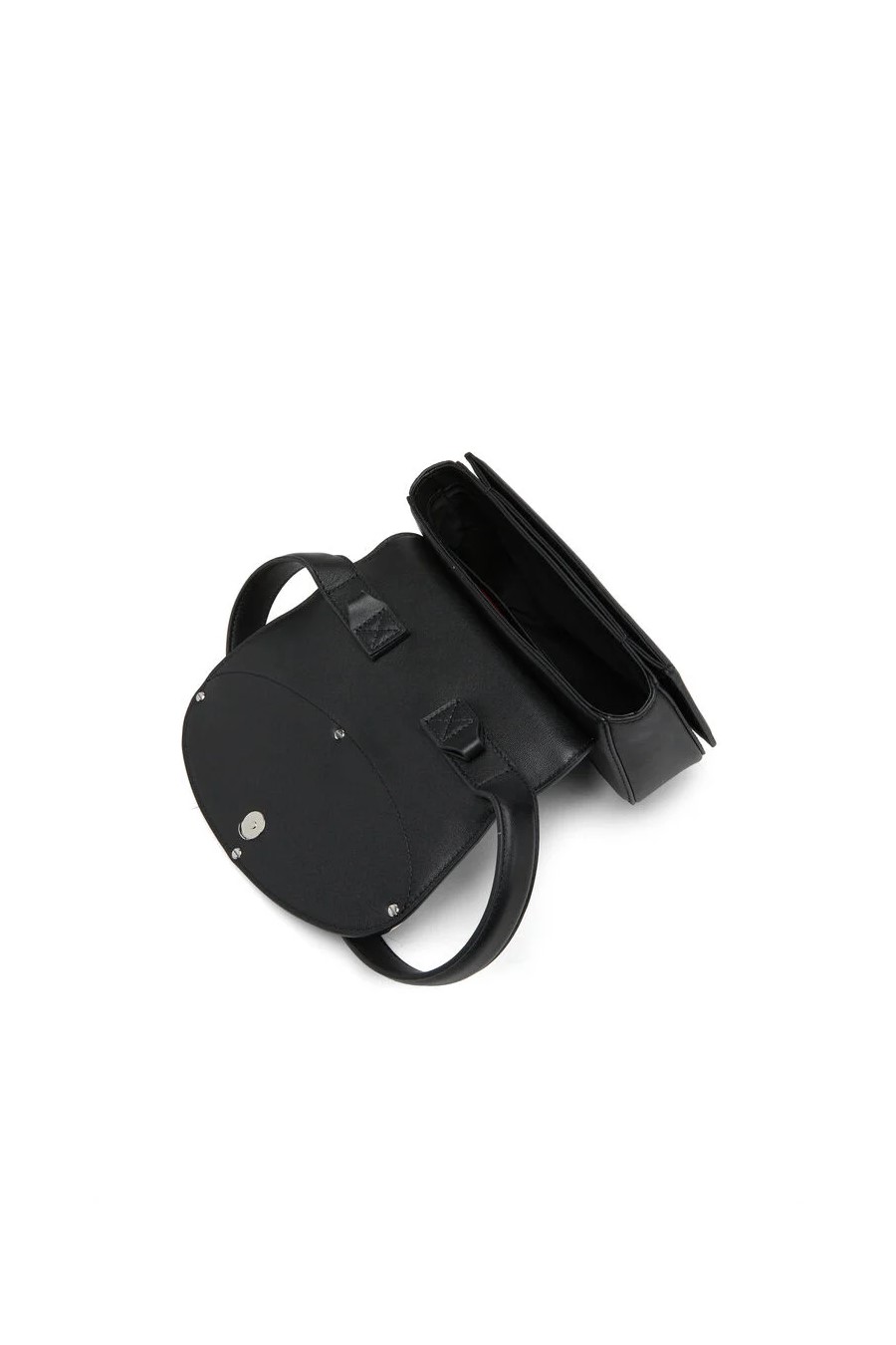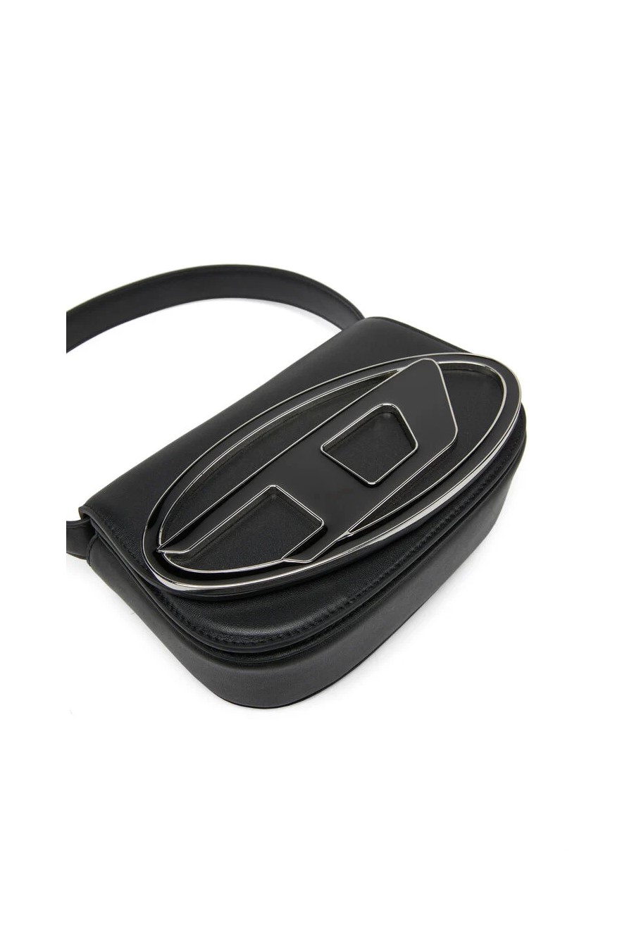 This structured Diesel bag in nappa leather can be carried by hand, over the shoulder, or cross-body thanks to its handle and removable shoulder strap. The flap is decorated with an enameled metal plaque featuring the new oval "D" logo.