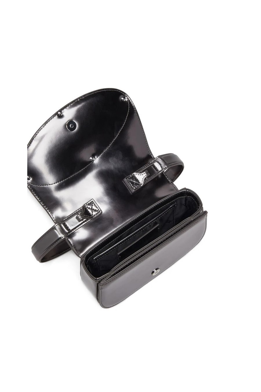 The galvanised “oval D” tag on the flap matches the shiny mirrored leather body.