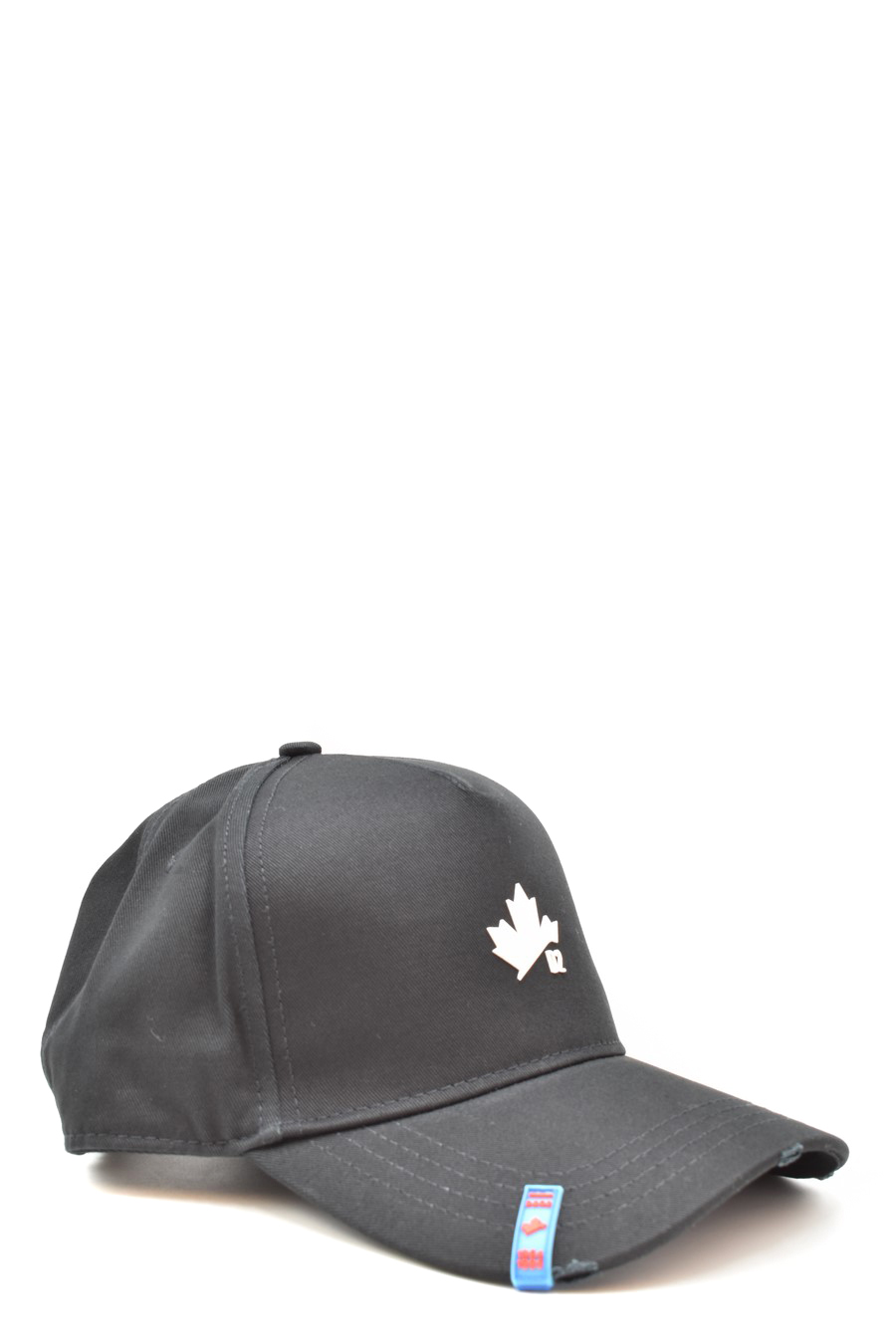 black cotton baseball hat from Dsquared2 featuring curved peak distressed effect, malpe leaf prin to the front, embroidered logo to the rear, adjustable fit