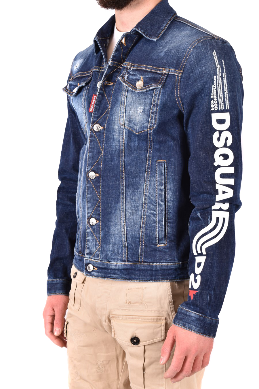 blue denim jacket from Dsquared2 featuring classic collar, chest flap pockets, front button fastening, long sleeves, side slit pockets, logo print at the sleevesì