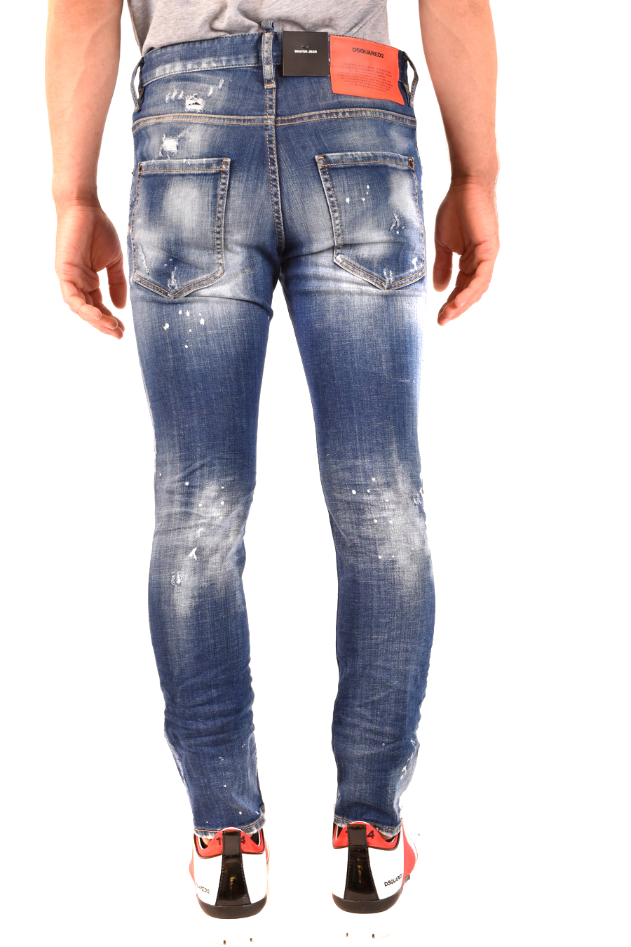 blue cotton blend jeans from Dsquared2 featuring loops belt, five pockets as design, mid rise, front button fastening, ripped detailing, paint splash detailing