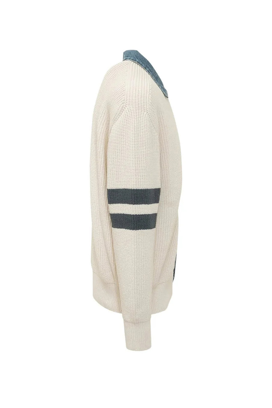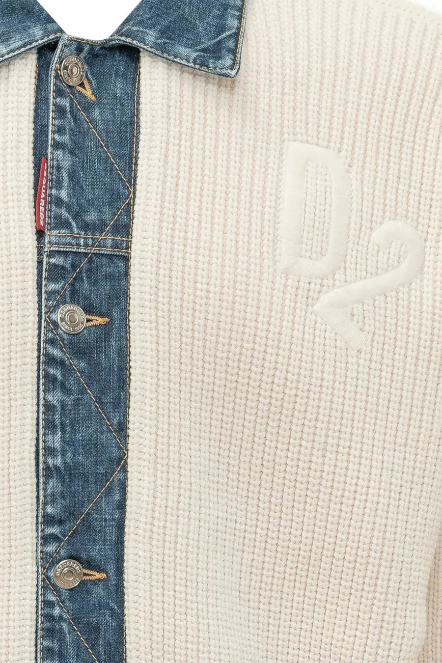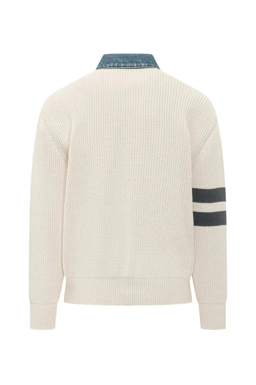 The Dsquared2 D2 Denim Mix Knitted Cardigan features a striking white colour adorned with elegant blue stripes.