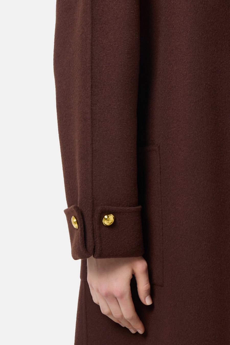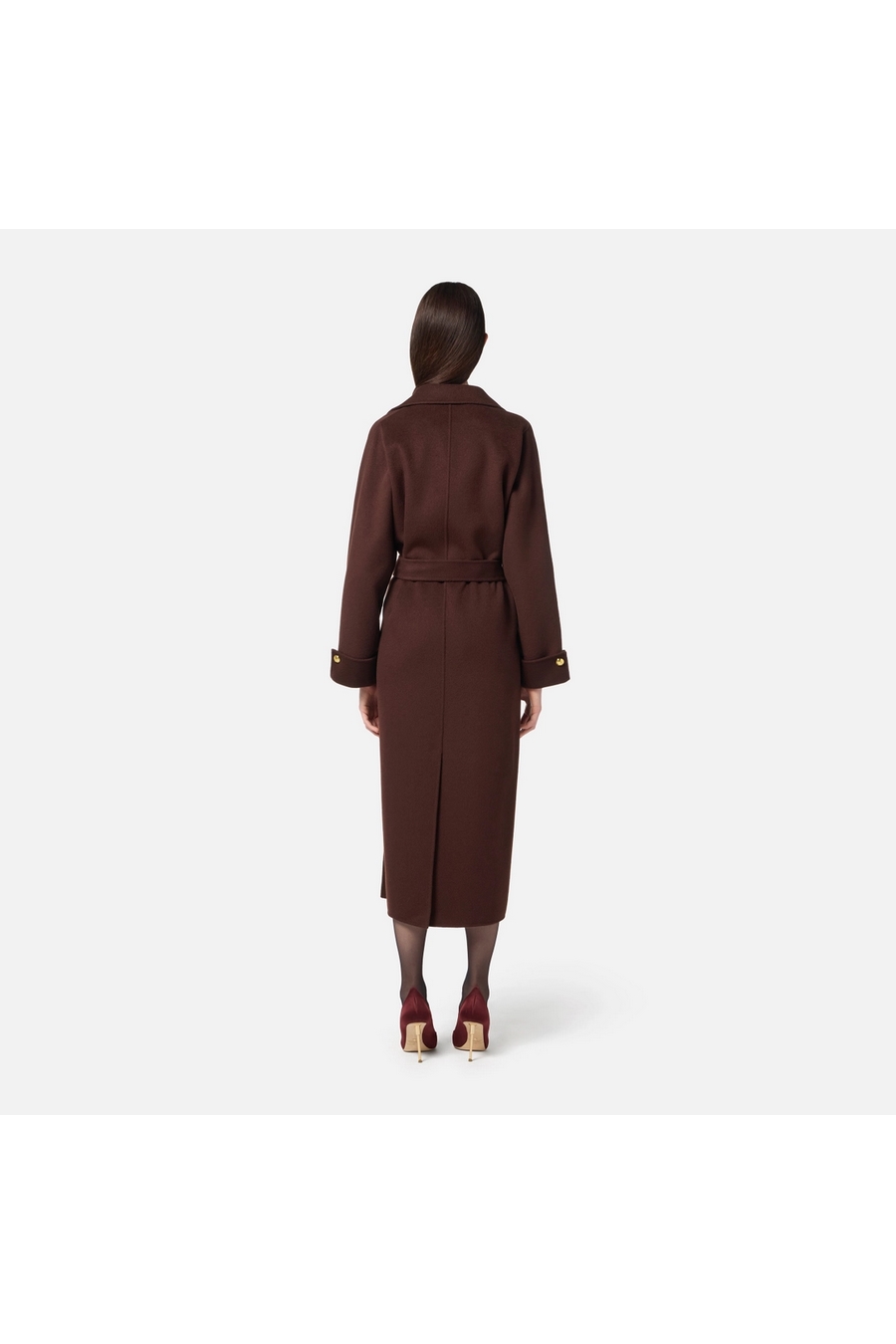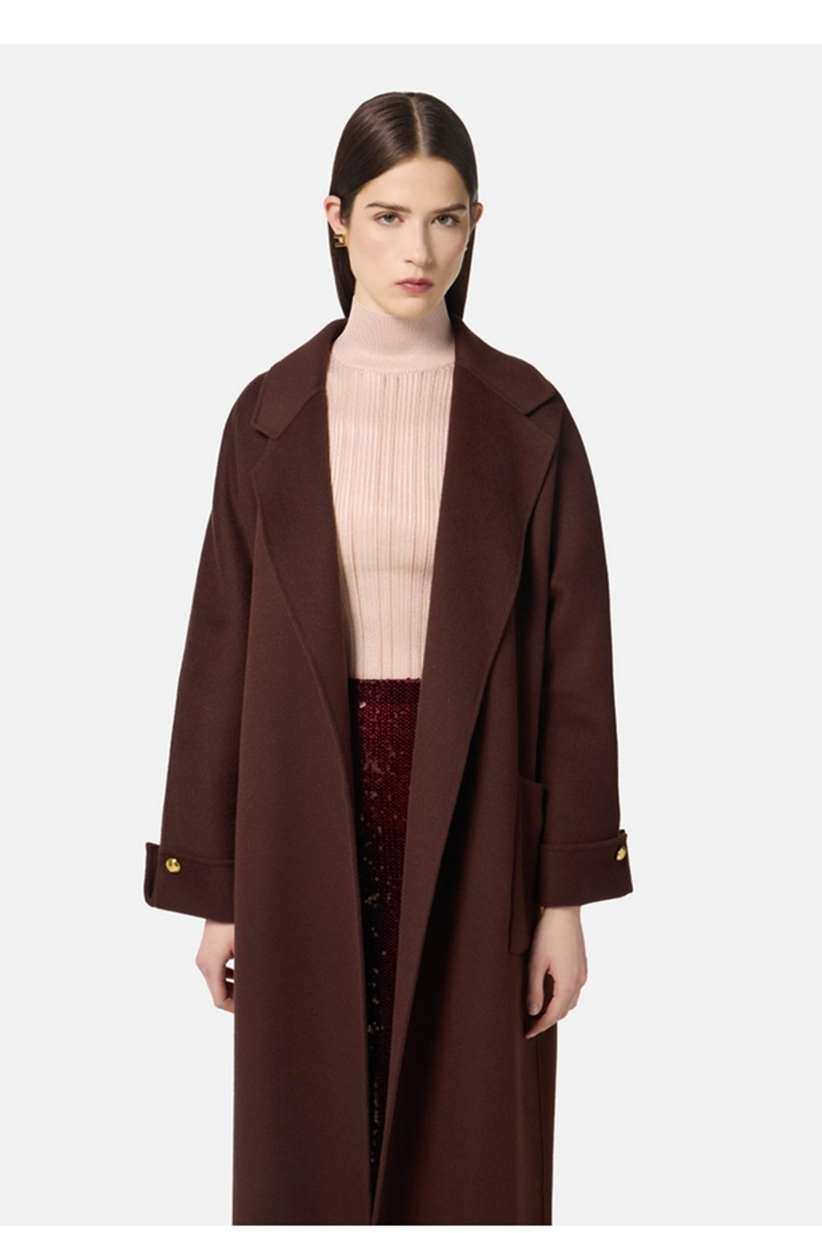 Elisabetta Franchi double wool blend robe coat, unlined and oversized fit, with lapels, cuffed sleeves, and patch pockets, belt closure to softly define the waist. The logo label and gold metal buttons on the cuffs add a touch of sparkle.