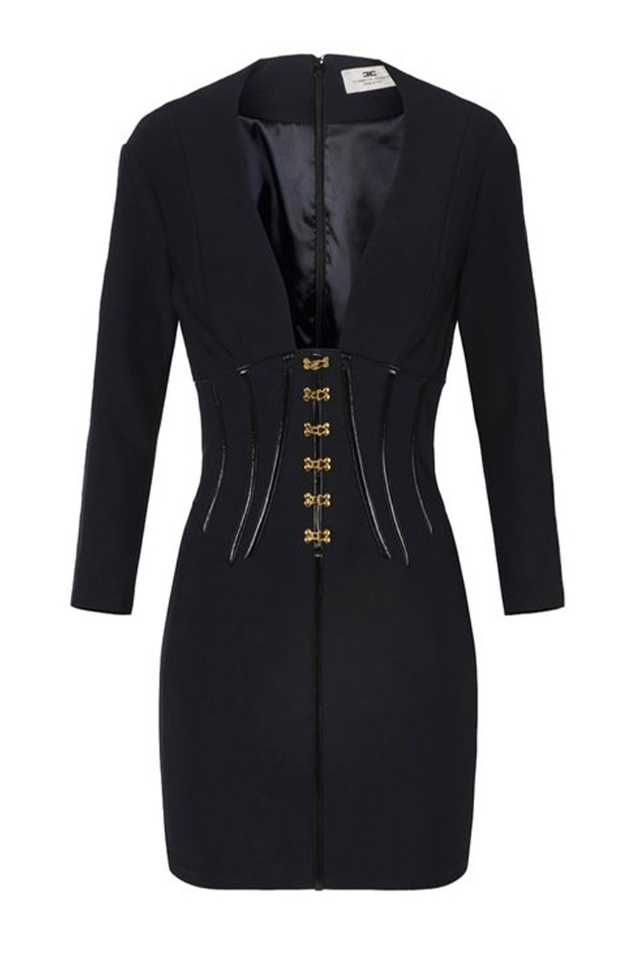 Elisabetta Franchi neoprene dress with corset details, sleeves with slits at the bottom and distinctive references to the world of corsetry, embellished with gold metal hooks on the front.