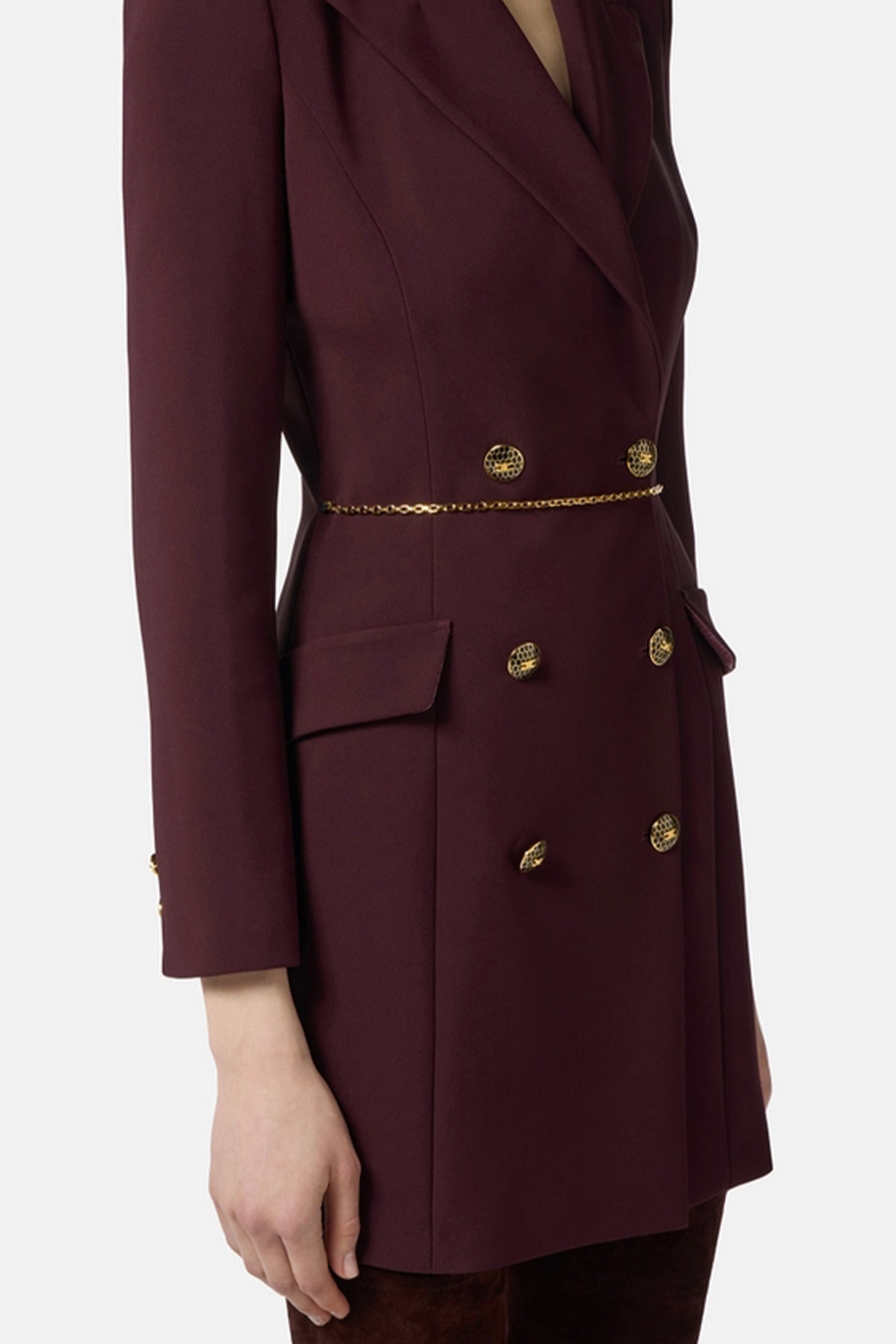 Lightweight crêpe dress with Elisabetta Franchi jewelled chain, structured shoulders, peak lapels with double-breasted button fastening, applied flaps.