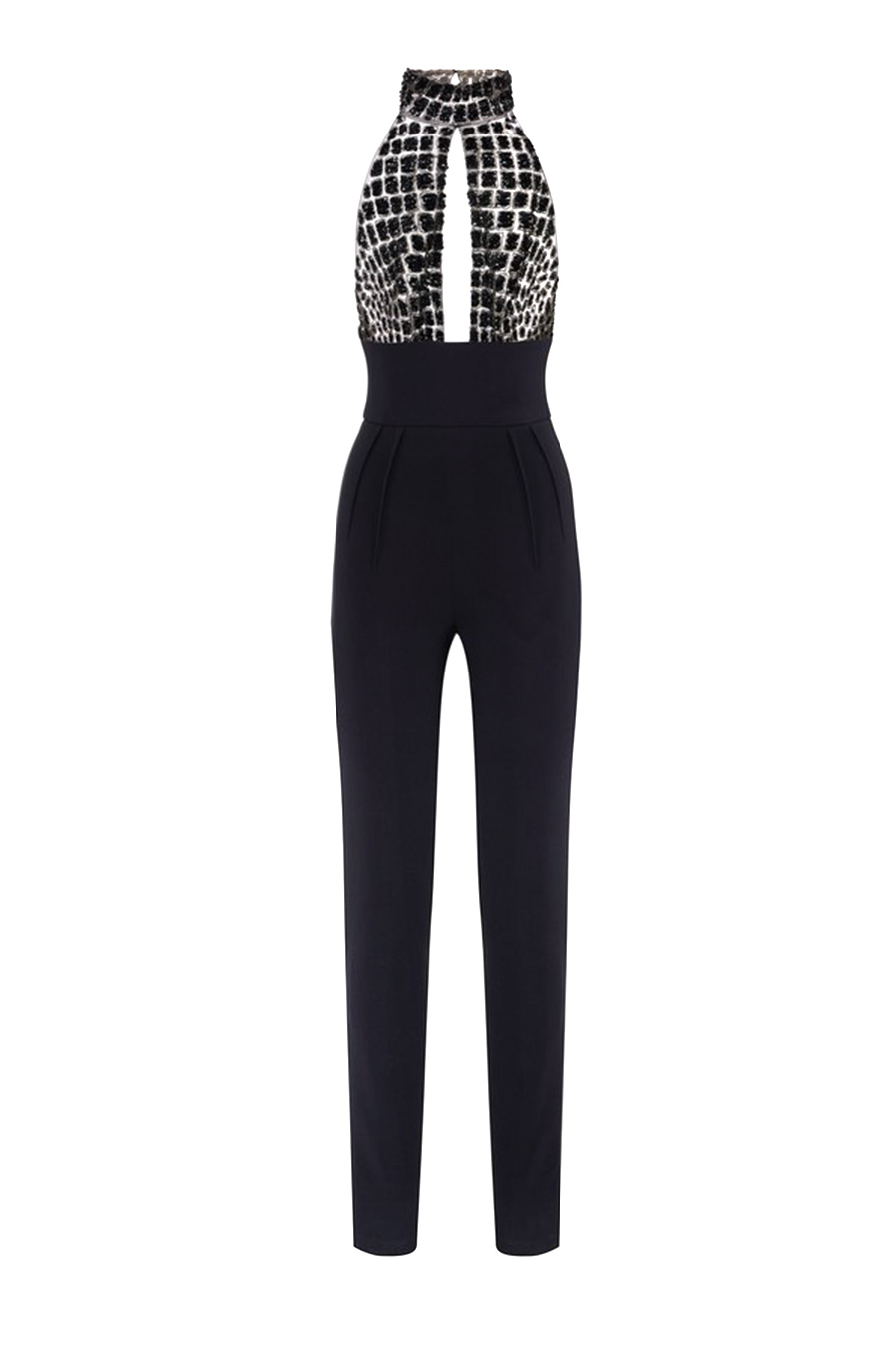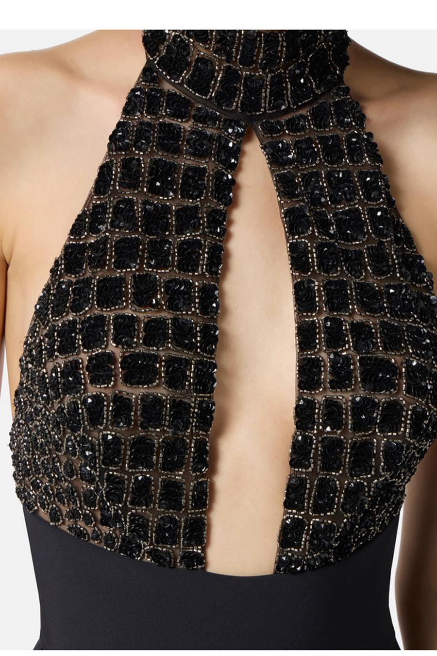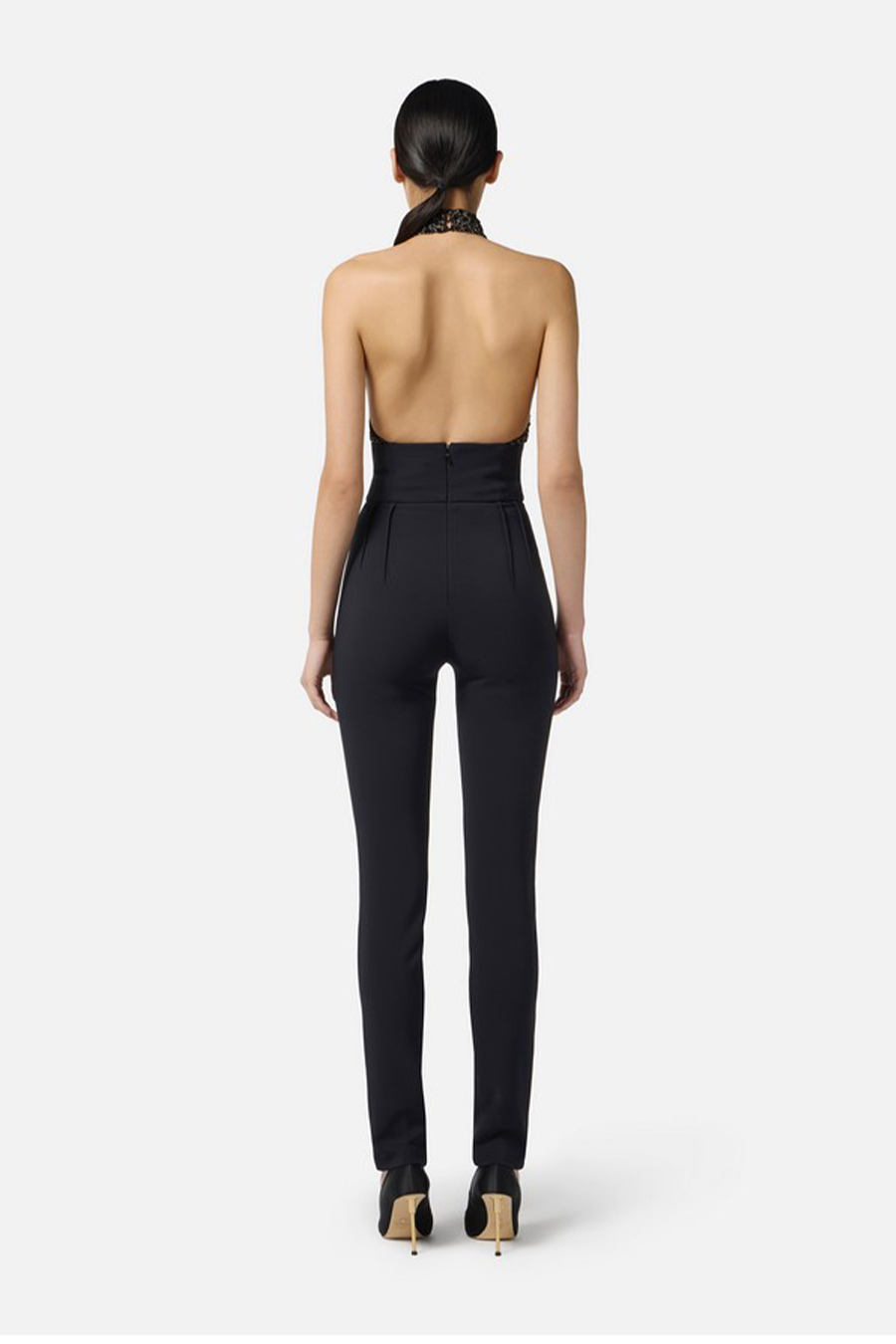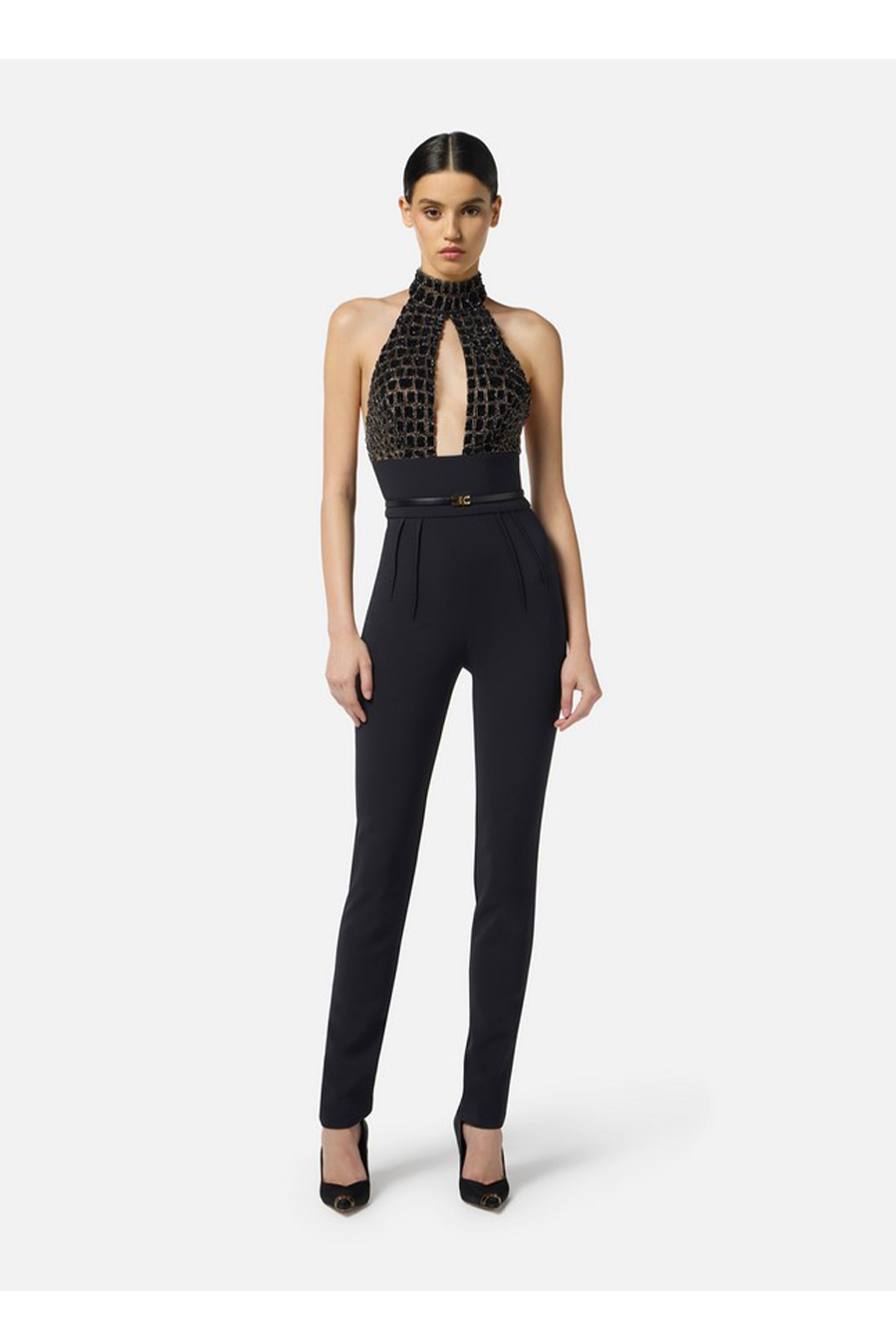 Elisabetta Franchi tulle and crepe jumpsuit with coconut embroidery, featuring a fitted fit and a halterneck. The top is made of tulle and is embellished with bright coconut-design embroidery. The crepe trousers have a high waist with ribbing.